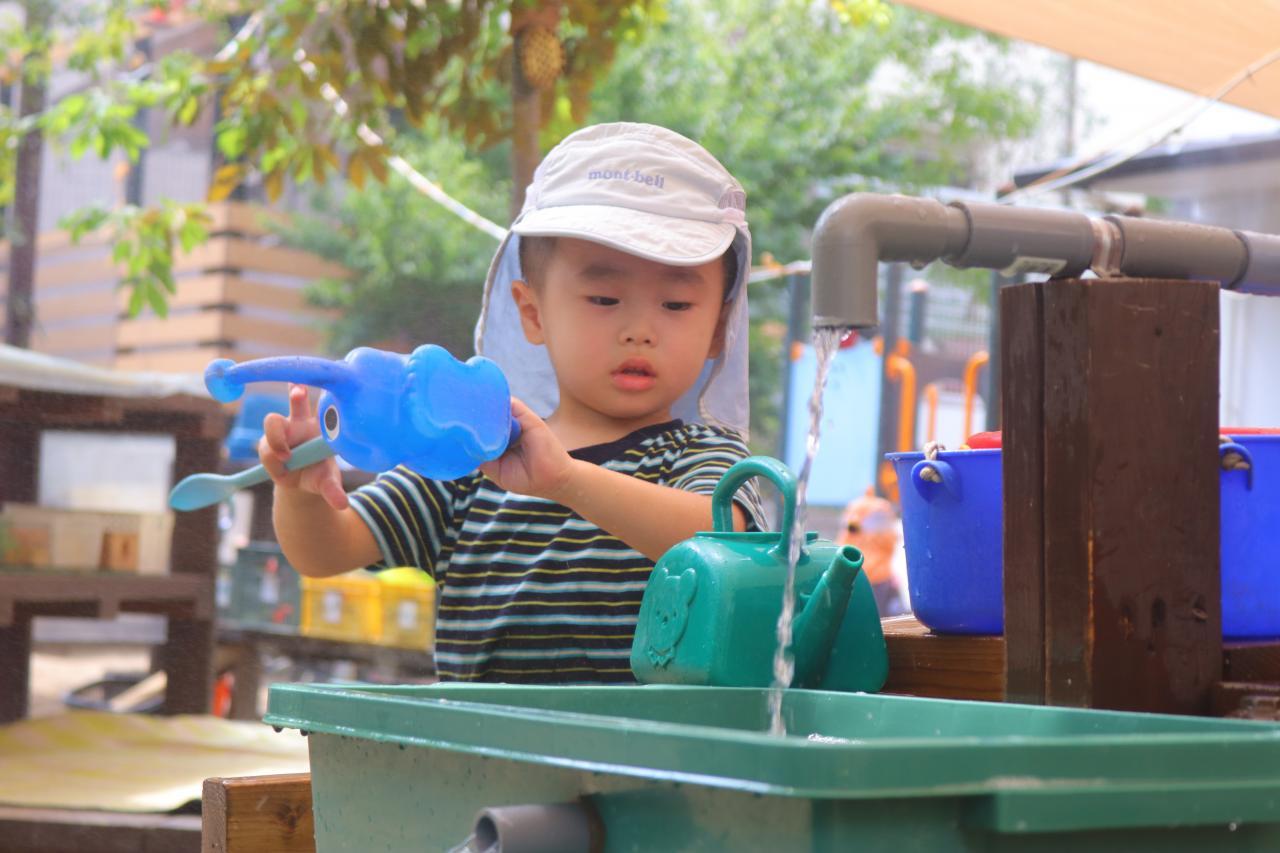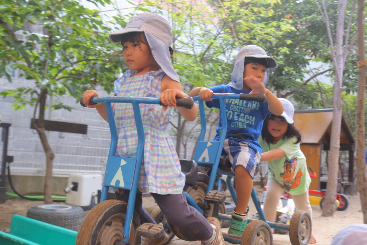 園庭はまだまだ真夏の暑さでしたが、水遊びや乗り物にと暑さに負けず盛り上がっていましたよ♪