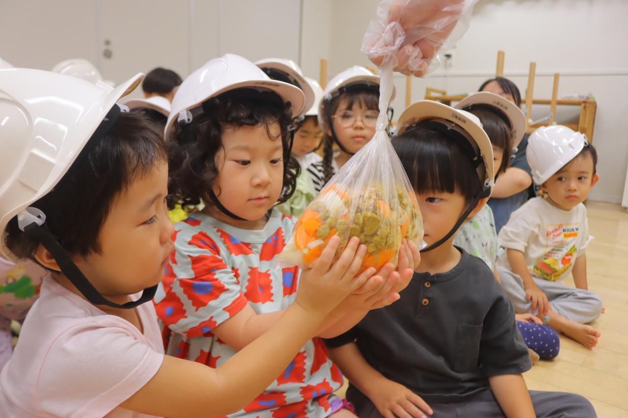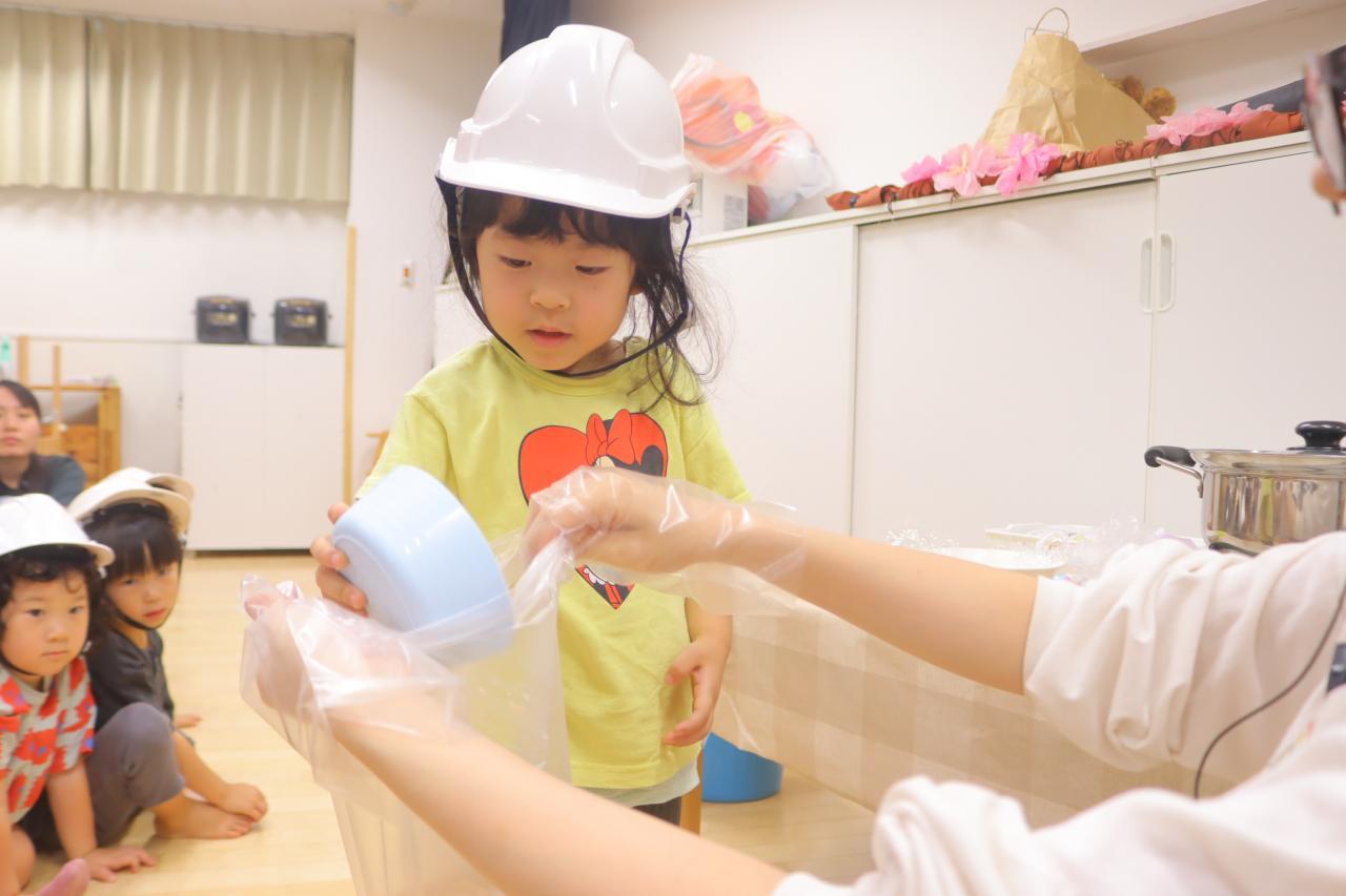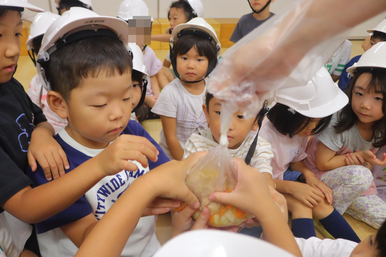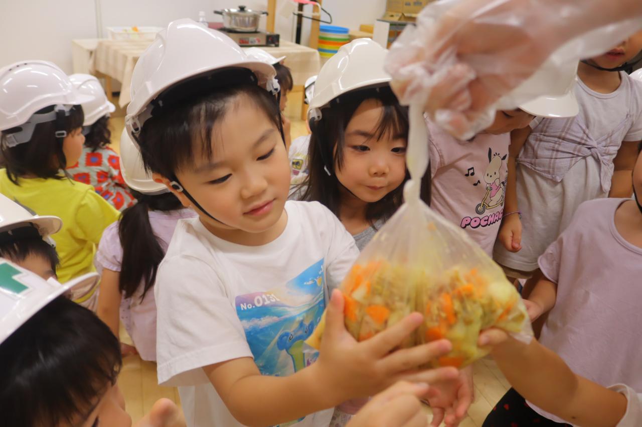 地震の紙芝居を読んだ後は、みんなで袋調理のツナカレー作りにチャレンジ!