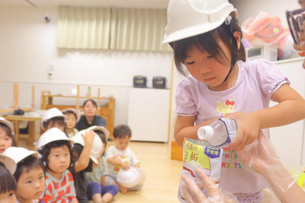 お昼ご飯の給食と一緒に、園で保管している非常食の