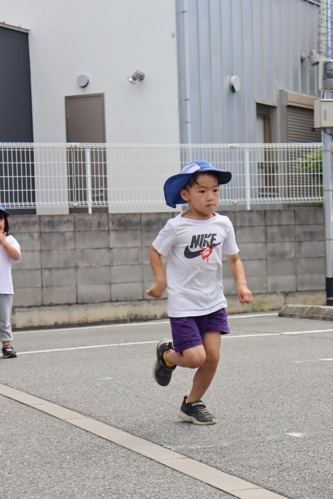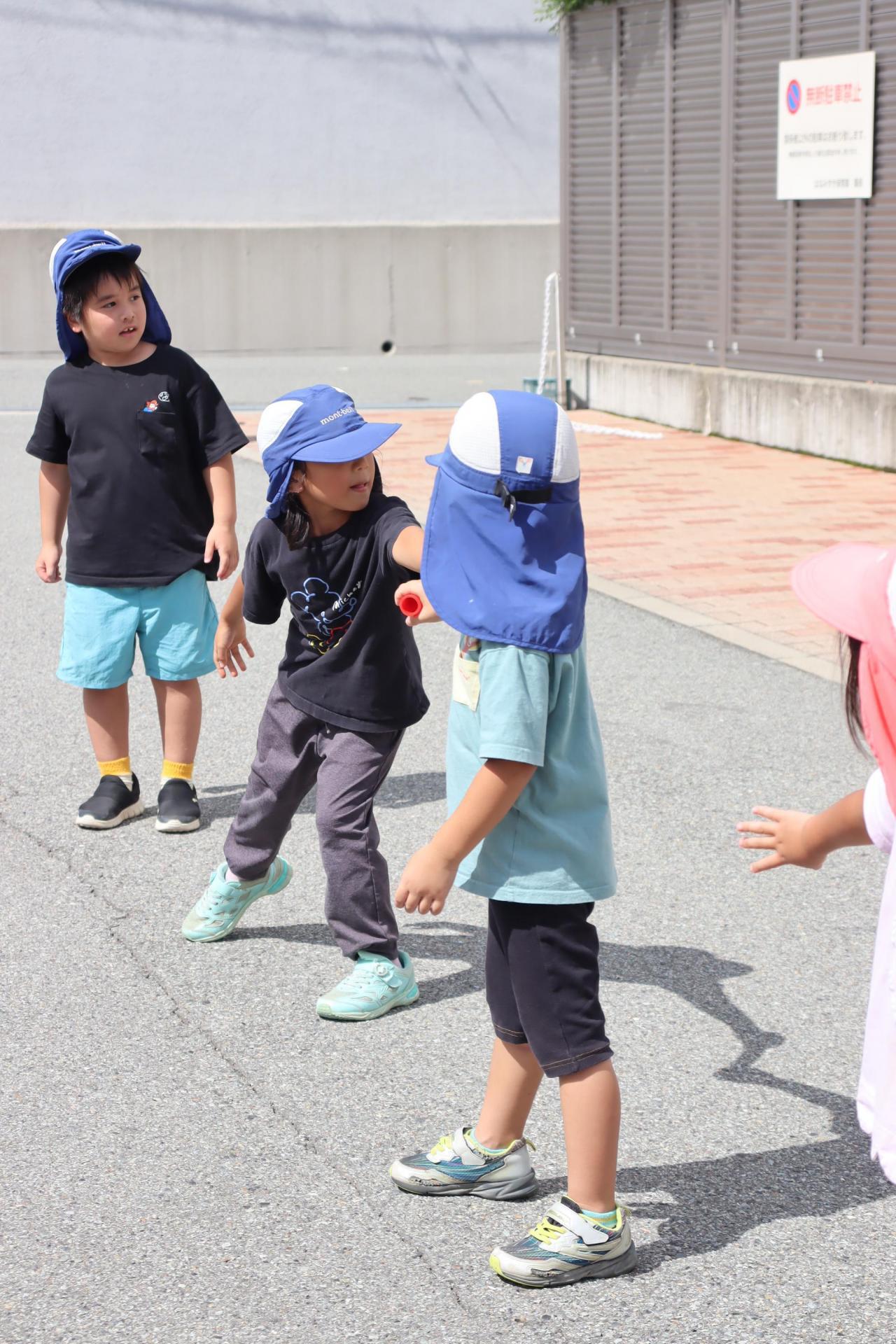 リレーの練習をするということで駐車場でしましたよ♪ 腕があたらないように広がって上手にしてくれていました😊