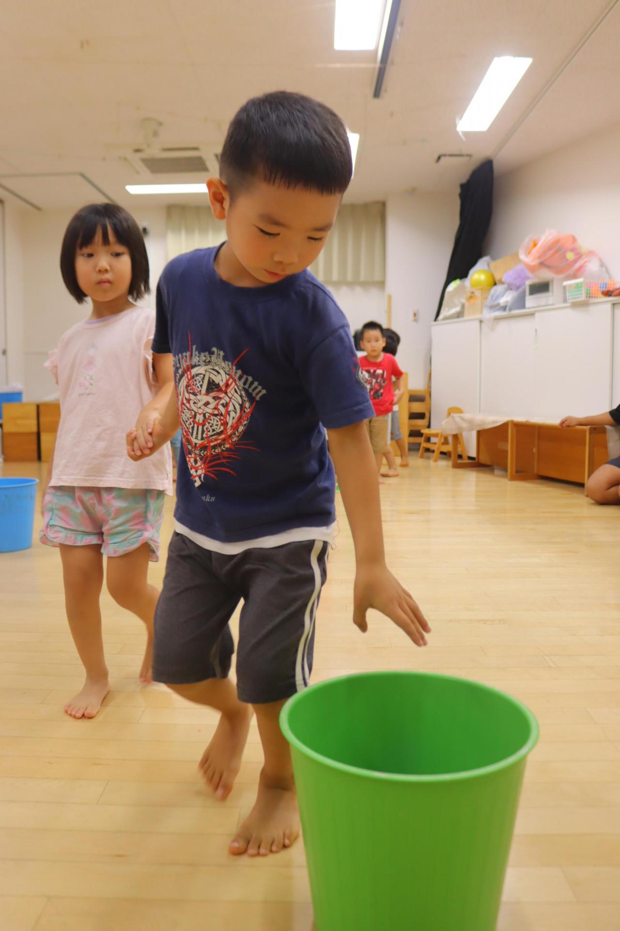 ぺんぎんさんはバケツの中からボールを一つとって少し先のバケツの中にボールをいれるのを練習しましたよ♪