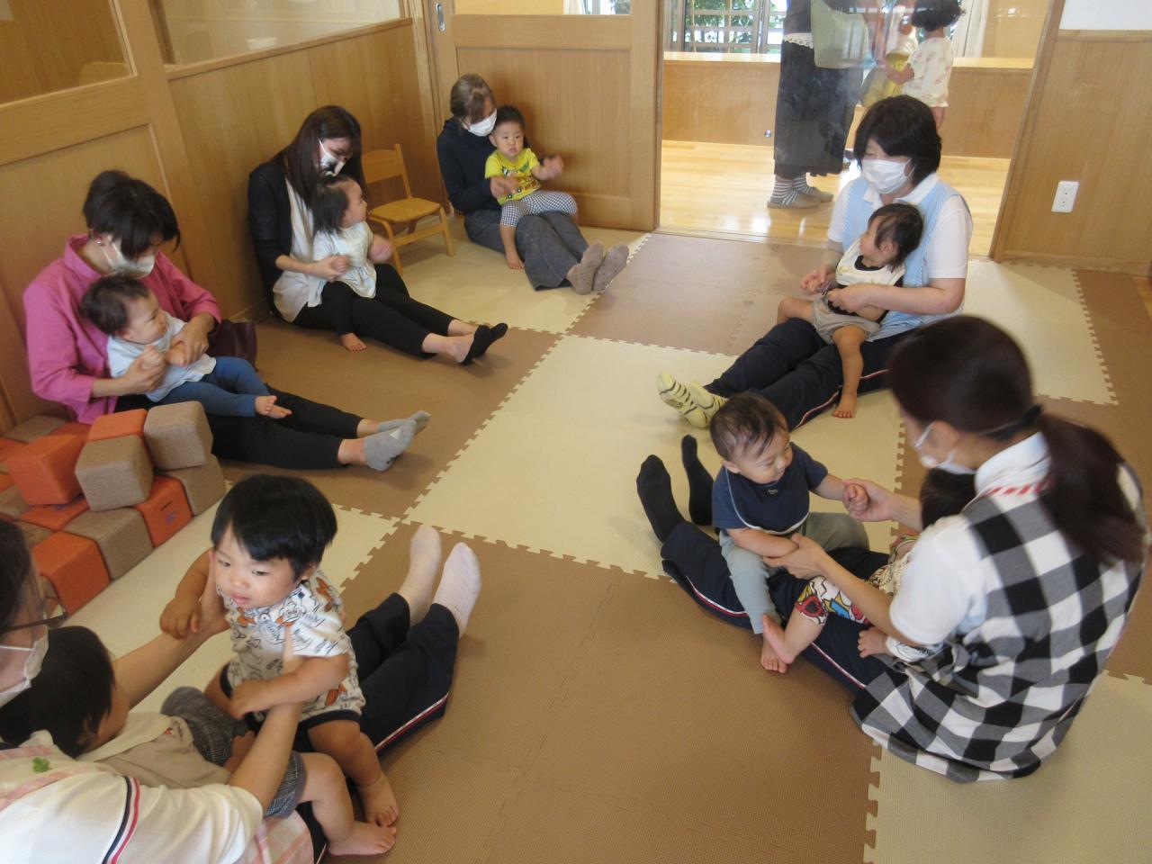 ひよこ・あひるぐみさんの保育参観・作品展2日目です。ひよこぐみさんは朝の会の後、「たぬき」「とんぼのめがね」を皆で歌って「やさいさん」の絵本を読みました。その後はお母さんや先生のおひざのバスに乗って楽しみました。