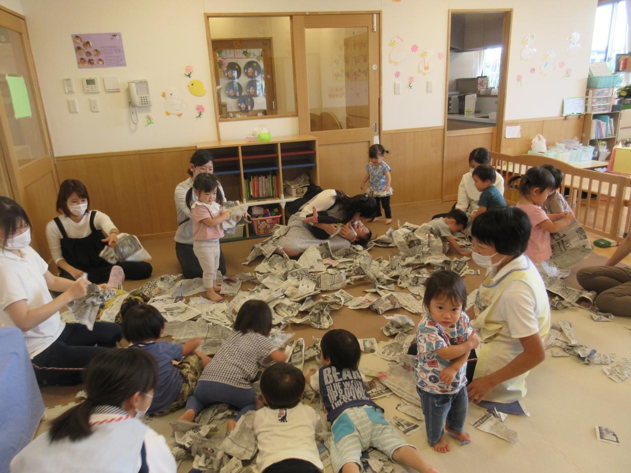 あひるぐみさんは新聞紙遊びをしました。ビリビリ破ったり「いないいないばあ!」をしたり、握って丸めておにぎりを作って遊びました。楽しく遊んだ後は新聞紙を袋にいっぱい集めて先生が袋にアンパンマンの顔を書きました。お片付けも上手にできました!