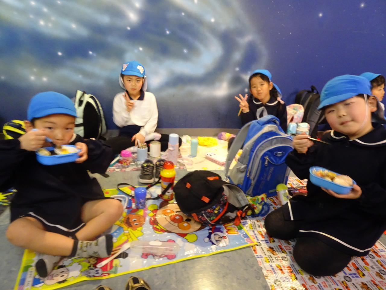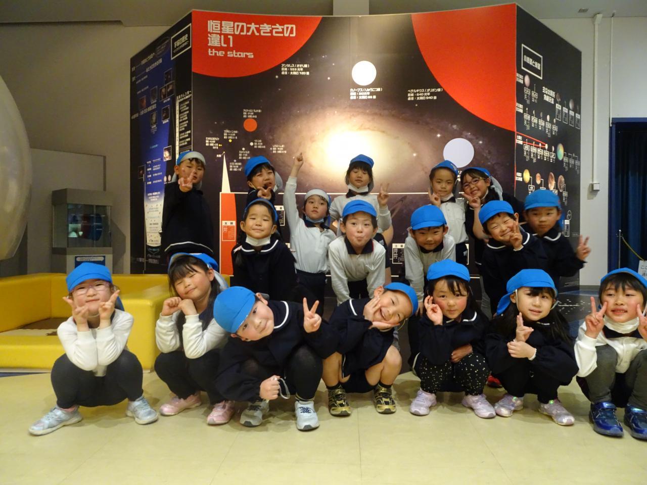 ぞうぐみのみんながとても楽しみにしていたお別れ遠足。バスの中でもお友達との会話から伝わってきました。宇宙科学館では宇宙について学んだり、ゲームを通して宇宙の不思議を体験しました。博文館では土器や住居、古墳など歴史に触れ、「これはなに?」「昔はこんなのかぁ」と興味津々で見ていました。プラネタリウムでは「わぁ~きれい!」と声が上がり、満点の星空にうっとりの子ども達でした。