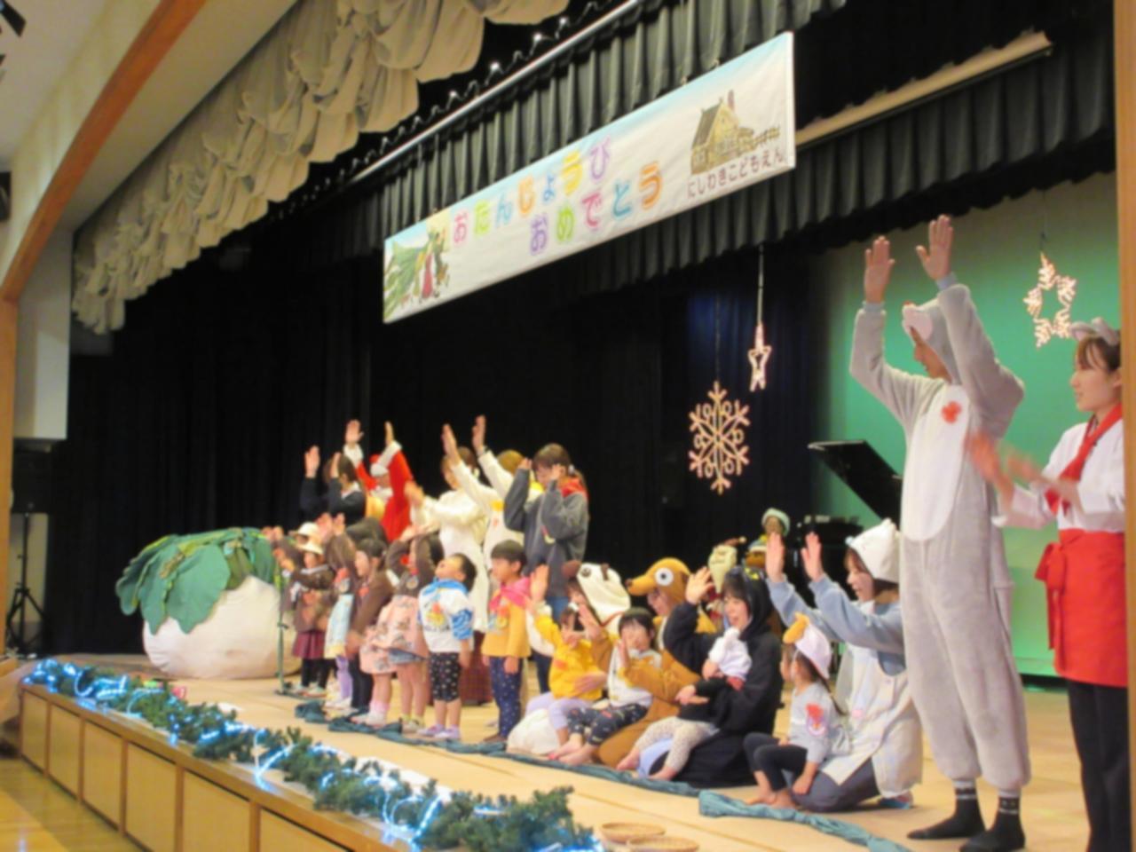 ”大きなかぶ”の劇遊びでは、大きな声でセリフを言い、舞台の下のお友だちも「うんとこしょ、どっこいしょ」と元気な声でかけ声を言ったり、みんなで一緒に歌ったりダンスを楽しみました。