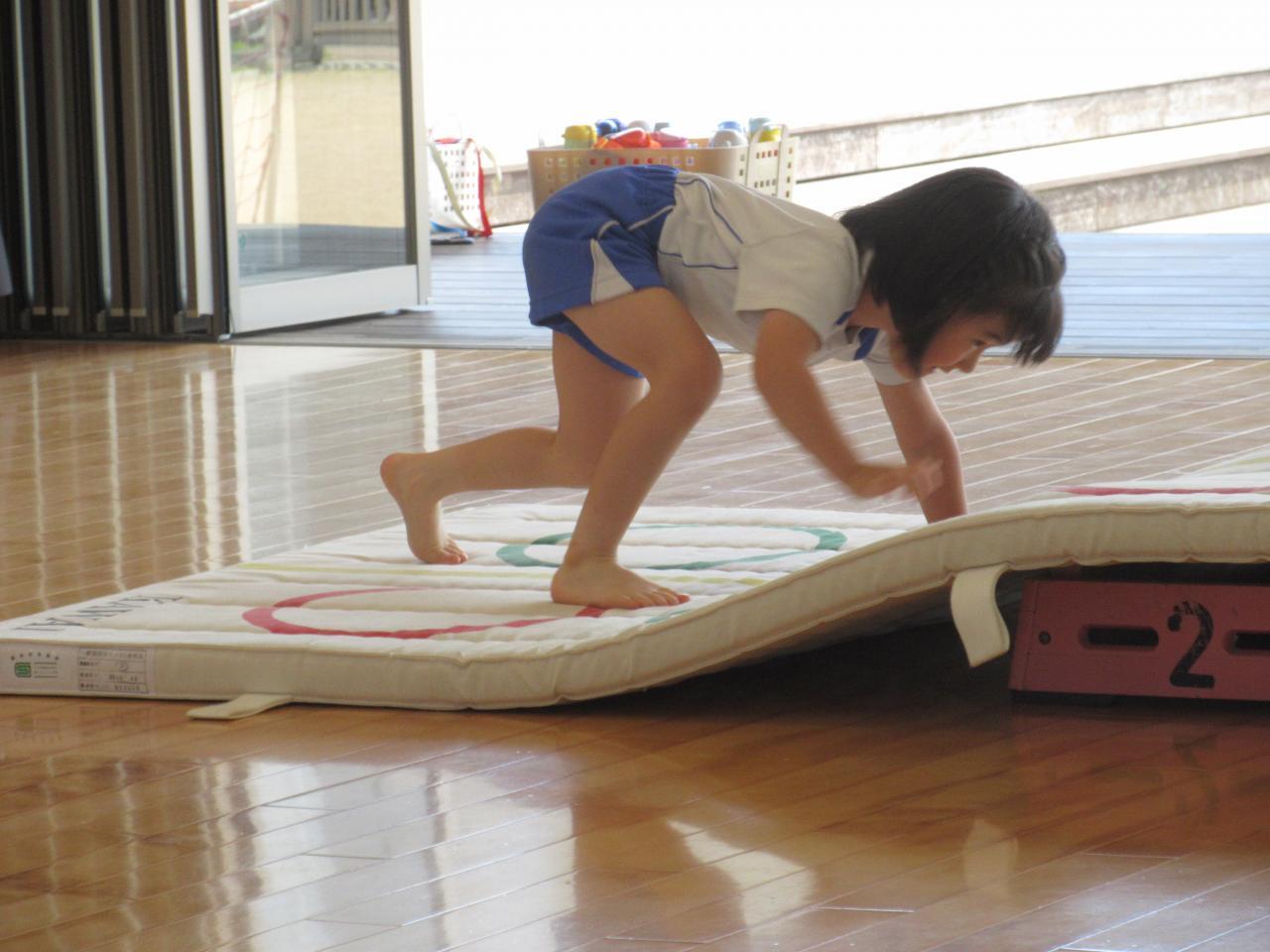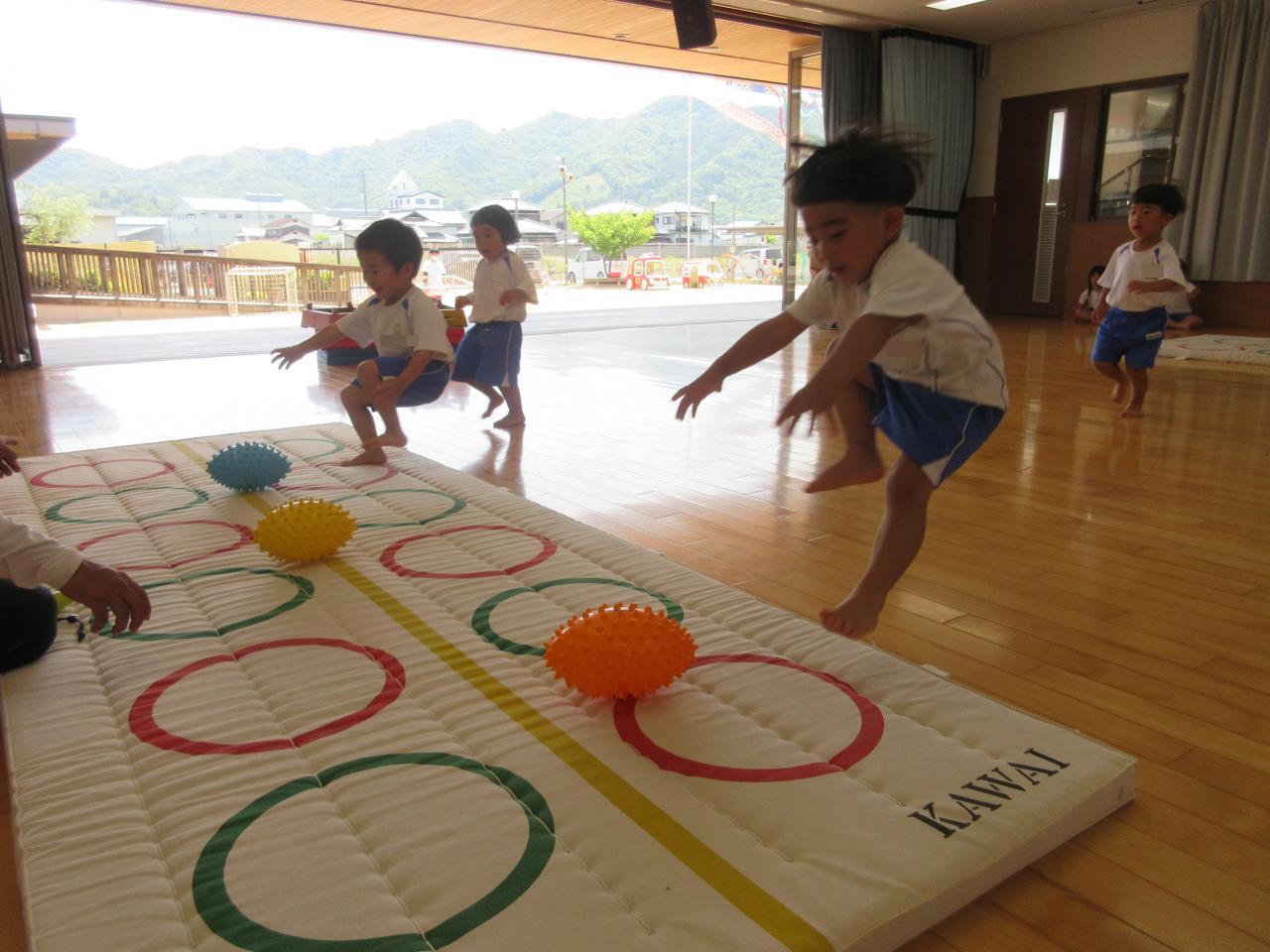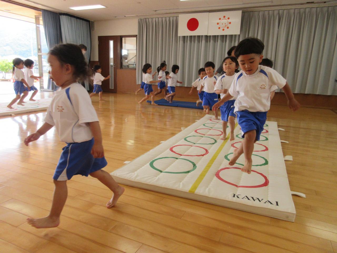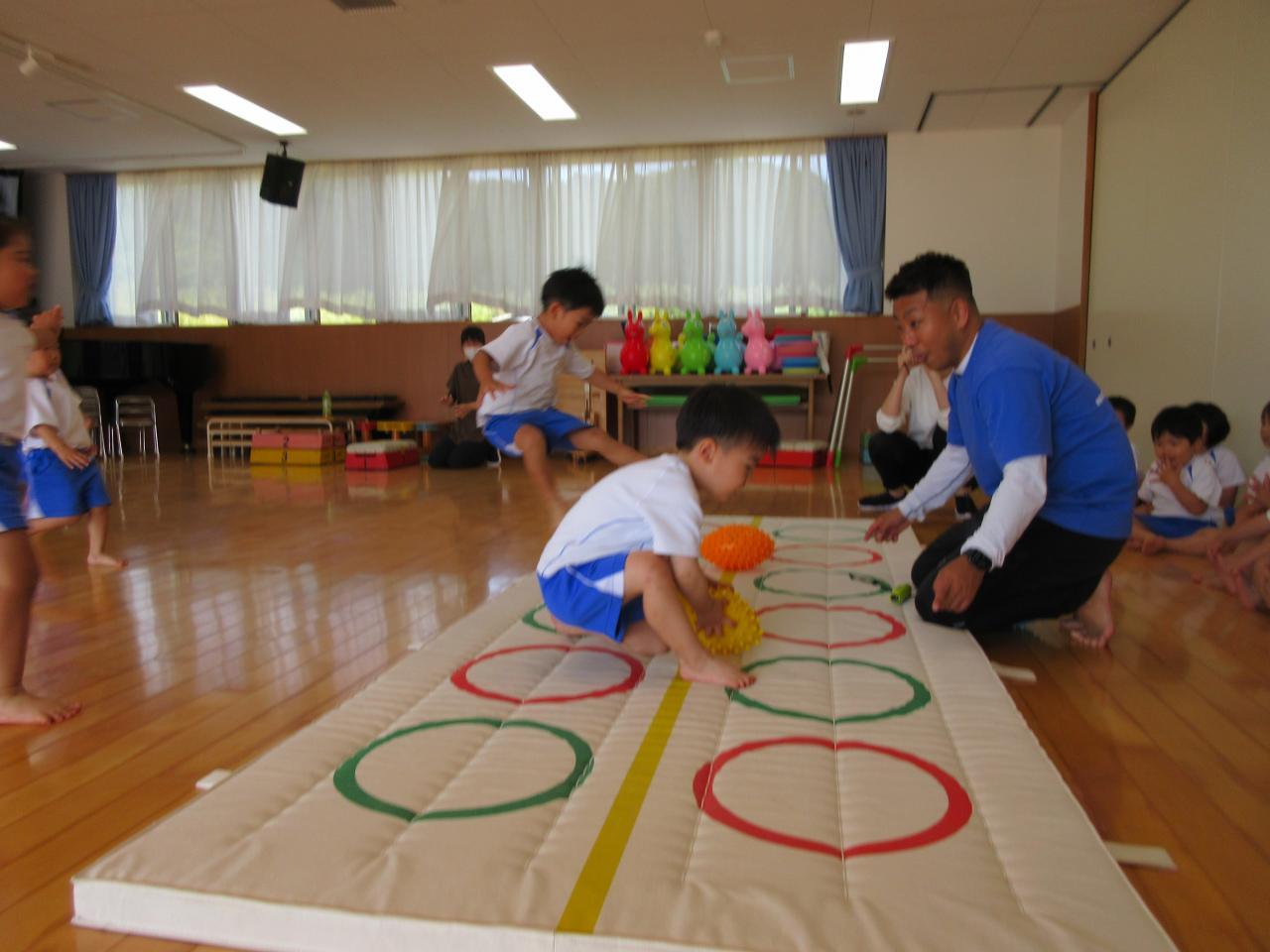 準備体操をして、身体をほぐした後、デコボコマットの上を思いきり走ったり🏃、くまさん🐻歩きをしたりしました。同じ方向で転ばないように走るお約束も聞いて、頑張る子どもたちでした💪