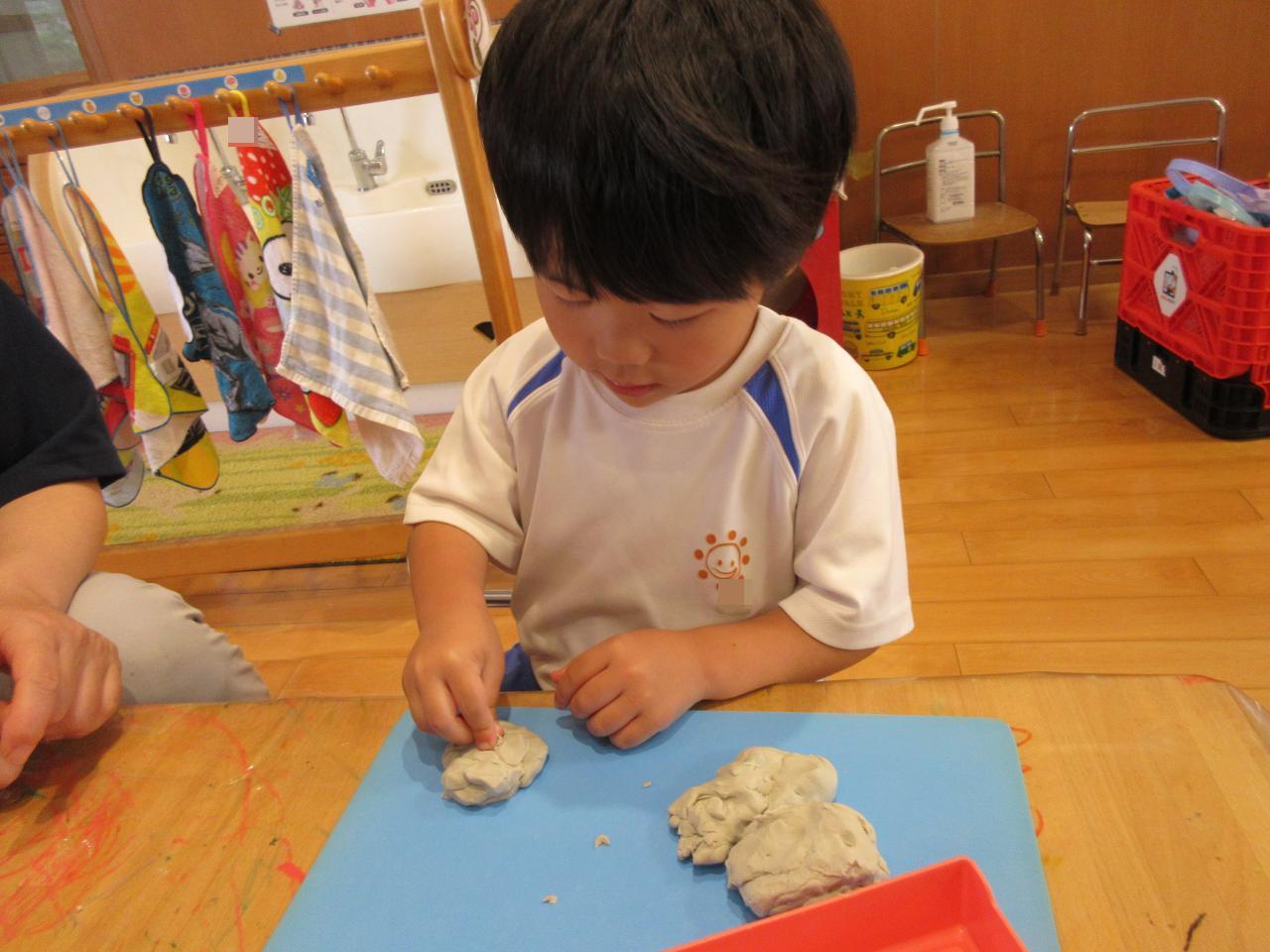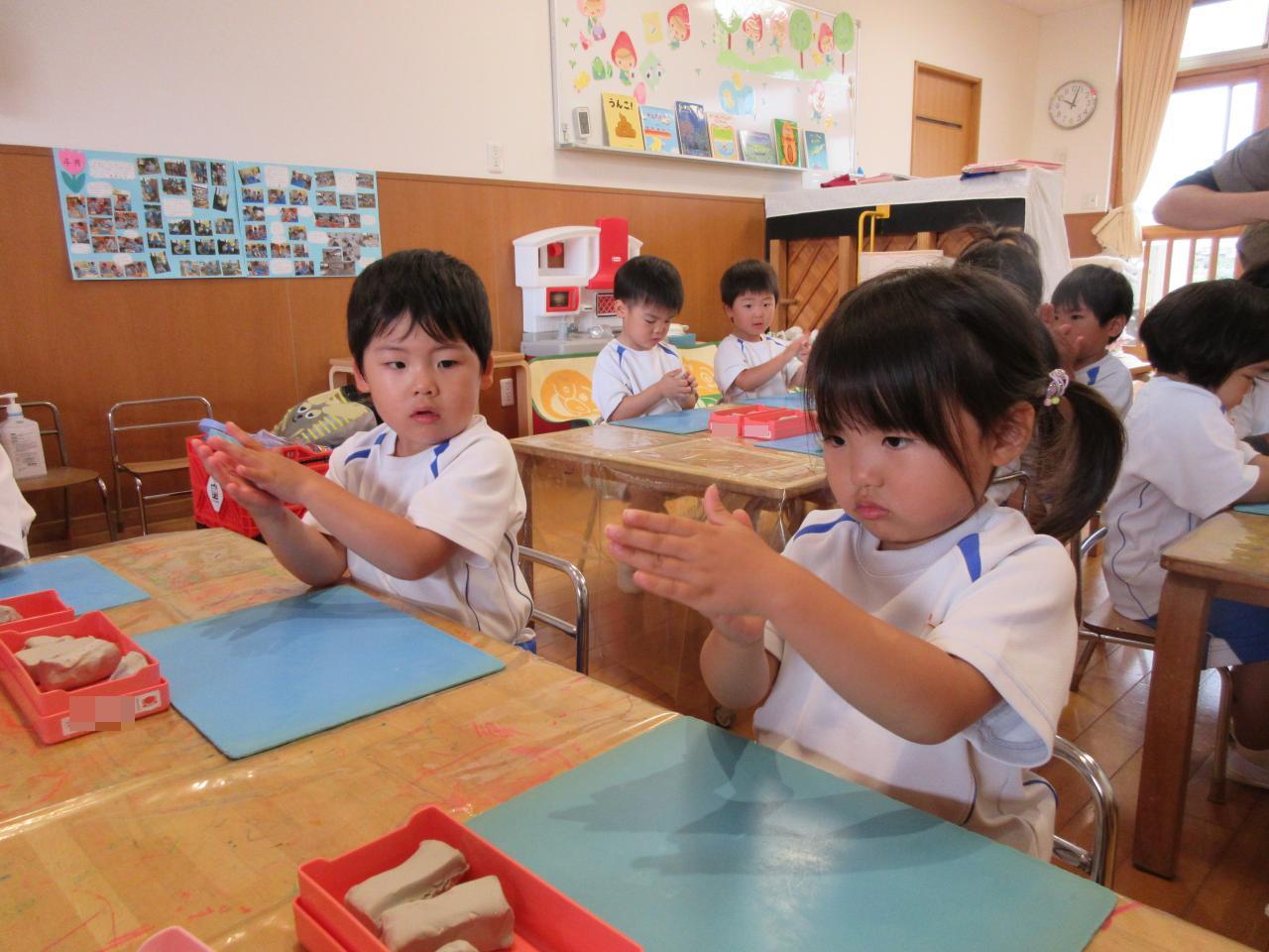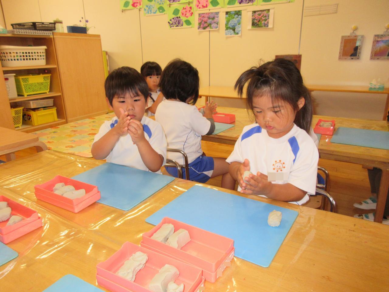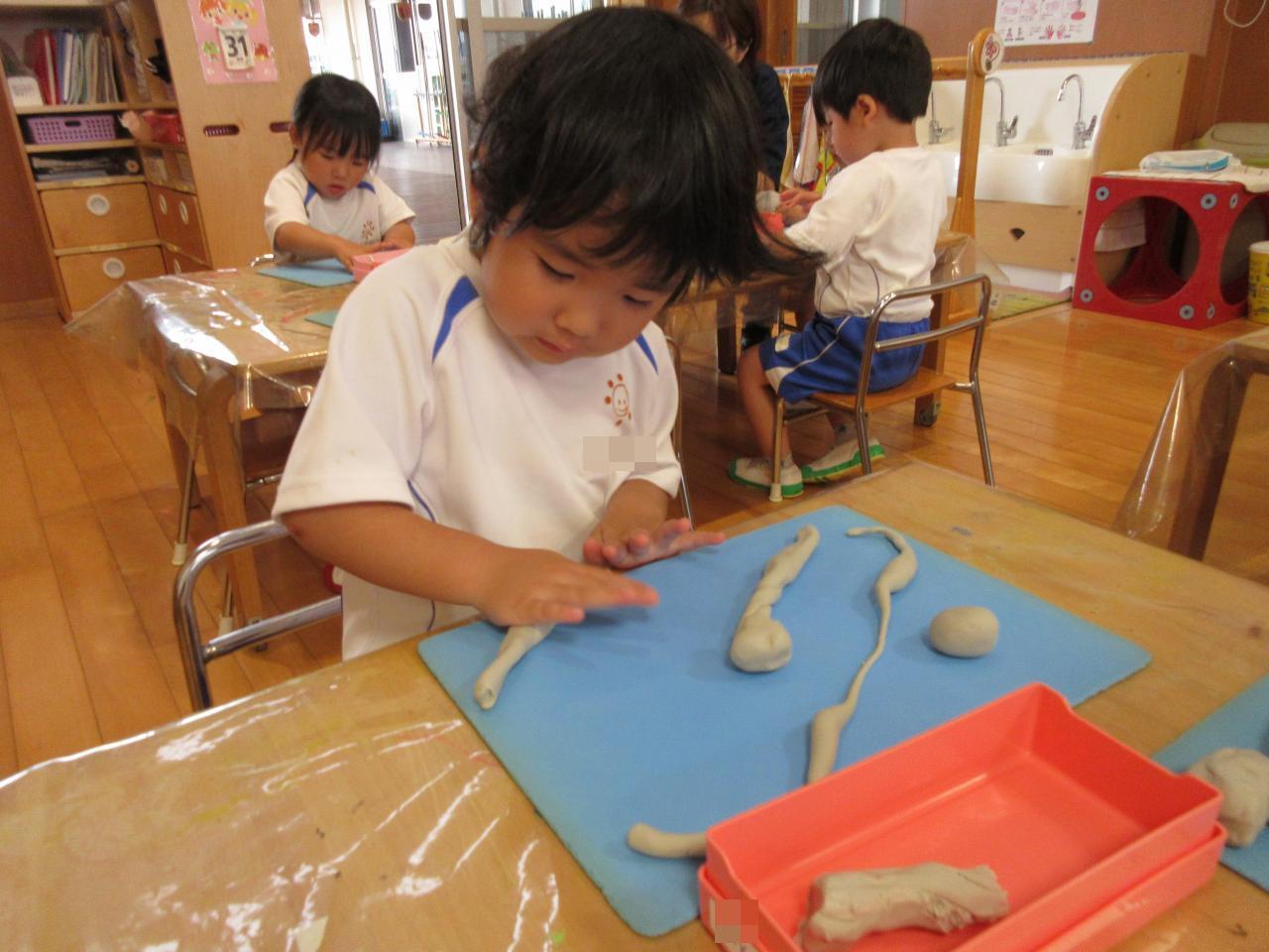 まず、粘土をちぎって丸くしたり、伸ばしたり…子どもたちは、悪戦苦闘💦そこで魔法の言葉出動!!