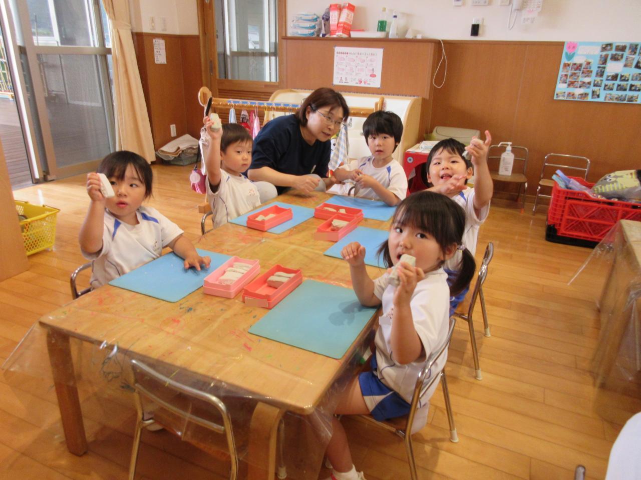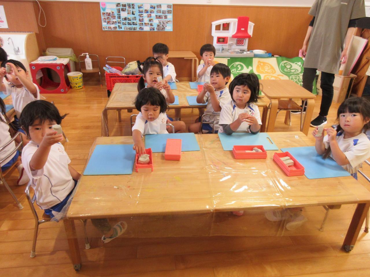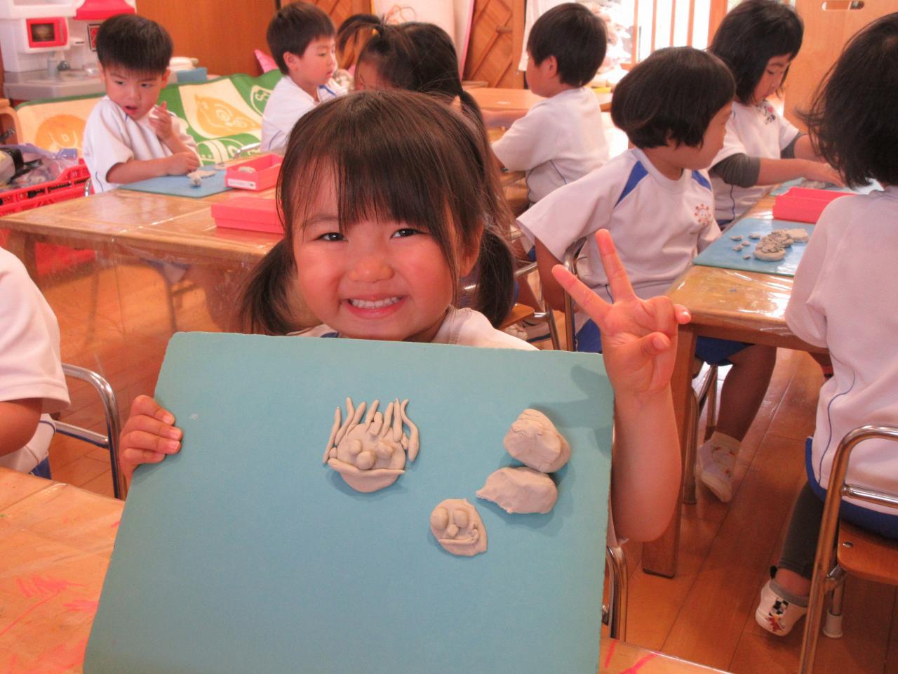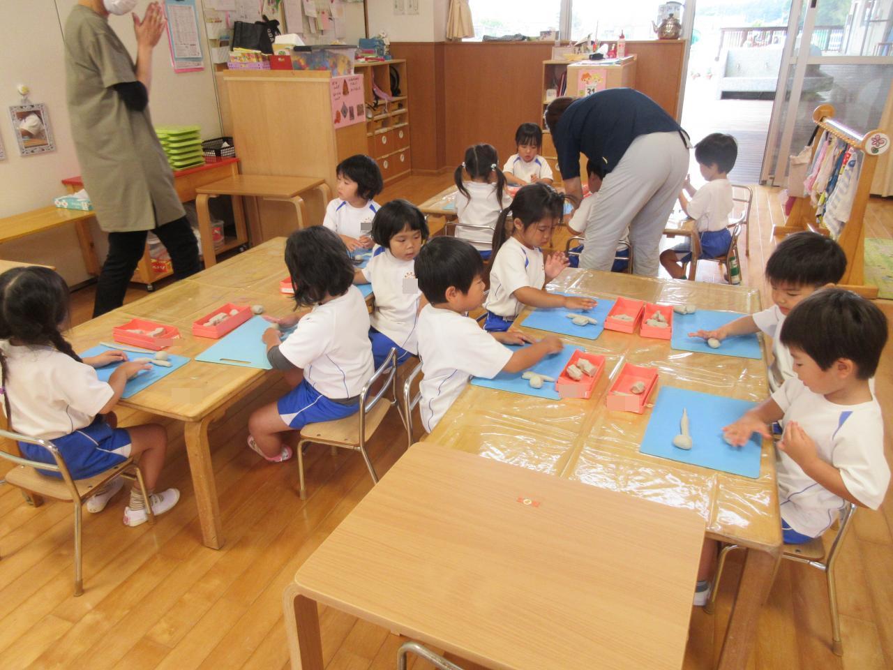 まず、粘土をちぎって丸くしたり、伸ばしたり…子どもたちは、悪戦苦闘💦そこで魔法の言葉出動!!