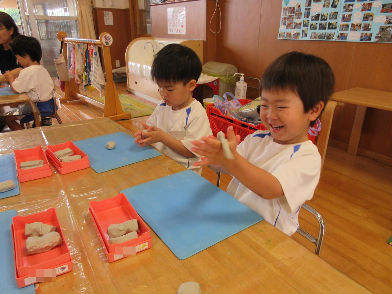 先生と一緒に粘土を手の平にのせて「まぁ~るくなぁ~れ」「まぁ~るくなぁ~れ!!」と念を送るように声をかけ続けると、子どもたちの表情は・・・眉間のシワが消え、ムフフフ笑いで笑顔に!!