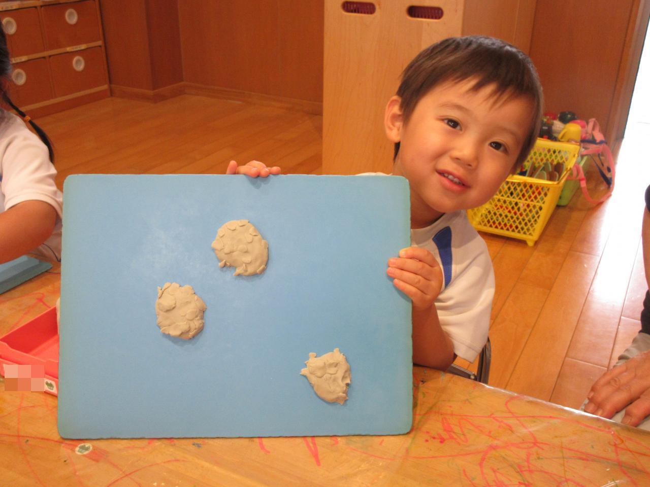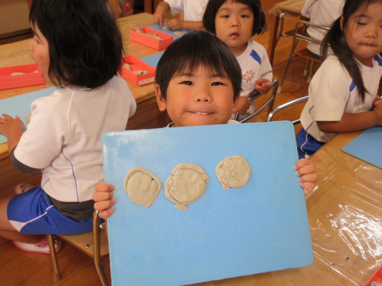 伸ばす時も「長~くなぁ~れ」「長~くなぁ~れ!!」の言葉に「長くなってきた!」「のびたのびた!」と満足顔😄丸くまるめた粘土を、ドンドンドンとたたいて広げ、ひらたくした上に、目や鼻・口・髪の毛をつけて、自画像完成👏「ママも作る」「かぁちゃん作ろ~」と自分の顔の横に、おうちの人の顔も作った子どもたちでした✨また粘土でいろいろなものを作ってあそぼうね。