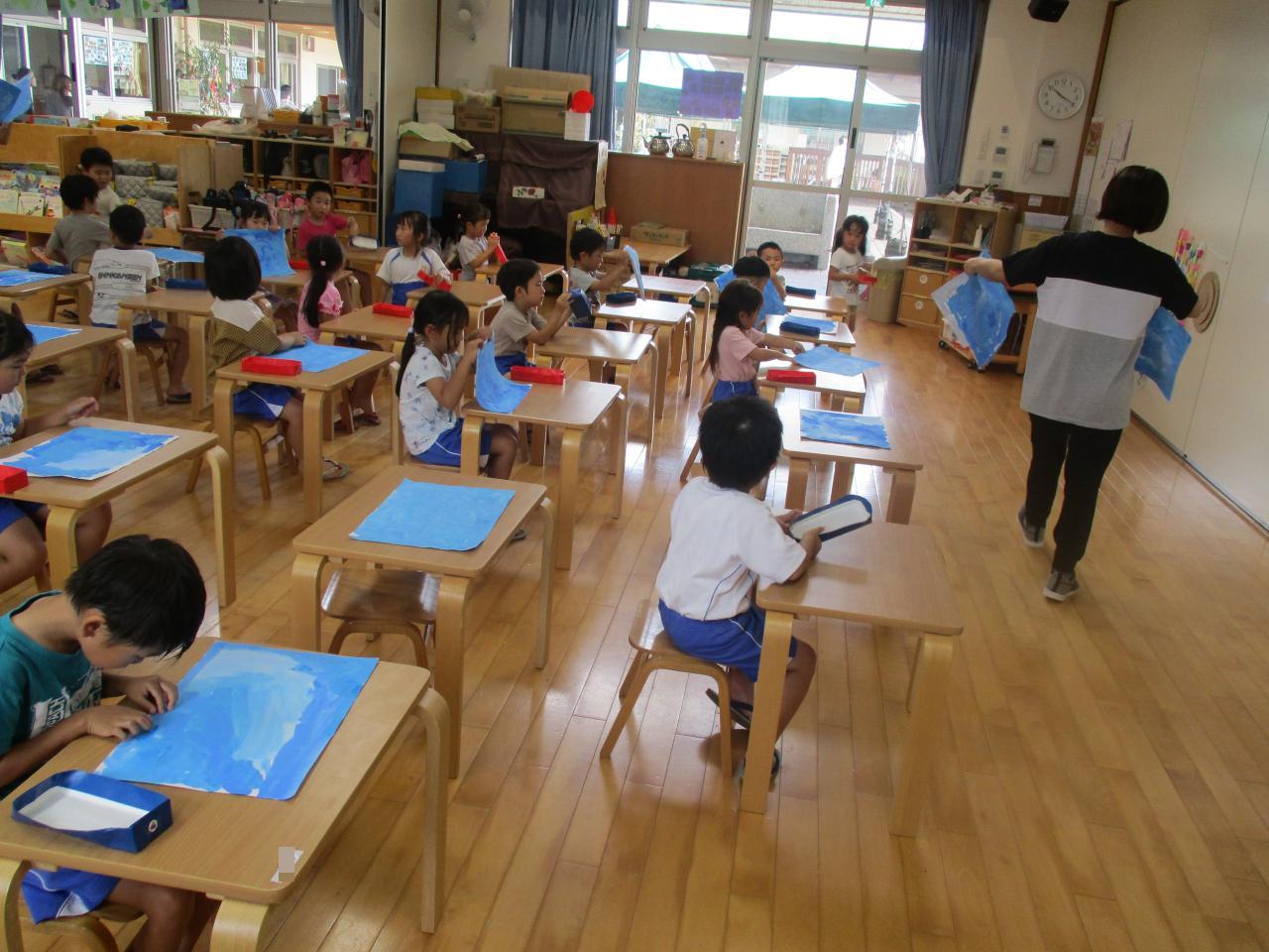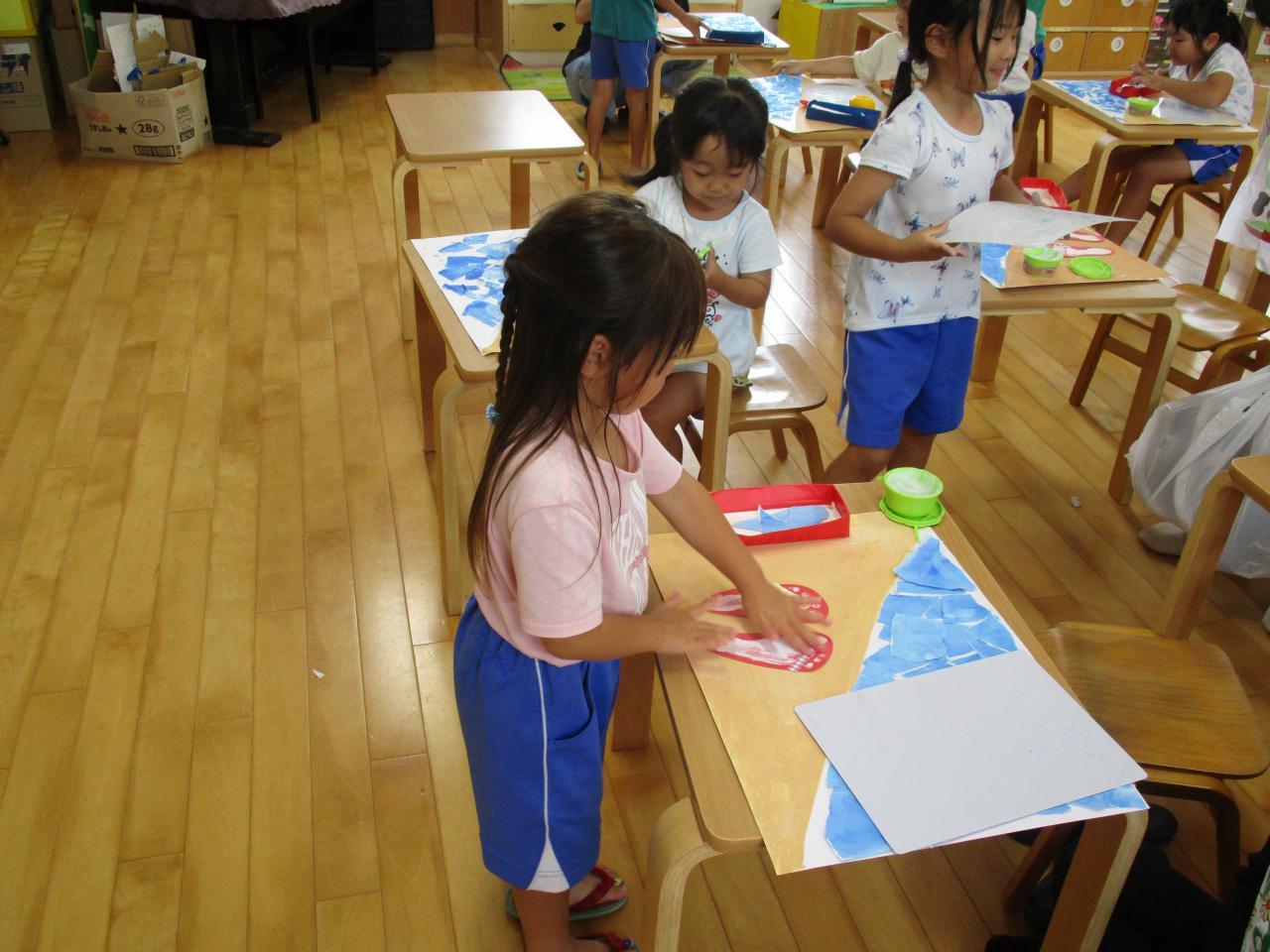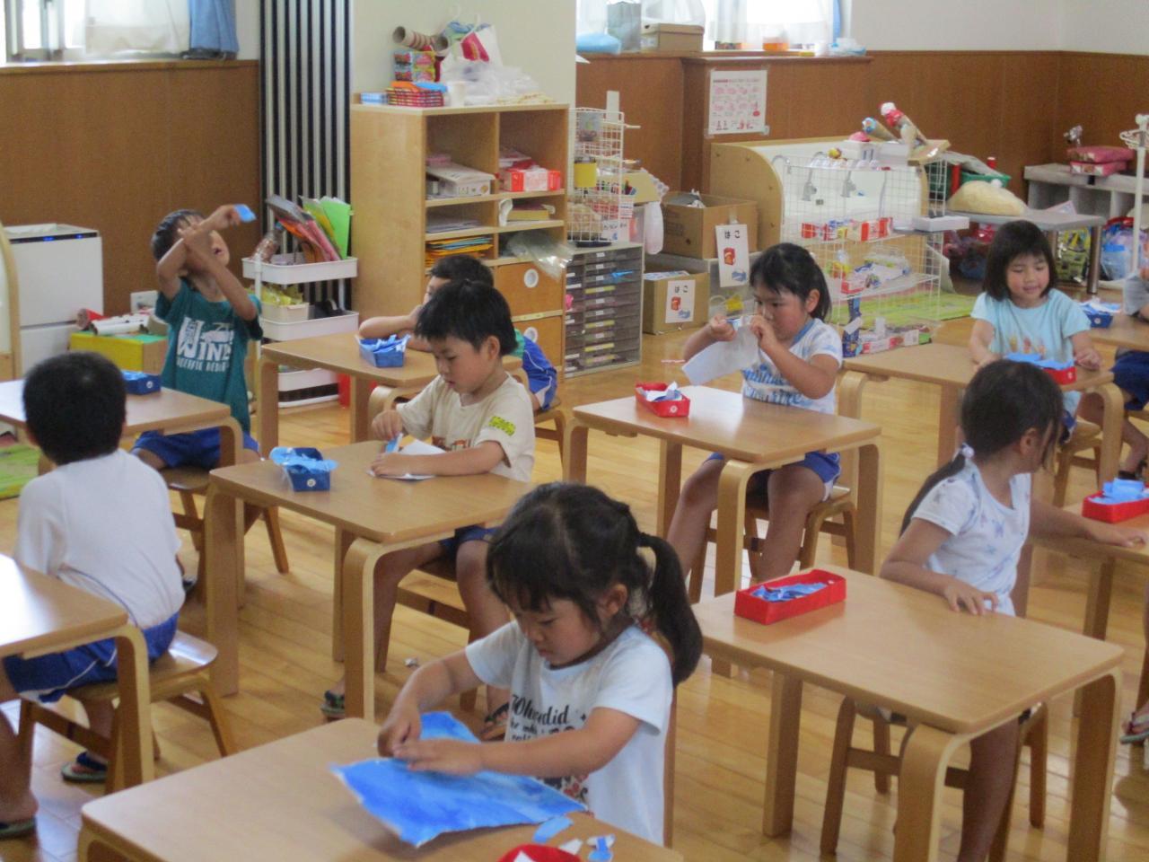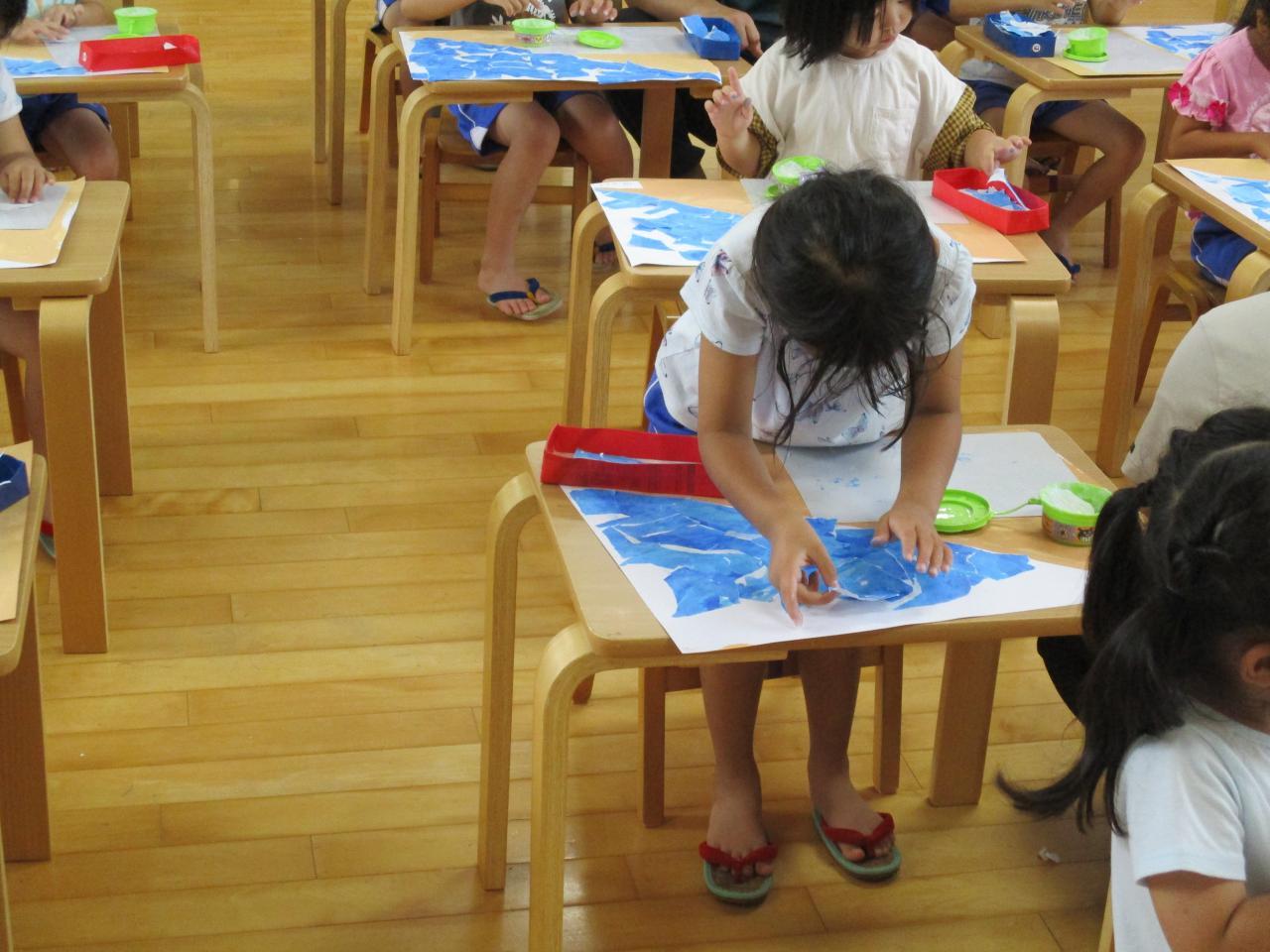 あじさい組は、お部屋で海の制作、室内遊びを楽しみました。青色に塗った紙をちぎってのりをつけて貼り、それぞれ自分の海を表現しましたよ🐬
