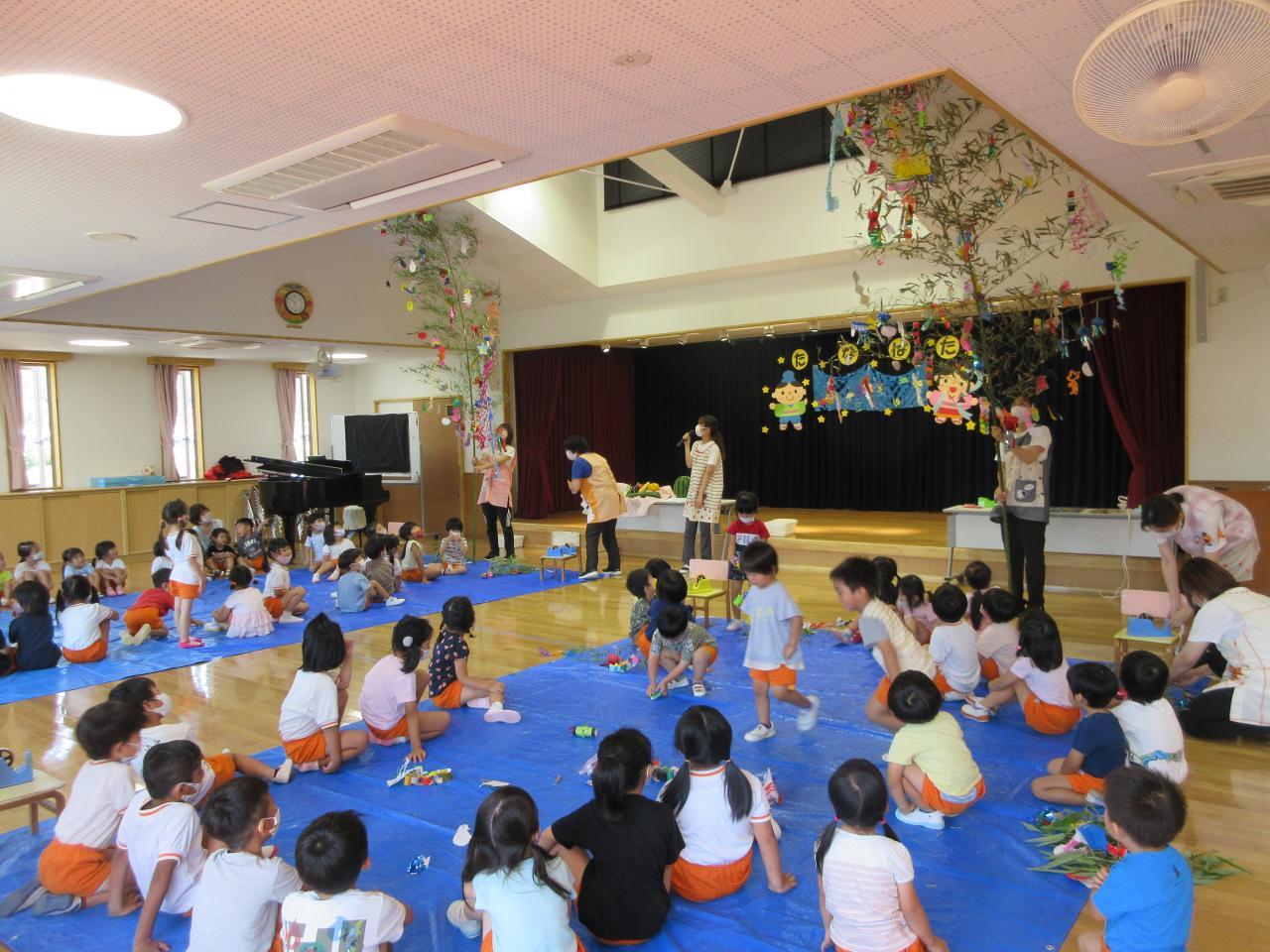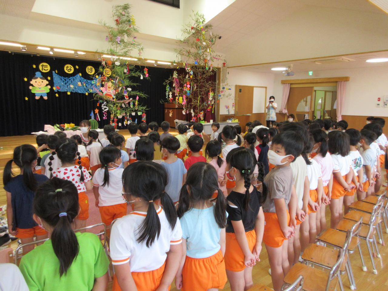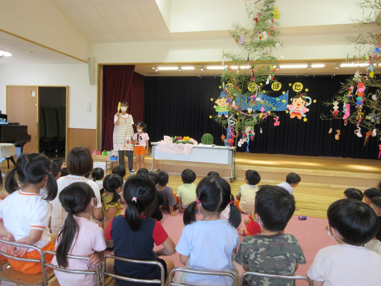 7月になり真夏の暑さが続いています。7日は七夕まつりを園児が楽しみました。4歳児5歳児は大きな竹に飾りです。願い事もいっぱいつけました。七夕まつりでは2本の竹飾りと一緒に5歳児が育て収穫した夏野菜をお供えして、収穫を祝いました。今年はなすびやきゅうり、ピーマンやパブリカ、とうもこしやとまとを大収穫、カボチャやメロンはまだ今からです。七夕まつりでは織姫彦星の物語や保育士たちのペープサートや歌など盛りだくさん行いました。給食はおいしいい冷やしソーメンを調理師さん達が大奮闘。みんなはとても満足しました。おまけにおやつがお供えのスイカです。今年は特大のスイカでした。帰りには一人ひとり笹飾りと写真を持ち帰りました。お家でも楽しんでください。園内は七夕祭りを玄関や教室前の飾り、7月はにぎやかです。プール組み立ても終わり明日8日はプール掃除です。来週からプールでの水遊びを楽しみます。夏の遊びを満喫しましょう。