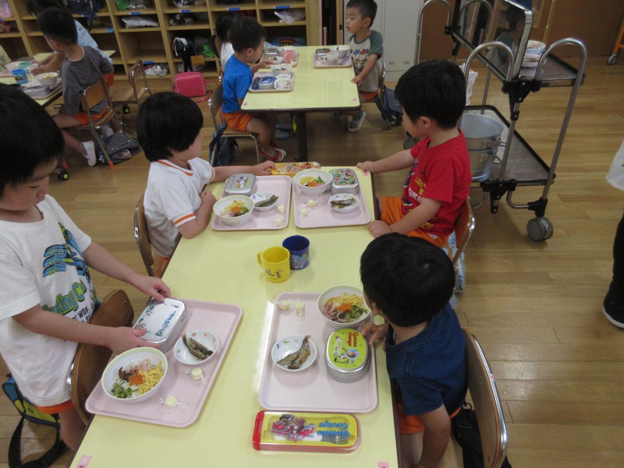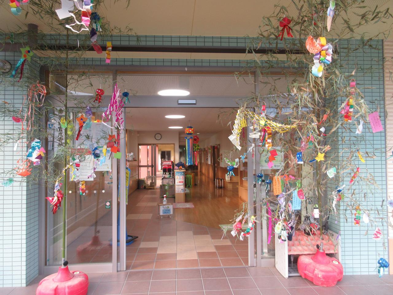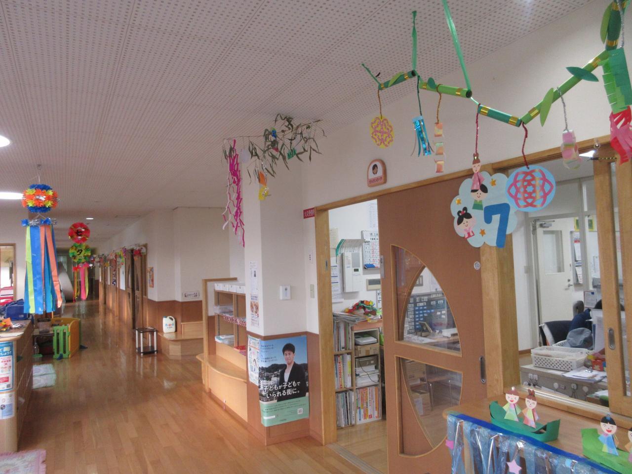7月になり真夏の暑さが続いています。7日は七夕まつりを園児が楽しみました。4歳児5歳児は大きな竹に飾りです。願い事もいっぱいつけました。七夕まつりでは2本の竹飾りと一緒に5歳児が育て収穫した夏野菜をお供えして、収穫を祝いました。今年はなすびやきゅうり、ピーマンやパブリカ、とうもこしやとまとを大収穫、カボチャやメロンはまだ今からです。七夕まつりでは織姫彦星の物語や保育士たちのペープサートや歌など盛りだくさん行いました。給食はおいしいい冷やしソーメンを調理師さん達が大奮闘。みんなはとても満足しました。おまけにおやつがお供えのスイカです。今年は特大のスイカでした。帰りには一人ひとり笹飾りと写真を持ち帰りました。お家でも楽しんでください。園内は七夕祭りを玄関や教室前の飾り、7月はにぎやかです。プール組み立ても終わり明日8日はプール掃除です。来週からプールでの水遊びを楽しみます。夏の遊びを満喫しましょう。