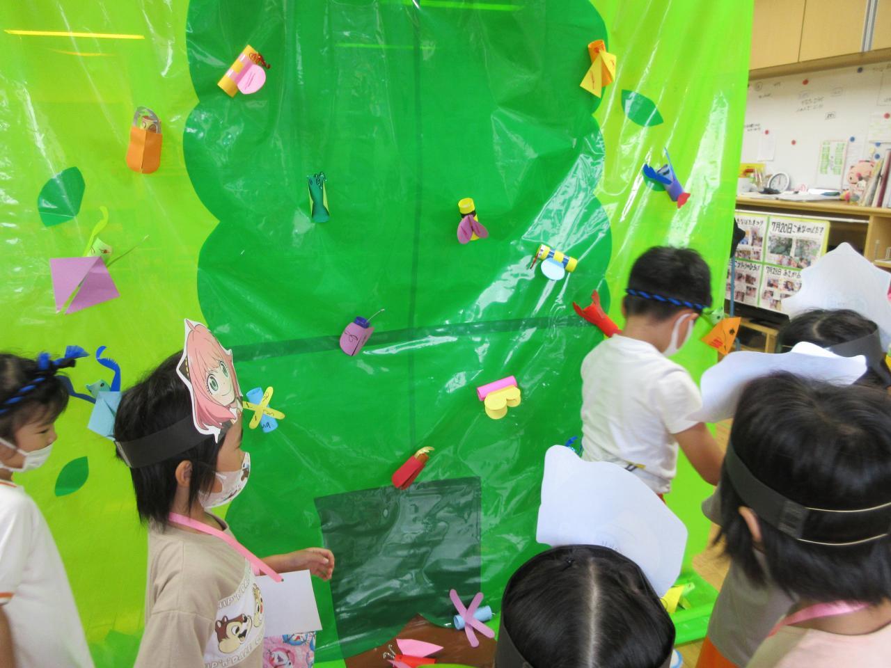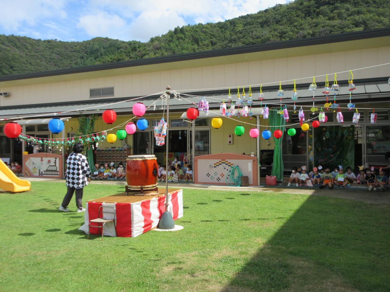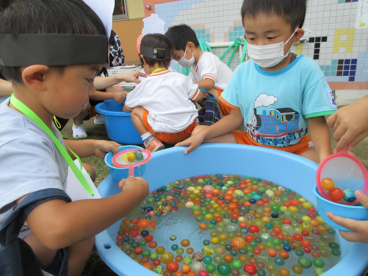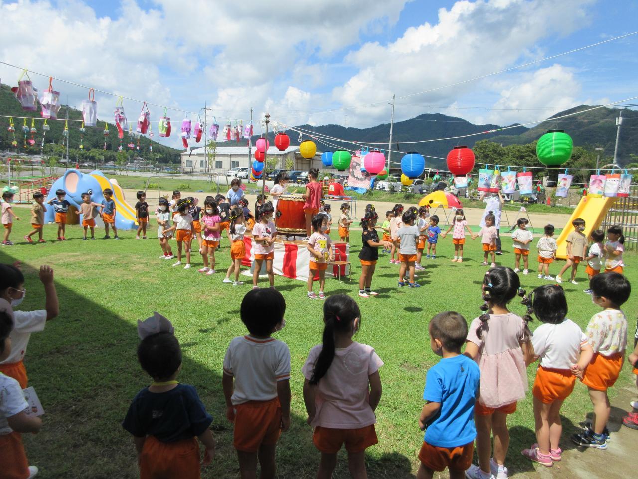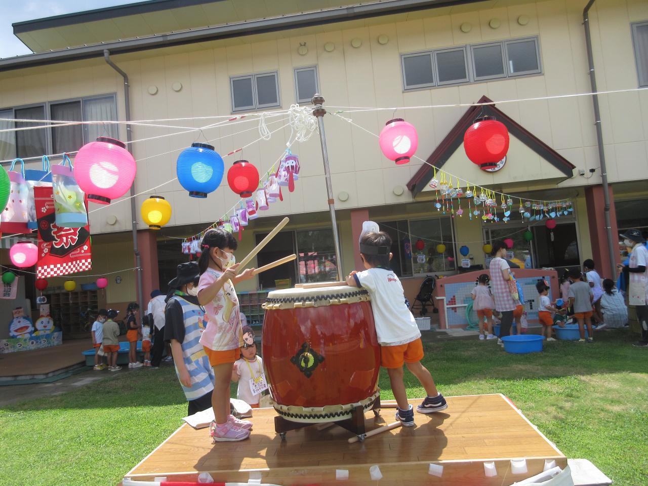 26日は全園児参加の夏祭りです。好天になり朝からお祭りの音頭と太鼓の音で心ウキウキさせる雰囲気の中で始まりました。「ヨーヨー釣り・スーパーボールすくい」は定番のお店。5歳児が工夫して出した、「虫取りゲーム・ねらってねらっててゲーム・生き物ばこゲーム」はうまく工夫され、夢中で遊びました。芝生広場で輪になって踊った「忍忍者音頭」。みんなで踊って太鼓をたたいて楽しかったよ。