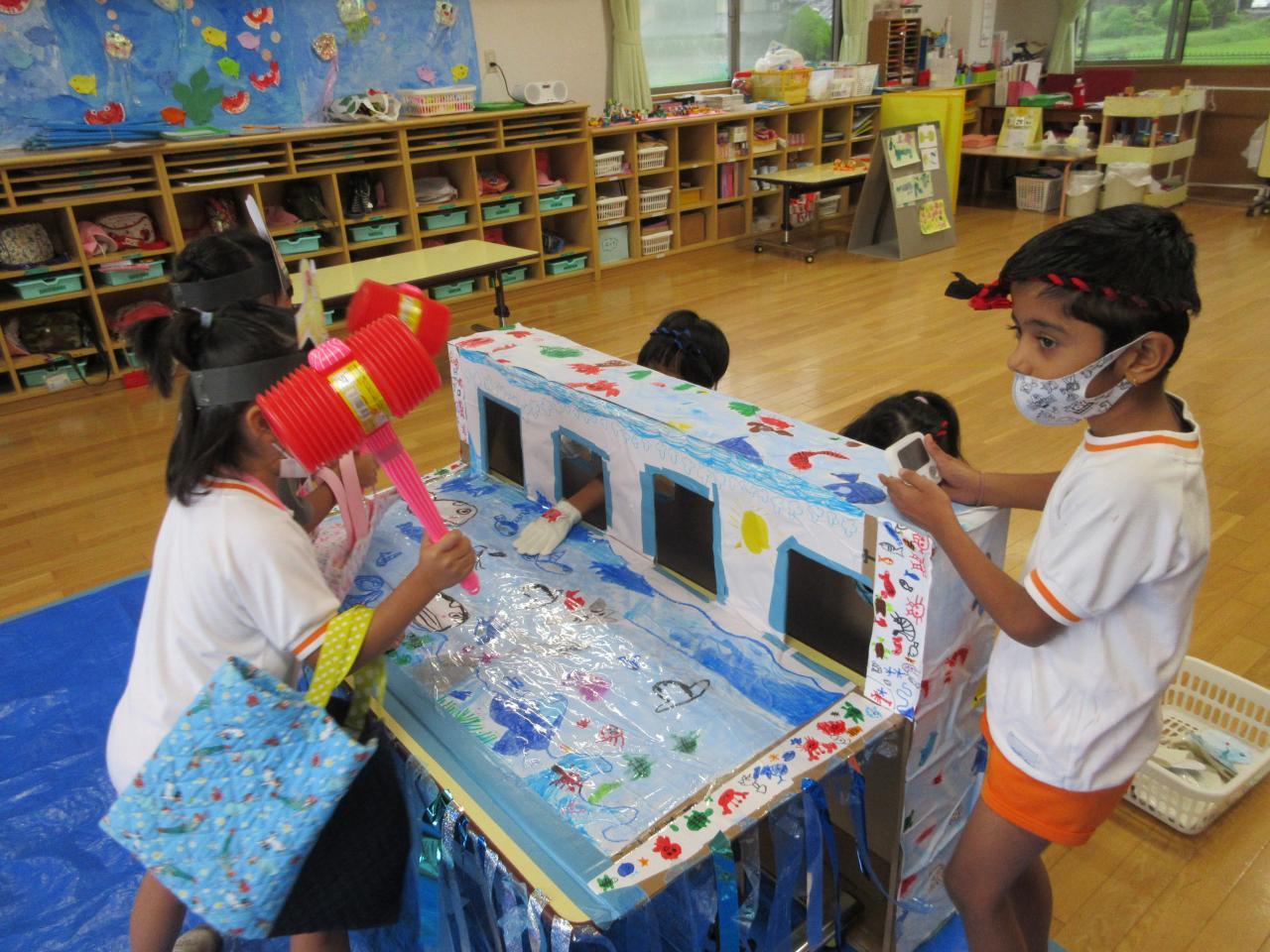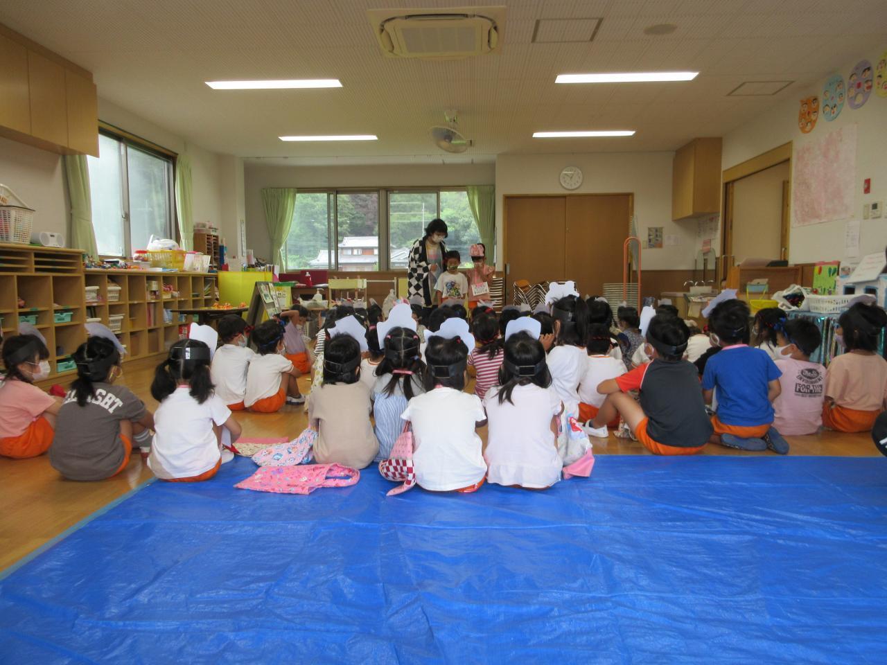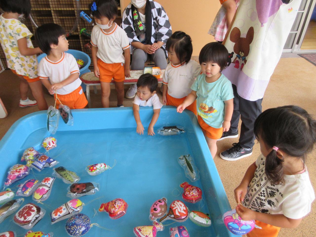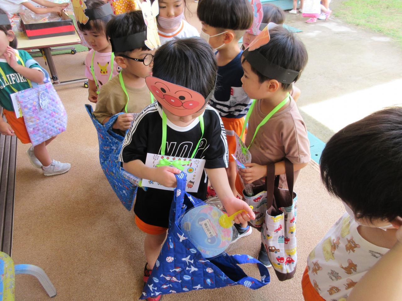 夏の風物詩「夏祭り」はコロナ感染を予防しながら各所で開催されるようになってきました。園では園児だけの夏祭りを25日・26日にわたり行いました。前日は4・5歳児のみで楽しみました。あいにくその日は雨模様で踊りはできませんでしたが、出店を楽しみました。26日は2・3歳児を連れて廻る役割と出店の役割があります。祭りを楽しみながら役割の確認もできました。