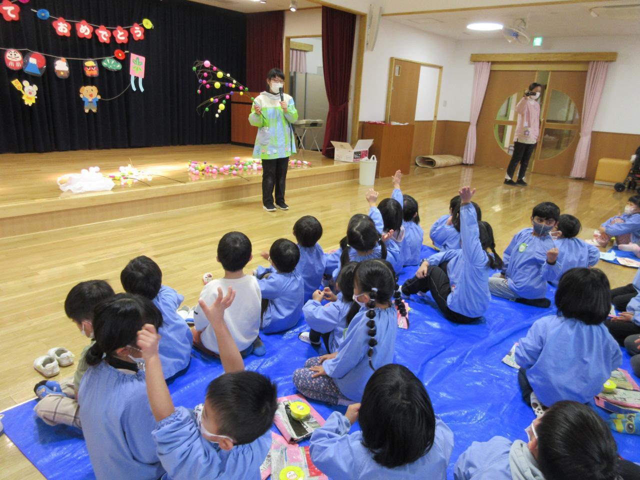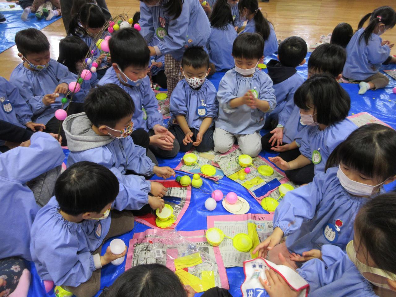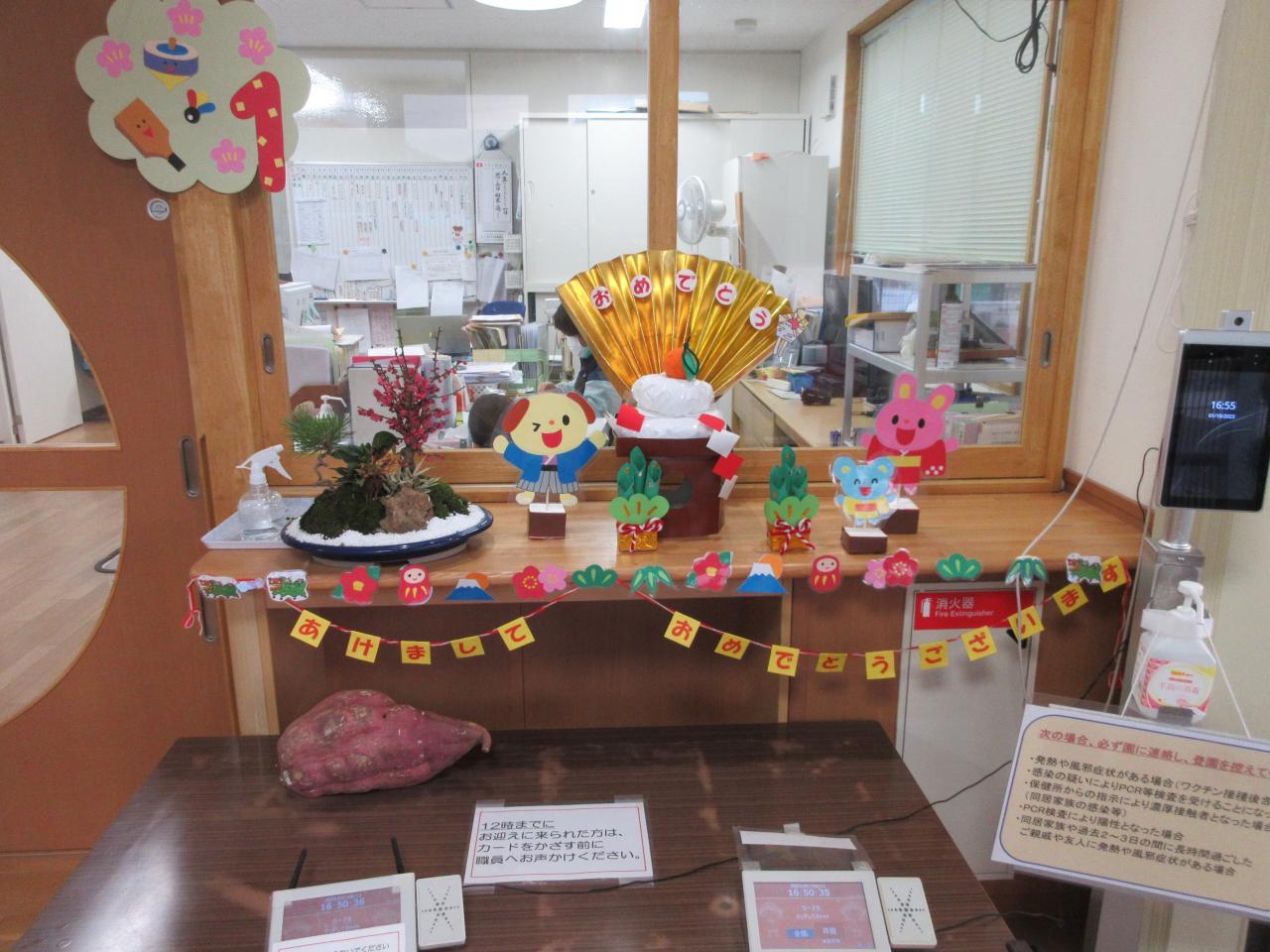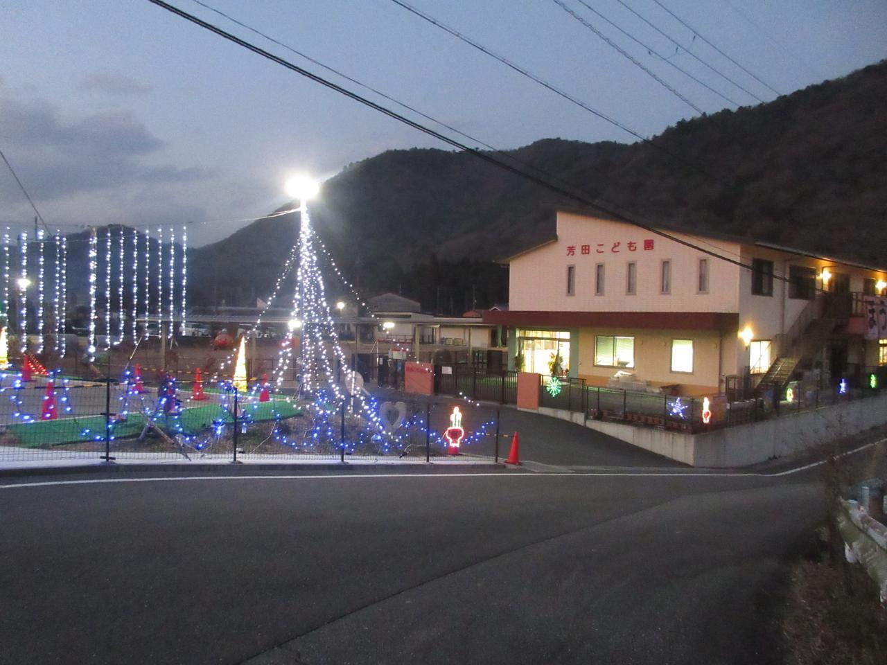 今日はみんなが登園したので、新年のあいさつ集会をしました。新年のあいさつをしたりお年玉をもらったり、新年の歌を歌ったり餅花を作ったりして、みんなで楽しみました。こども園の周りのイルミネーションば12月のクリスマスバージョンからお正月バージョンに代わっています。元気な芳田をあらわしています。