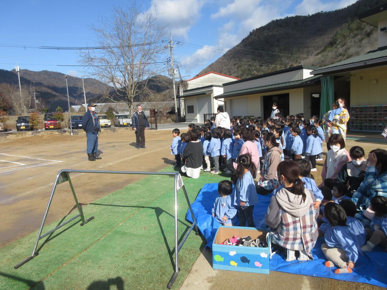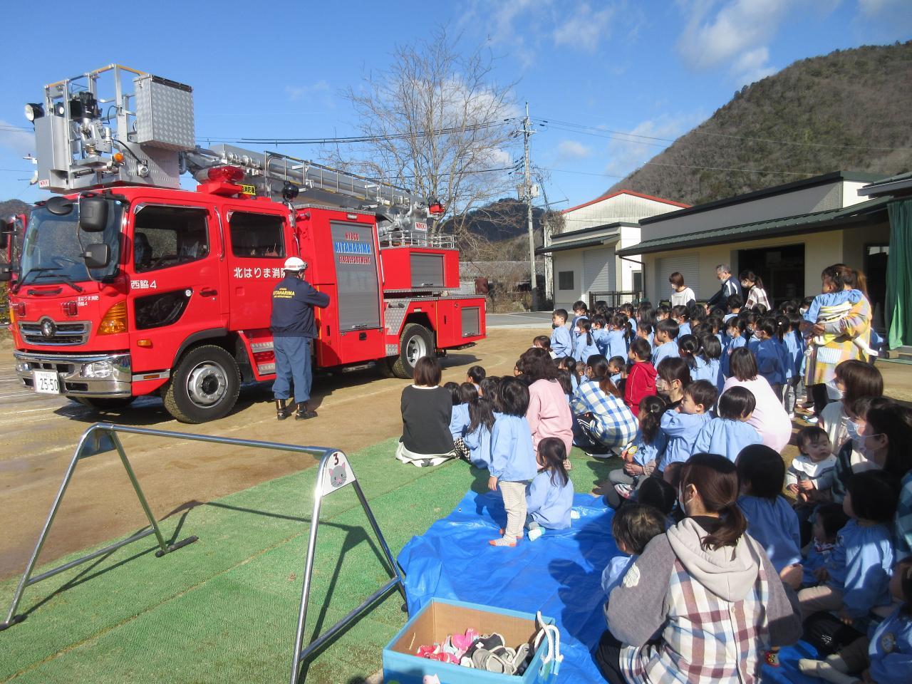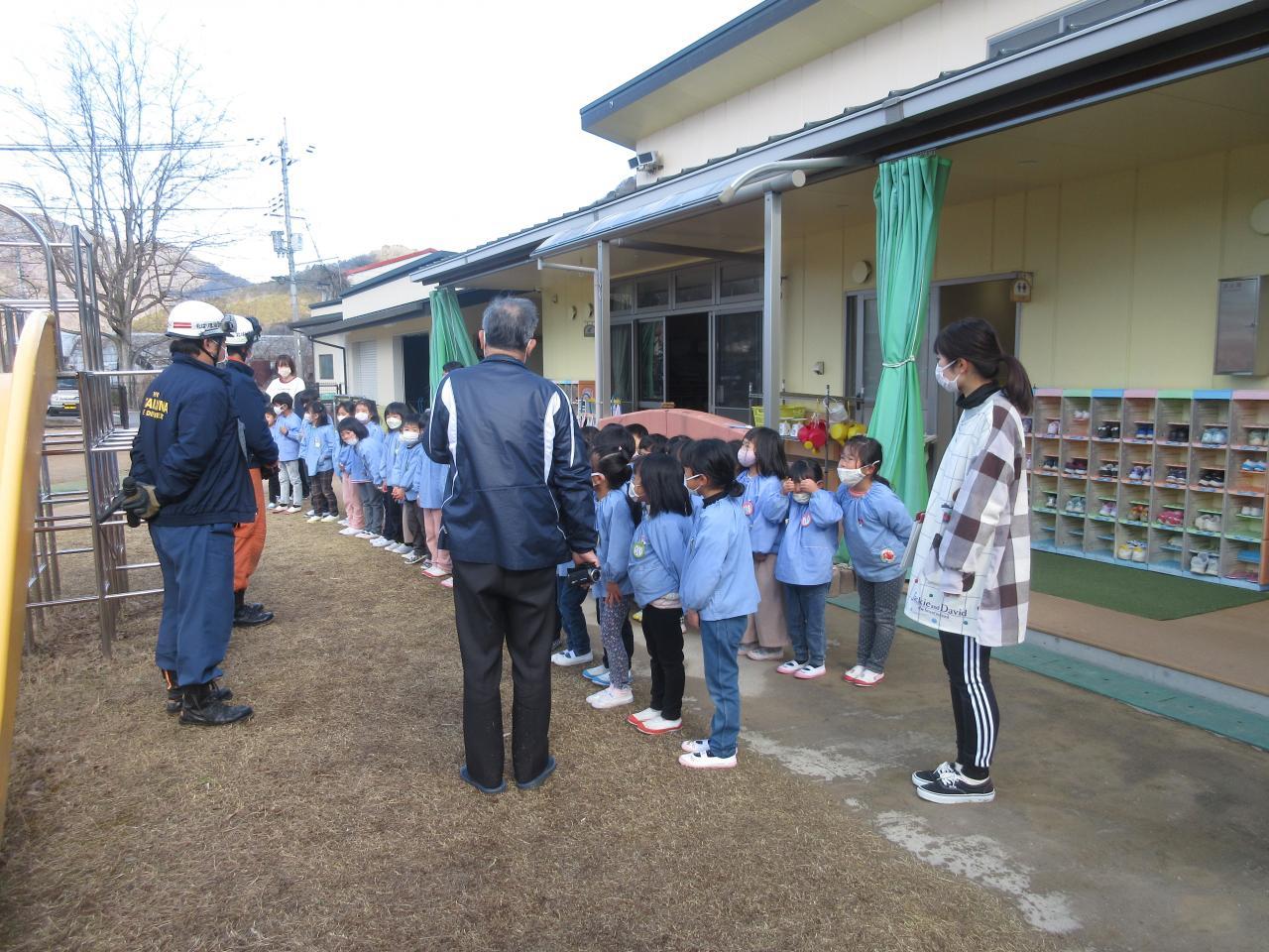 西脇消防署の指導で、全園児の火災の避難訓練と消防教室を行いました。各クラスから運動場に避難しました。避難の行動は9月に防災訓練時に行っているので、スムーズに避難ができました。特に0・1歳児は先生たちが抱えて避難したりベビーカーでの移動したりして大掛かりになりますが、子ども達の命を守るための訓練を熱心に取り組みました。