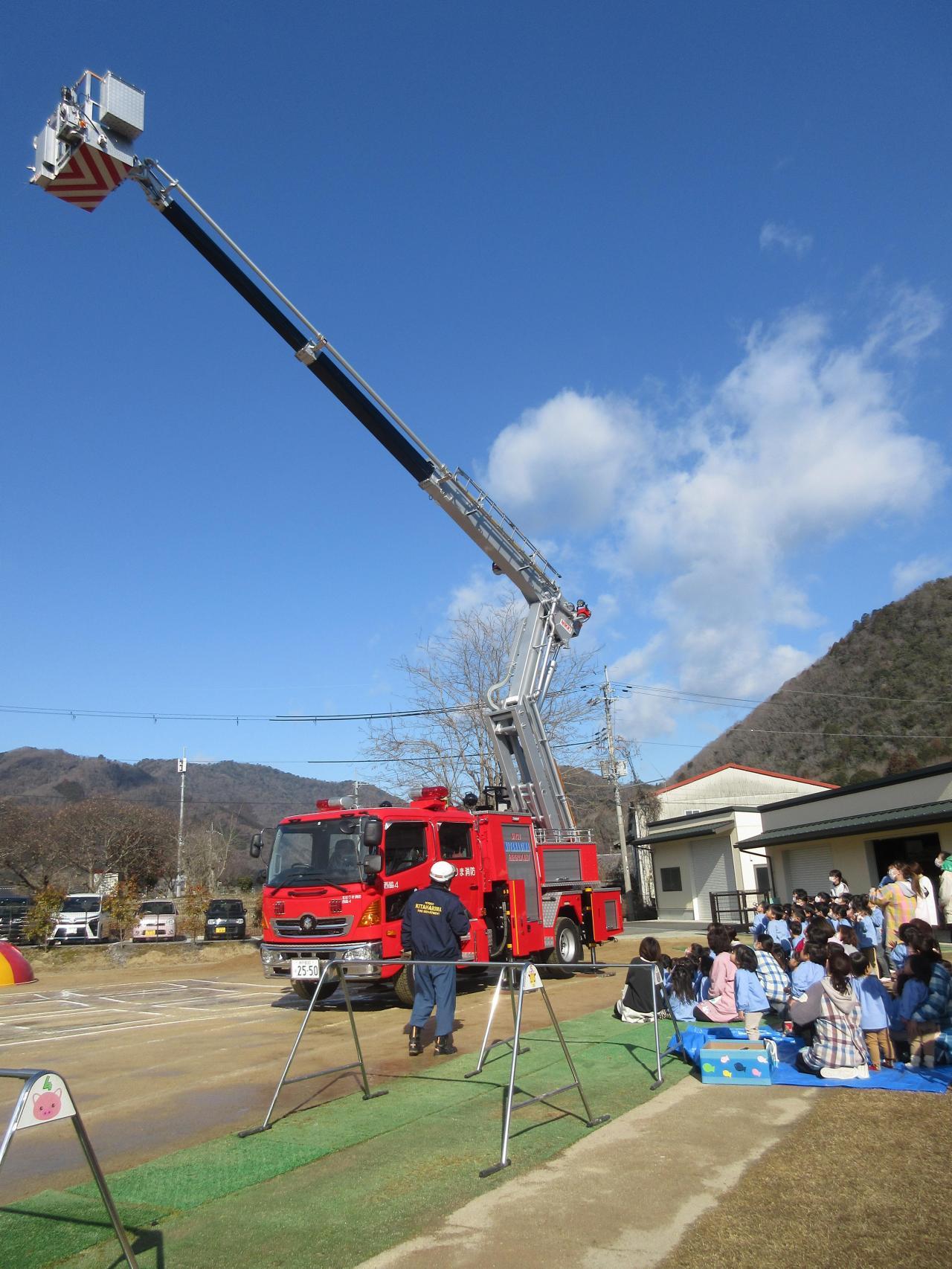 「おはしも」の言葉の意味を消防署員からの確認や避難時に気を付けることなどを話してもらい、真剣に聞いました。消防車は大きなはしご車がやってきました。梯子の動きに歓声です。