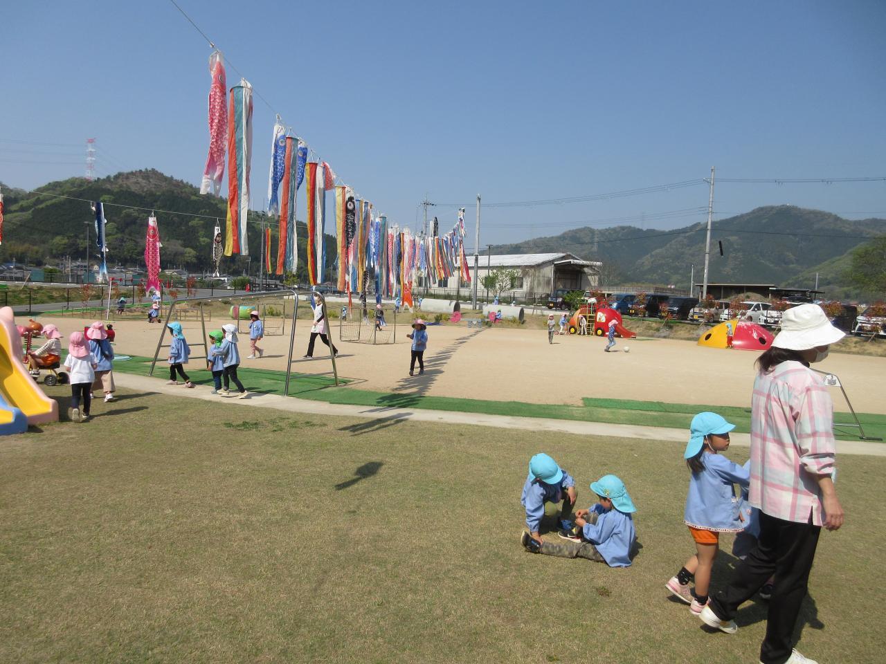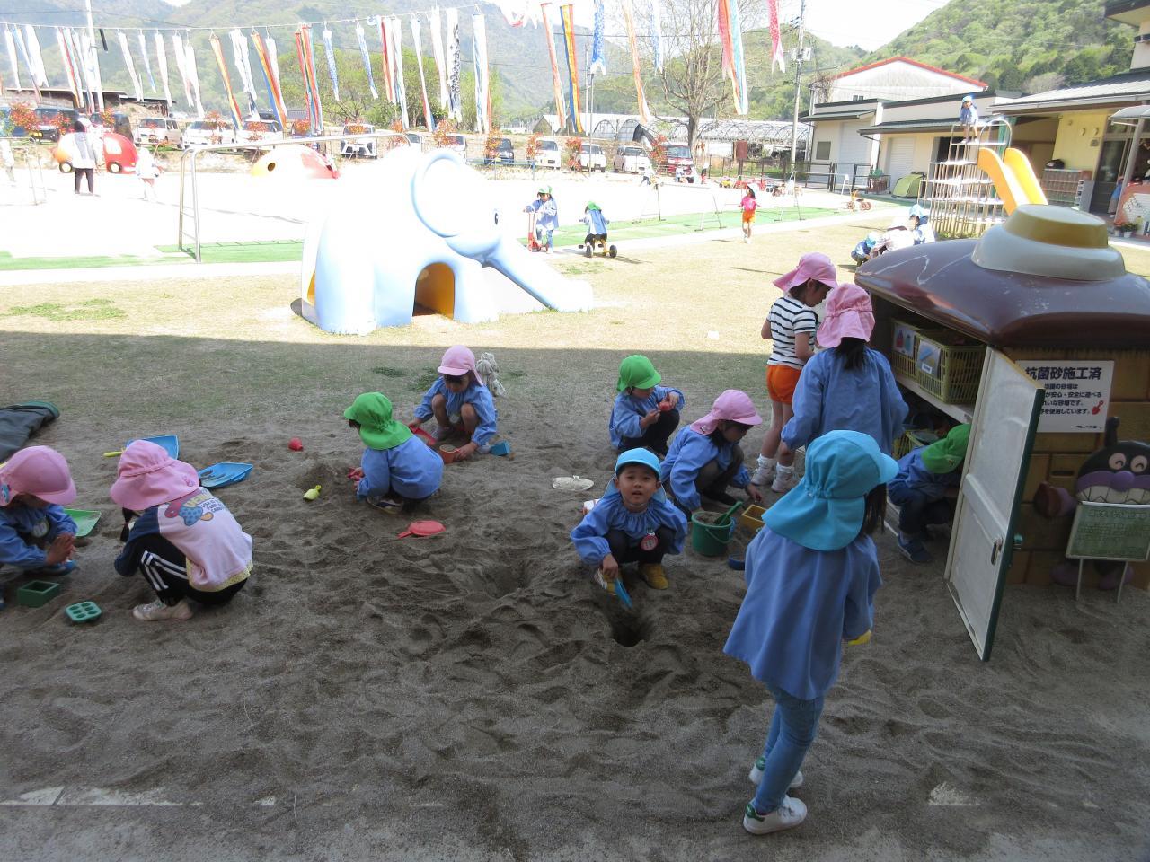 今は園庭に大きなこいのぼり群が12匹なびき、小さなこいのぼりが約100匹なびいています。そんな運動場では、3歳未満児は芝生広場で砂場あそび、スケート乗り、滑り台などで遊びに夢中です。3歳児以上は広い運動場をいっぱい使っブランコやトンネル、小山の砂遊びやボールけりなど思い思いの遊びに熱中しています。園生活にゆっくり慣れていく毎日です。