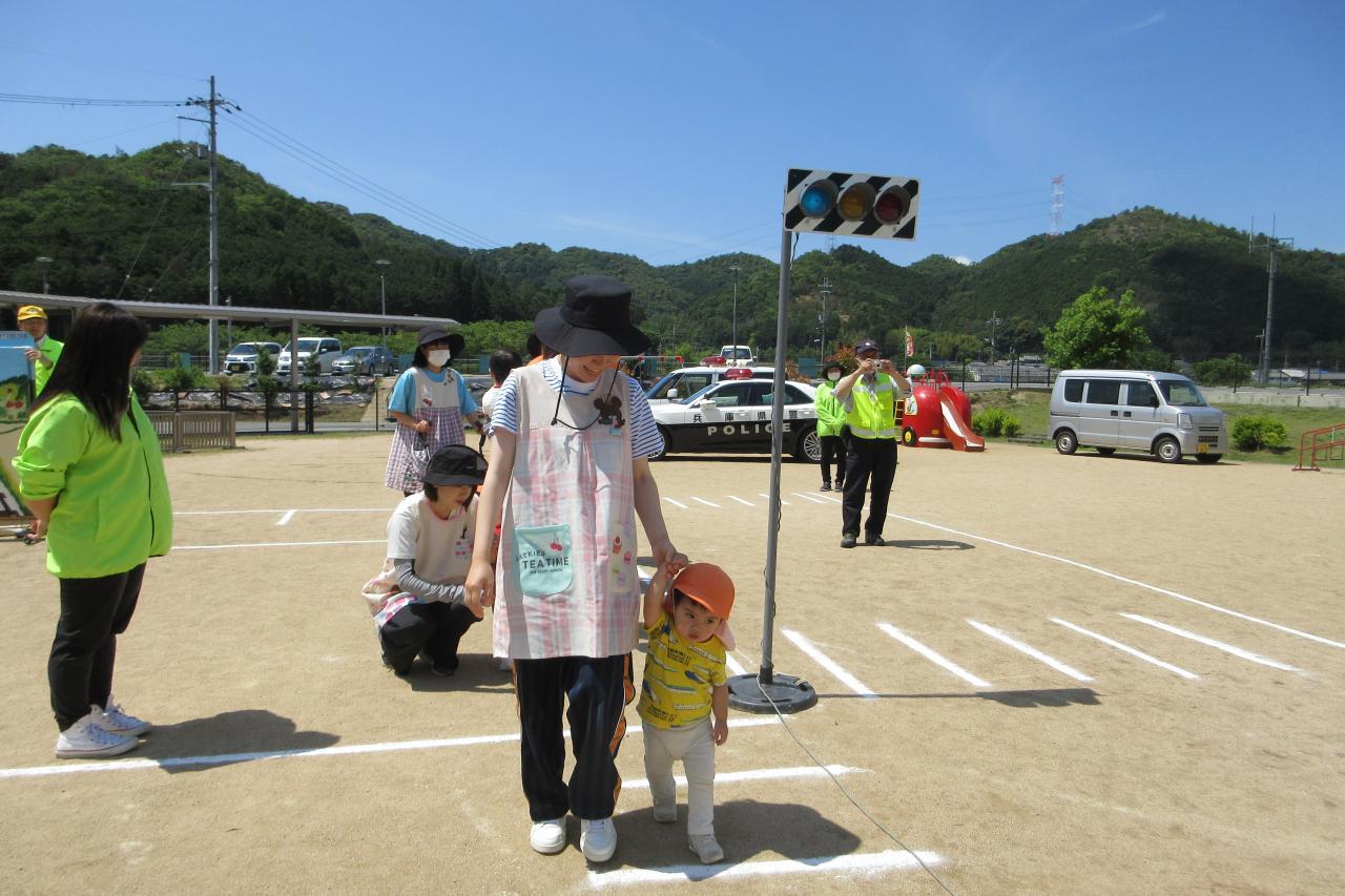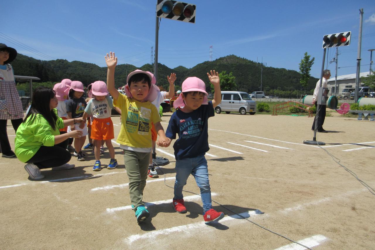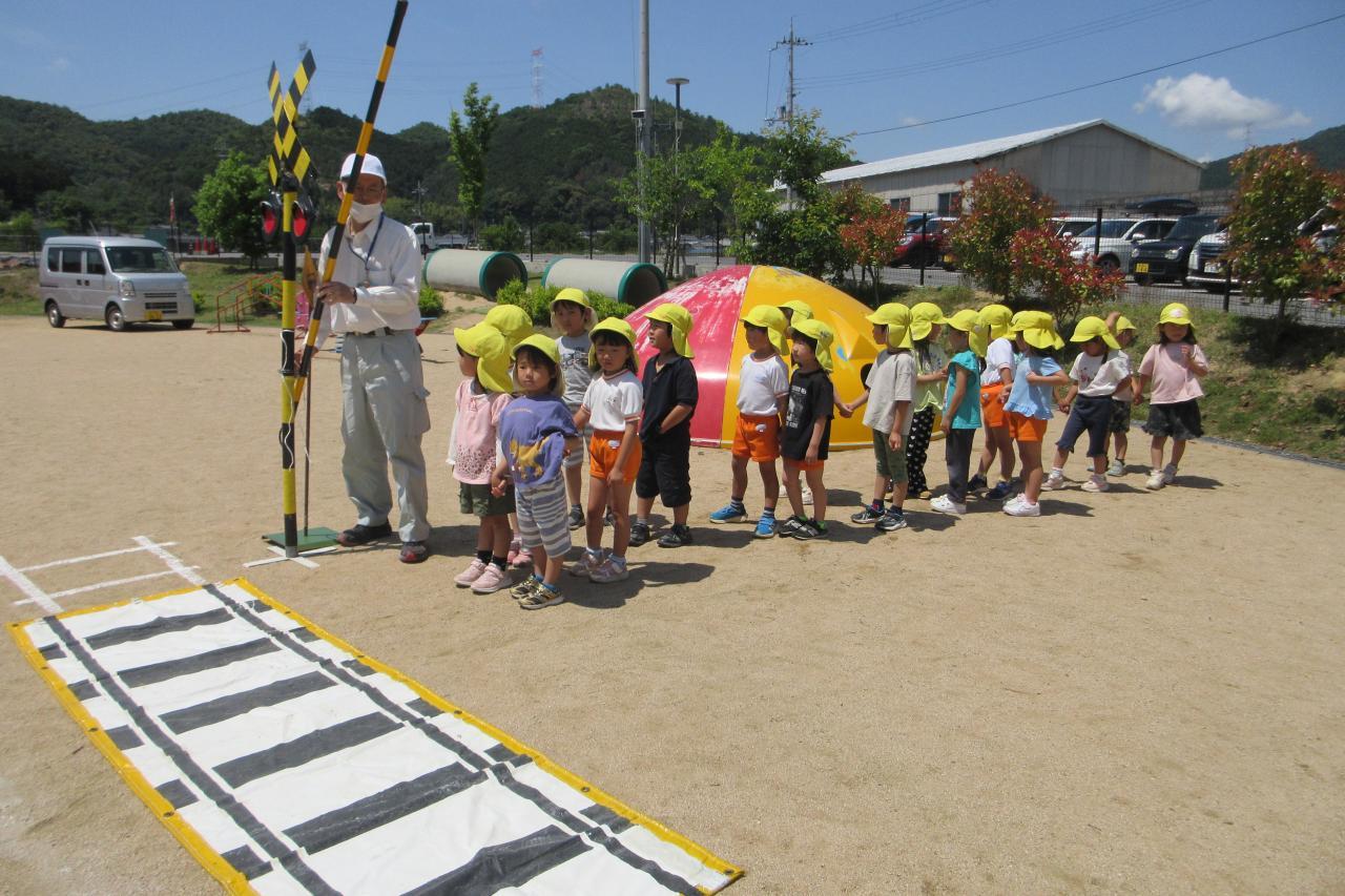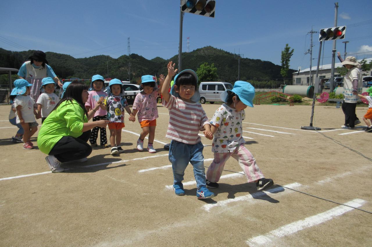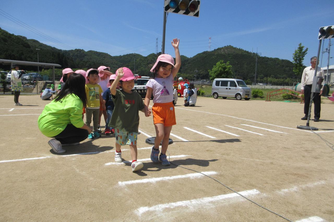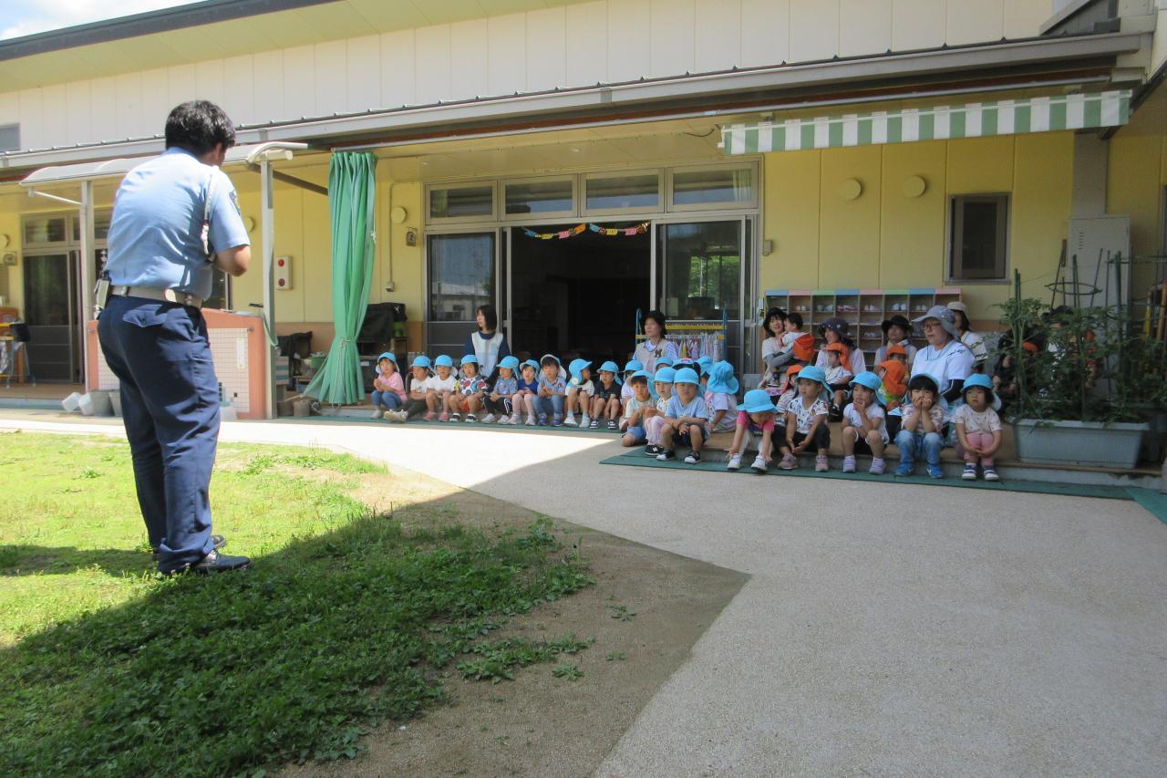 5月28日(水) に交通安全教室を行いました。西脇警察署のお巡りさんのお話を聞き、実際に横断歩道を渡る練習をしました。