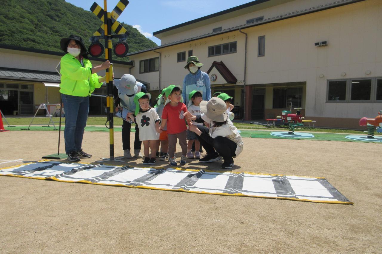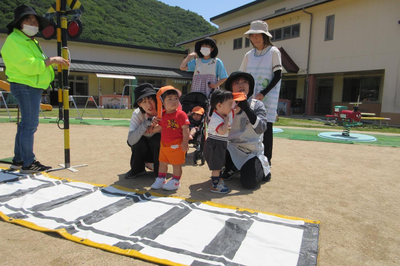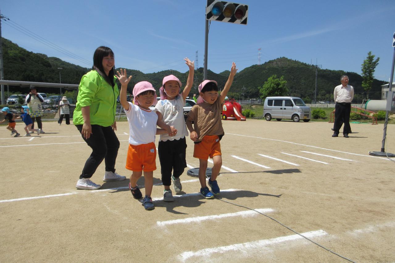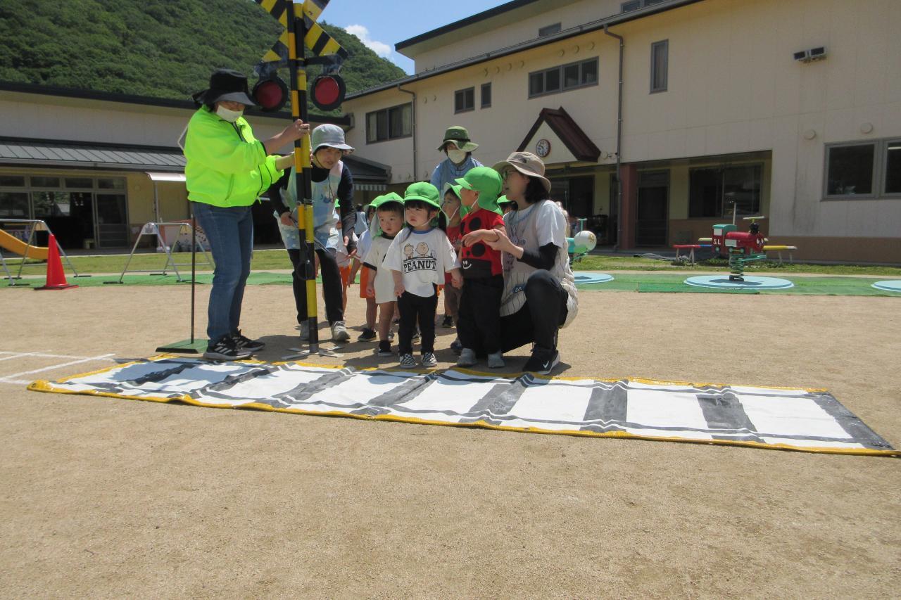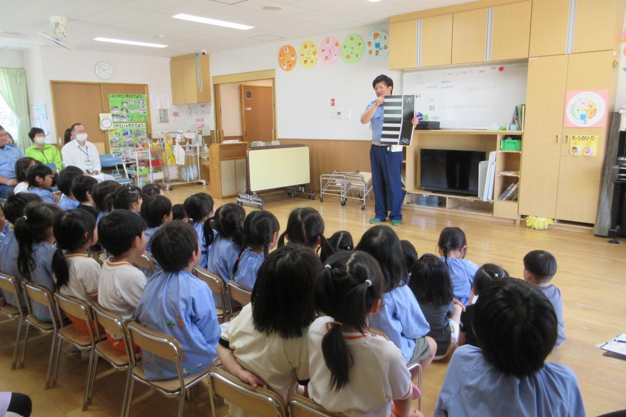 5月28日(水) に交通安全教室を行いました。西脇警察署のお巡りさんのお話を聞き、実際に横断歩道を渡る練習をしました。