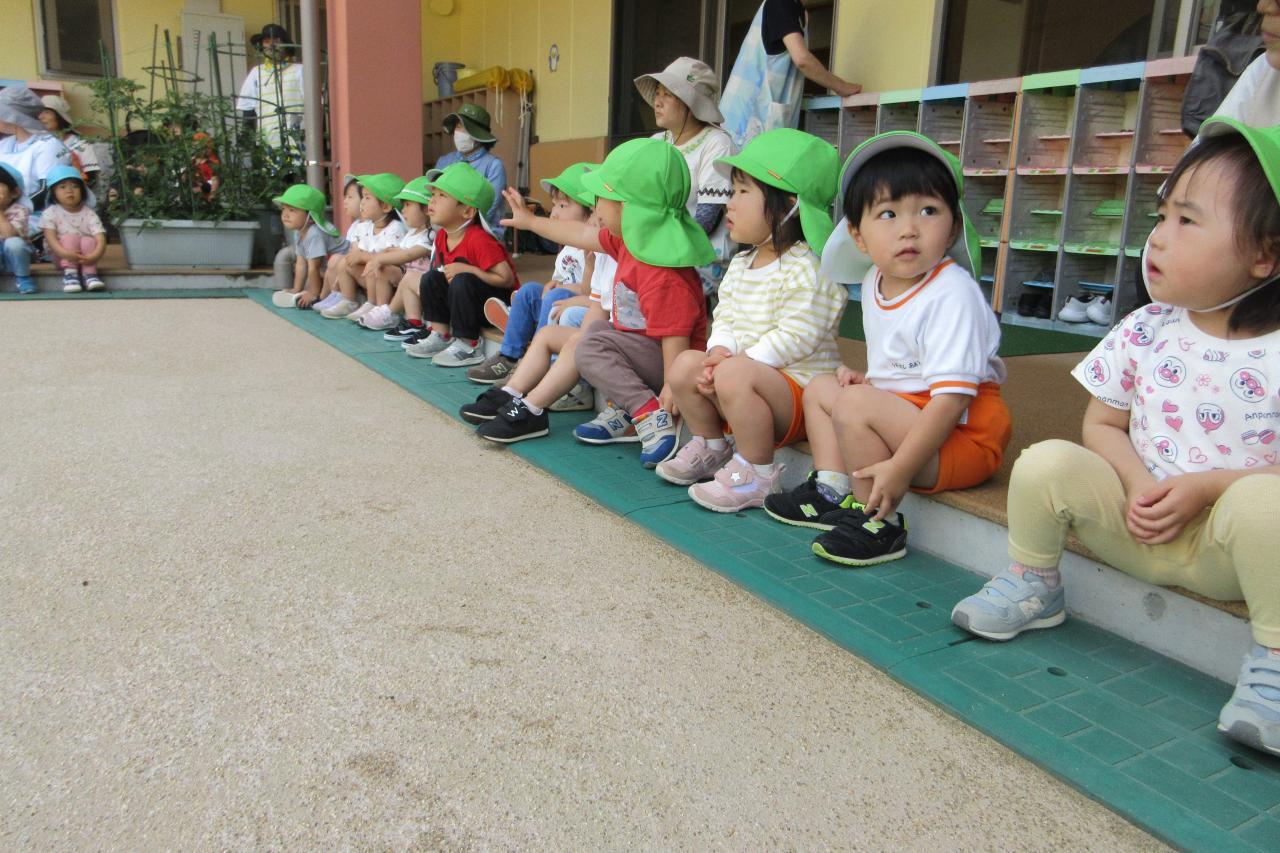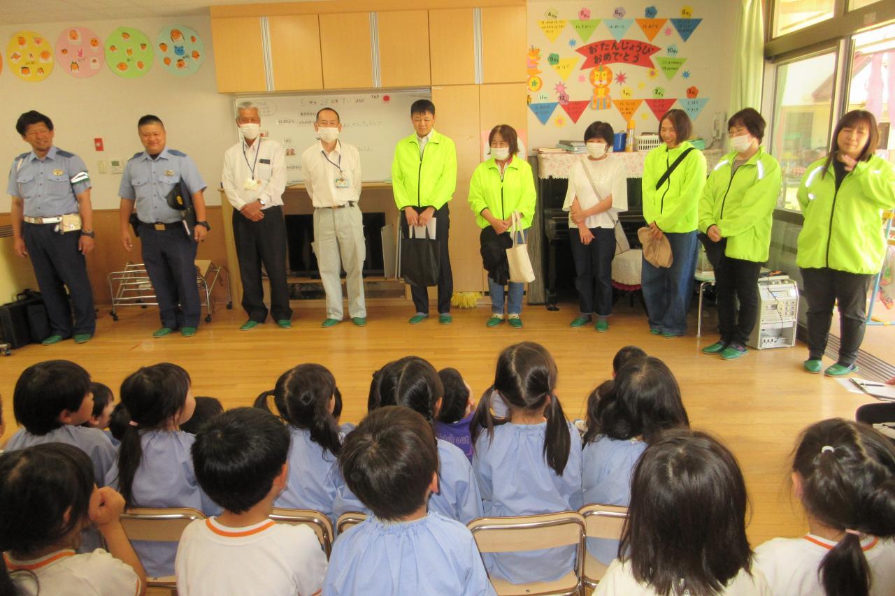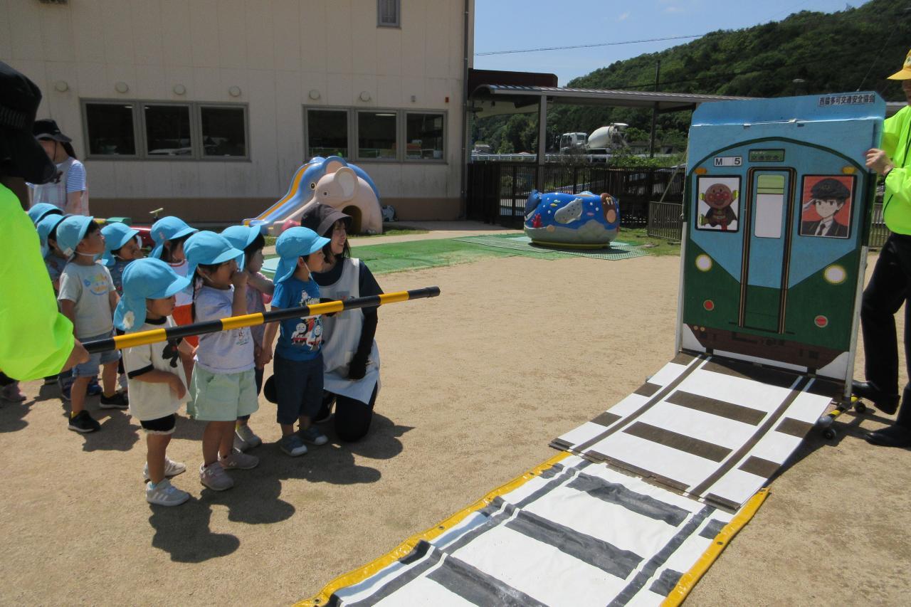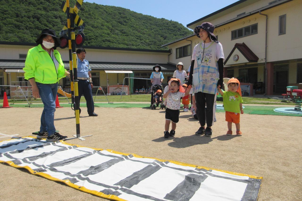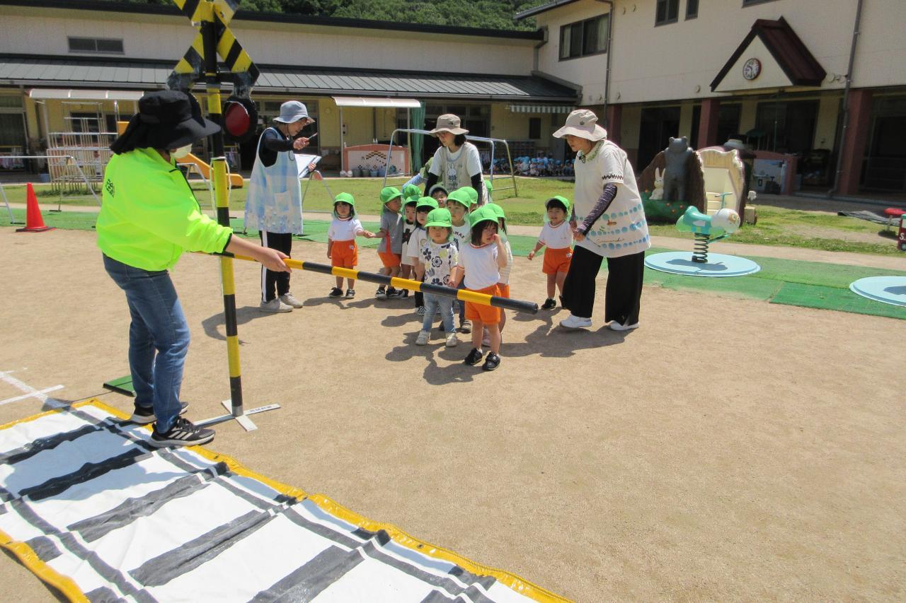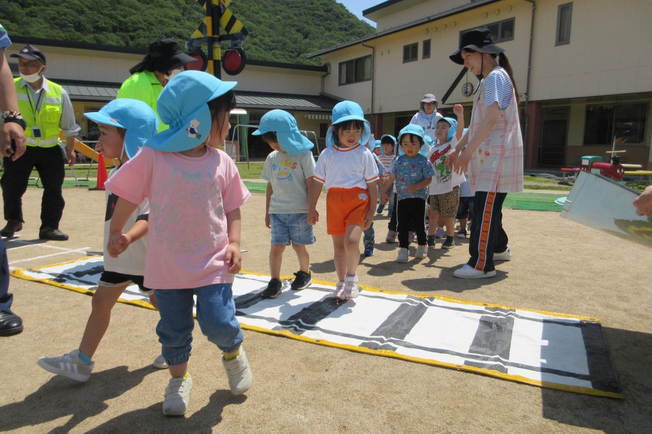 5月28日(水) に交通安全教室を行いました。西脇警察署のお巡りさんのお話を聞き、実際に横断歩道を渡る練習をしました。
