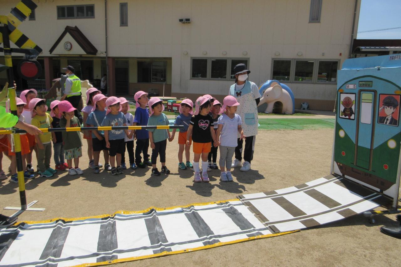 すみれ組はお友だちと手をつないで仲良く渡ることができました。踏切では、電車が来ると「アンパンマン乗ってる!」と喜んでいました。