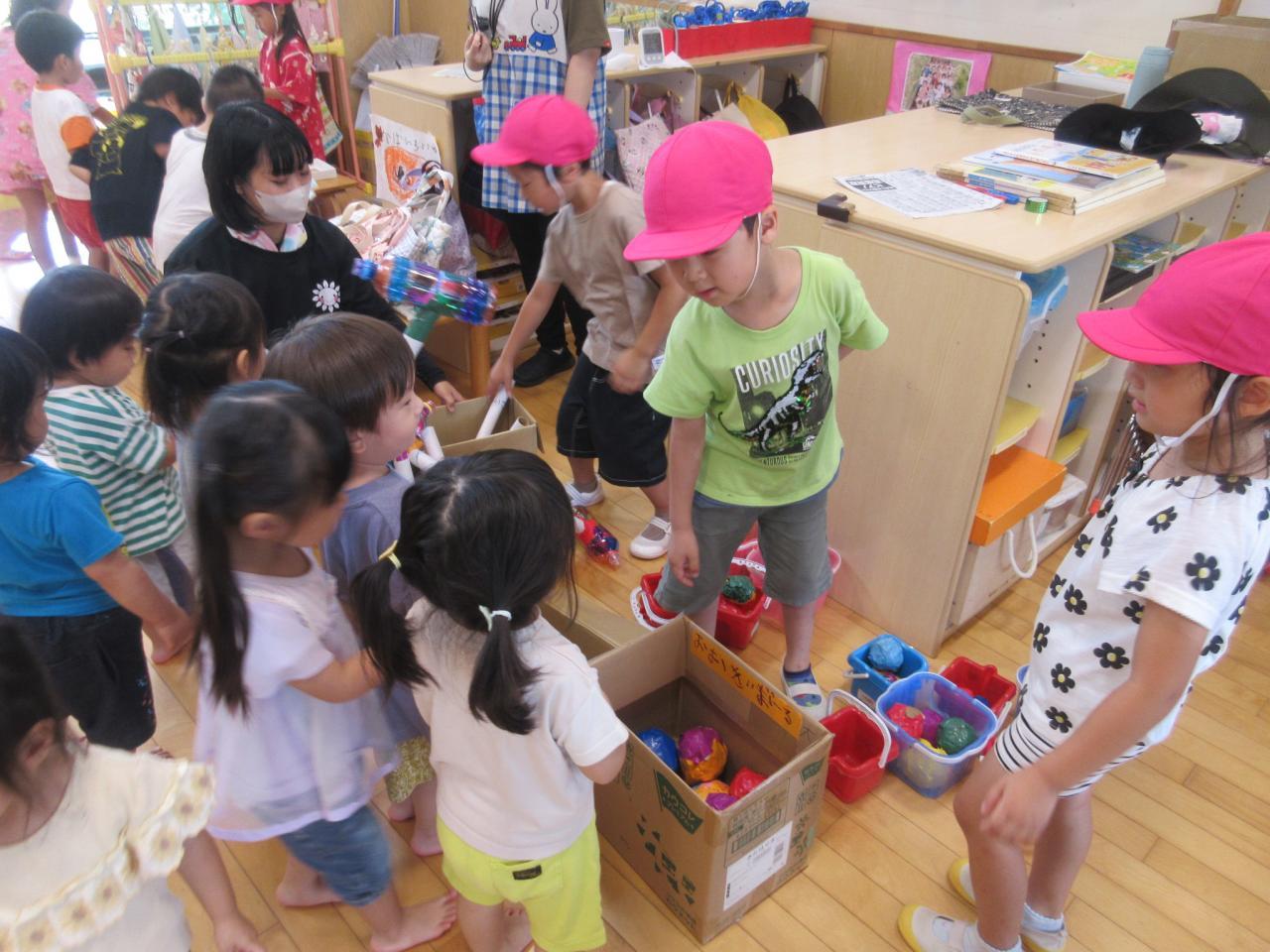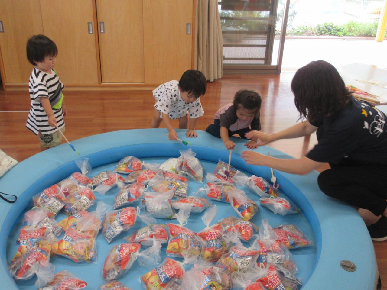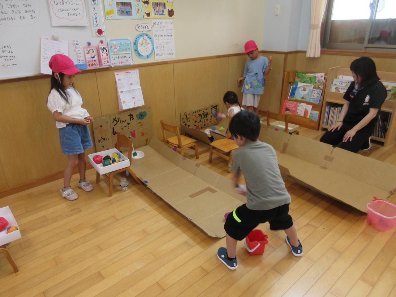 5歳児が3・4歳児のサポートをしながら、ボールすくいや的当て、輪投げ、おかしつり、5歳児が考えた「くまカントリークラブ」・・・いろんなお店をまわって大喜び!!