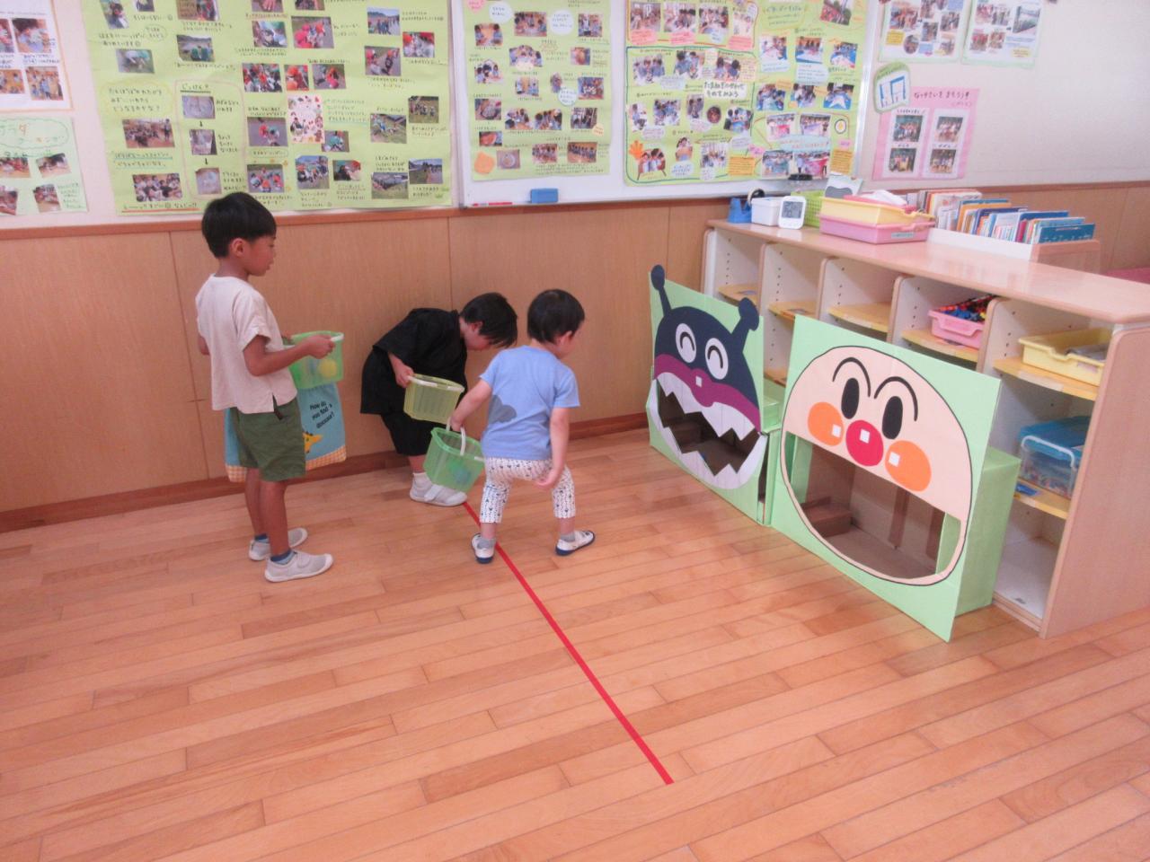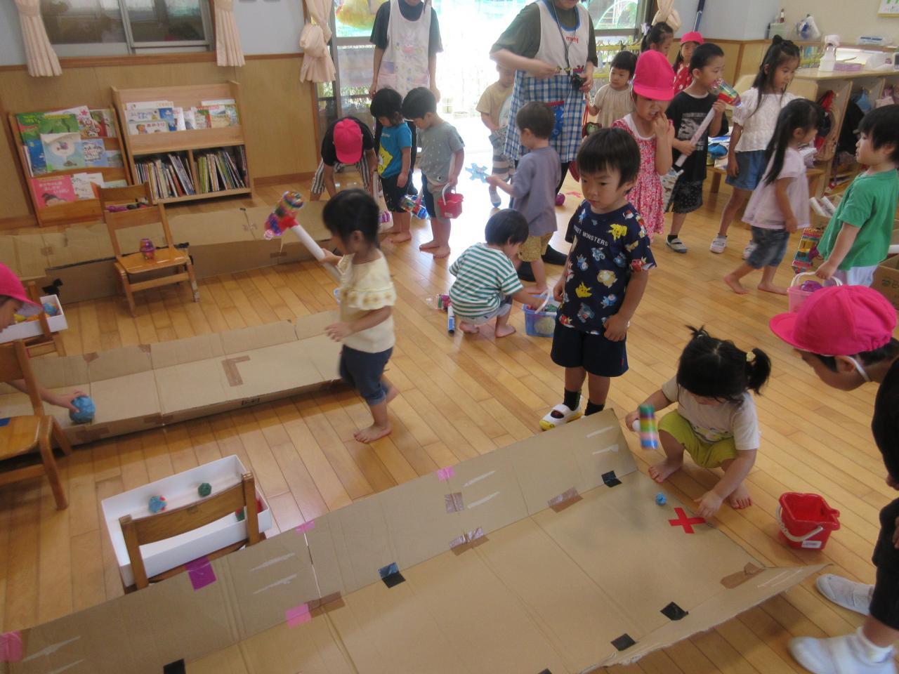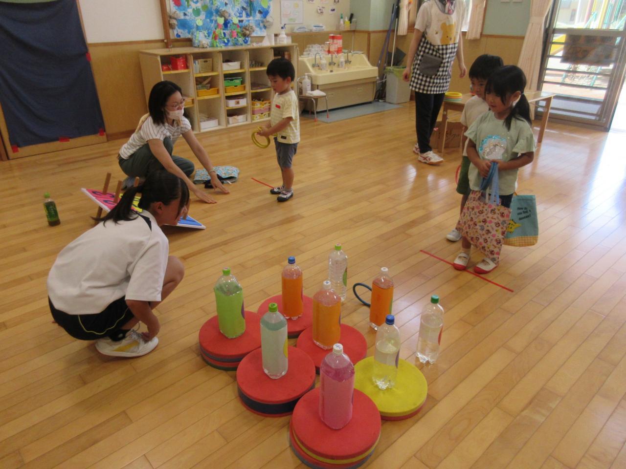 5歳児が3・4歳児のサポートをしながら、ボールすくいや的当て、輪投げ、おかしつり、5歳児が考えた「くまカントリークラブ」・・・いろんなお店をまわって大喜び!!
