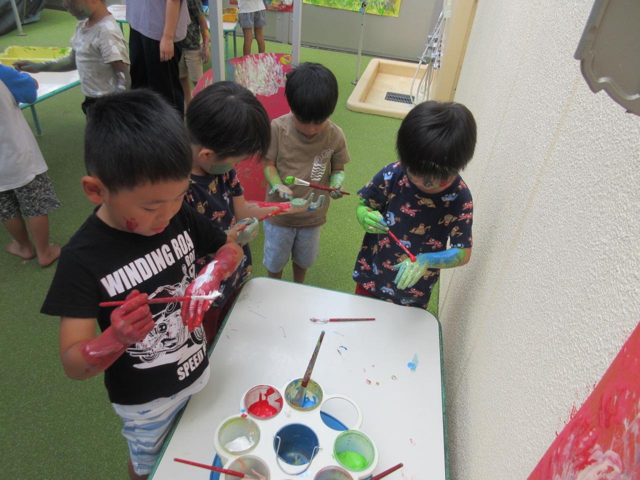 手形を押したり、ボディペインティング用の絵の具でお化粧やネイルをしたり、体に絵の具を塗ったり・・・