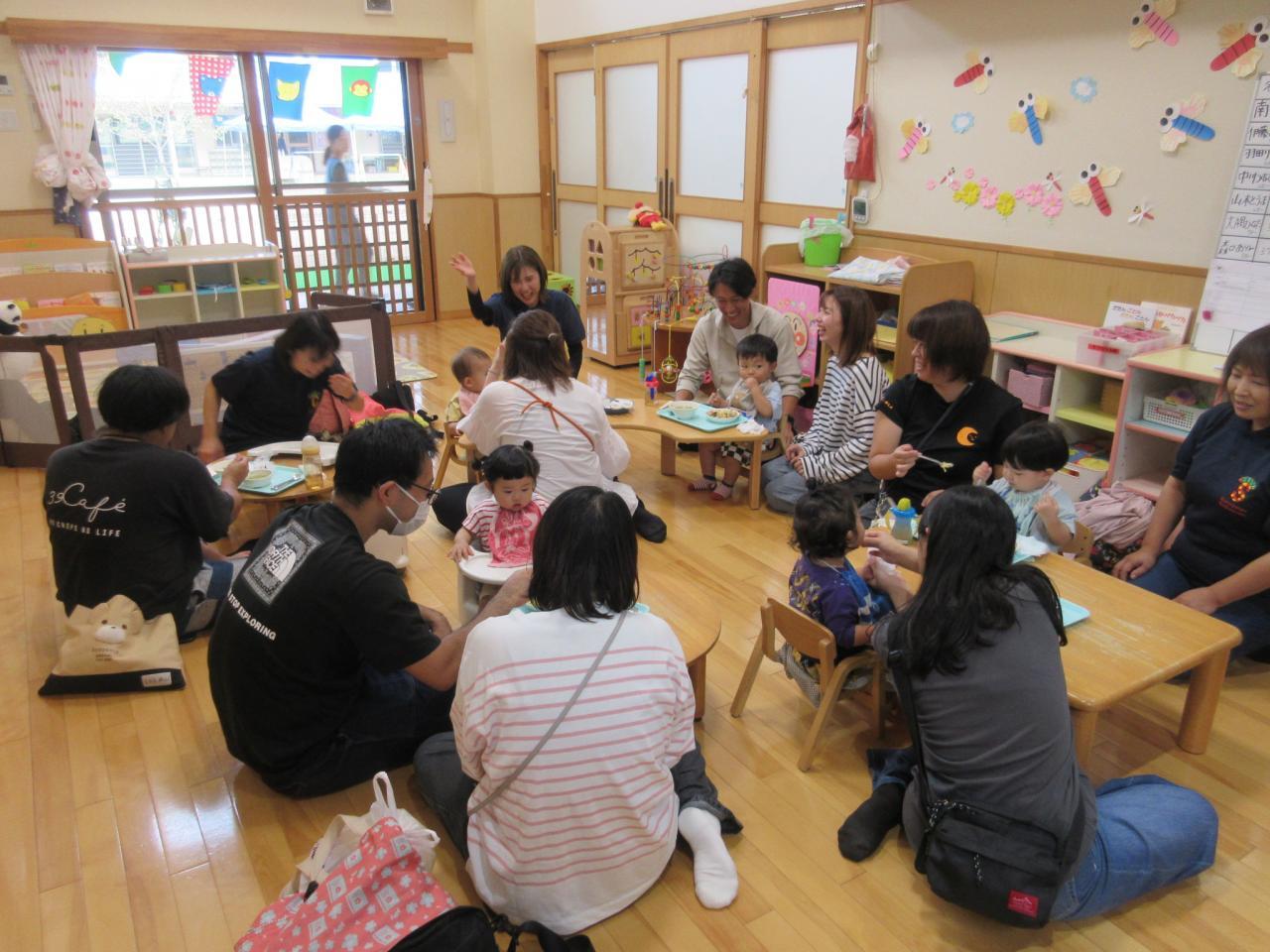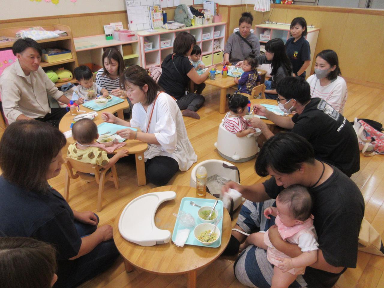おうちの人と一緒にミニ運動会を楽しんだあと、給食参加を行い、園での給食の形状を見ていただいたり、おうちの方に給食を食べさせていただいたりして楽しい時間を過ごしました✨
