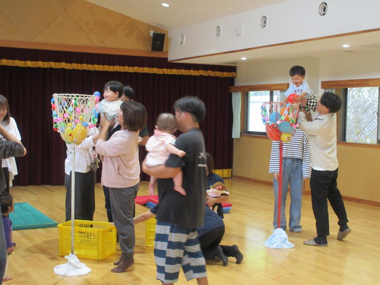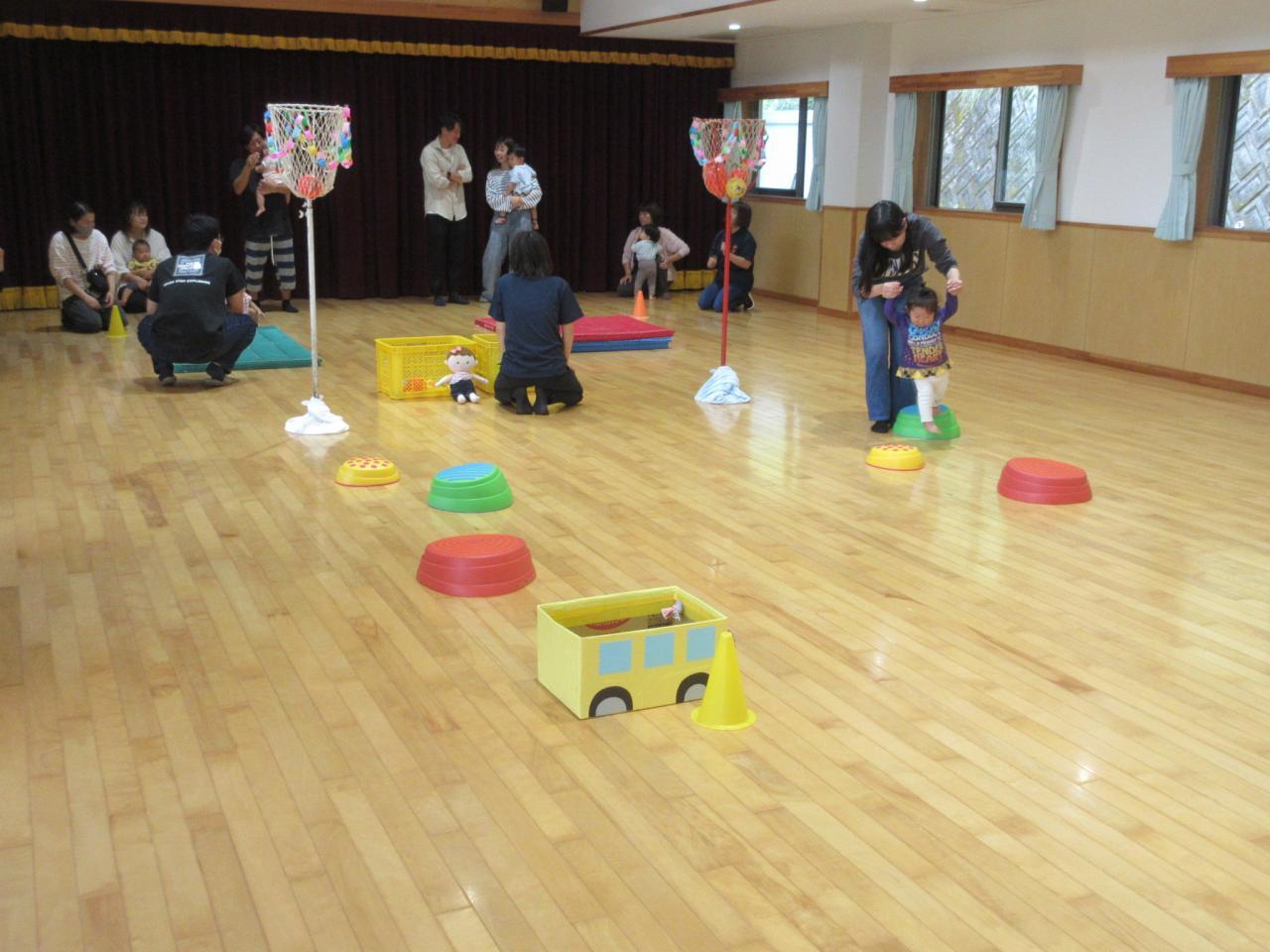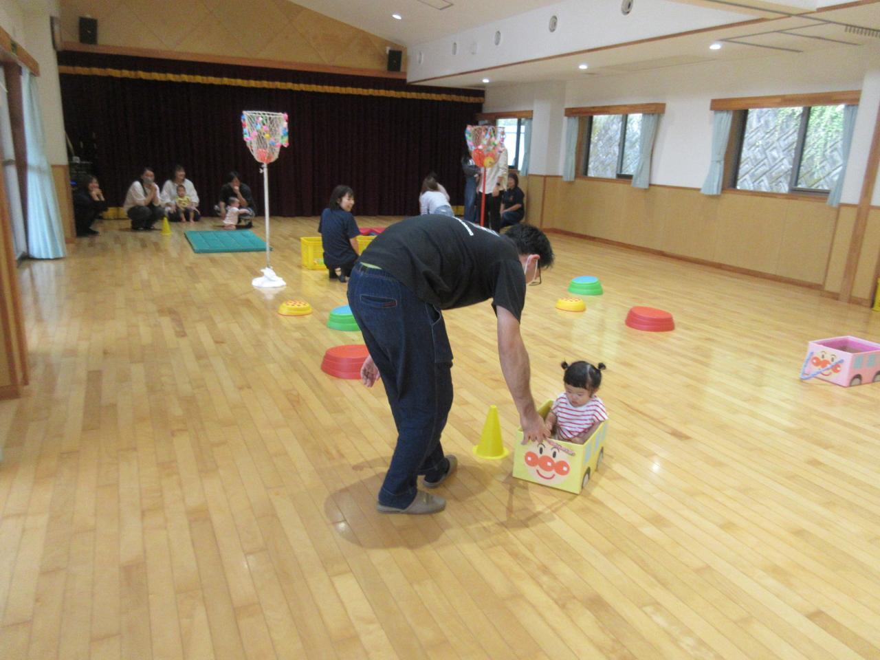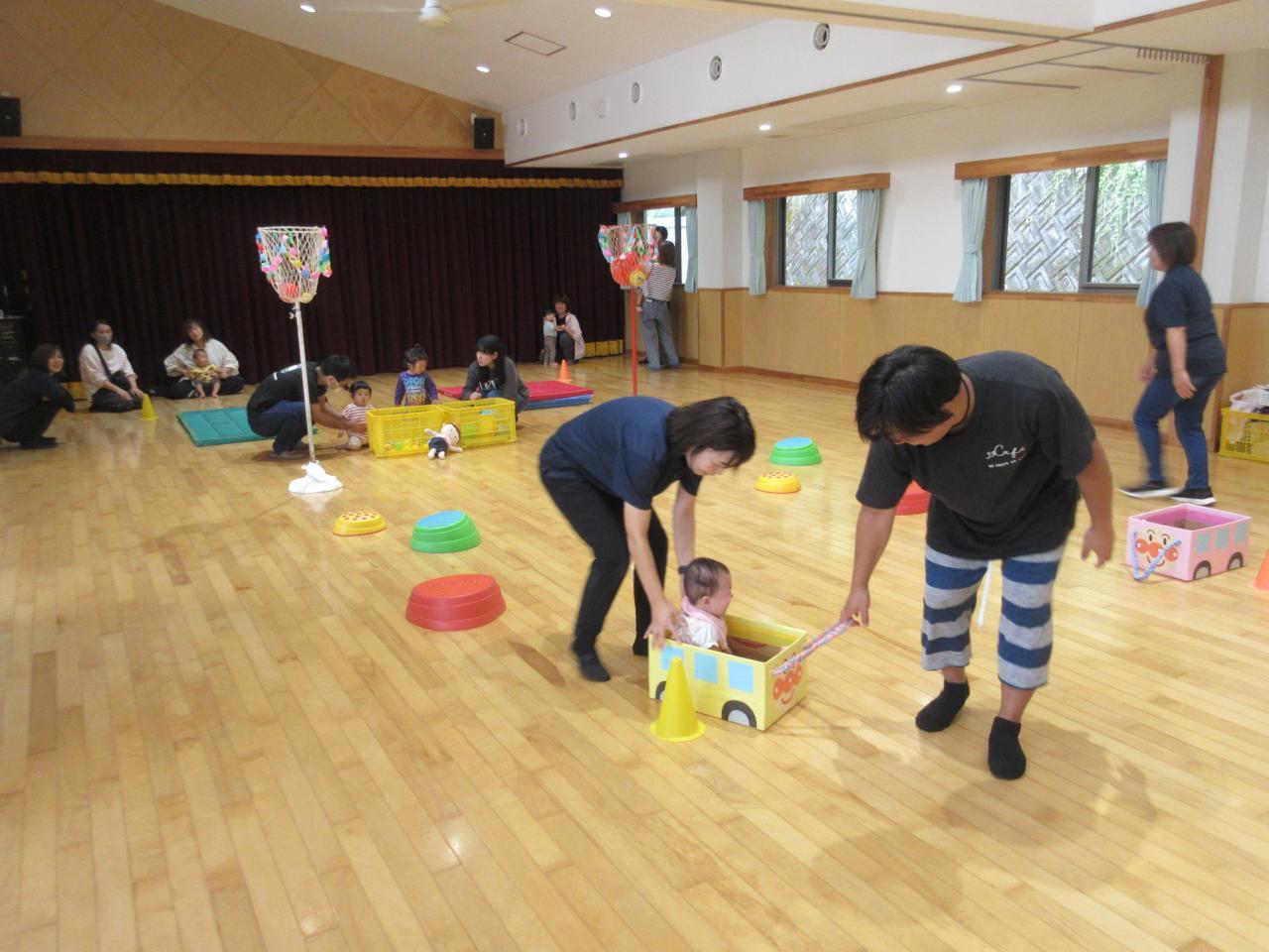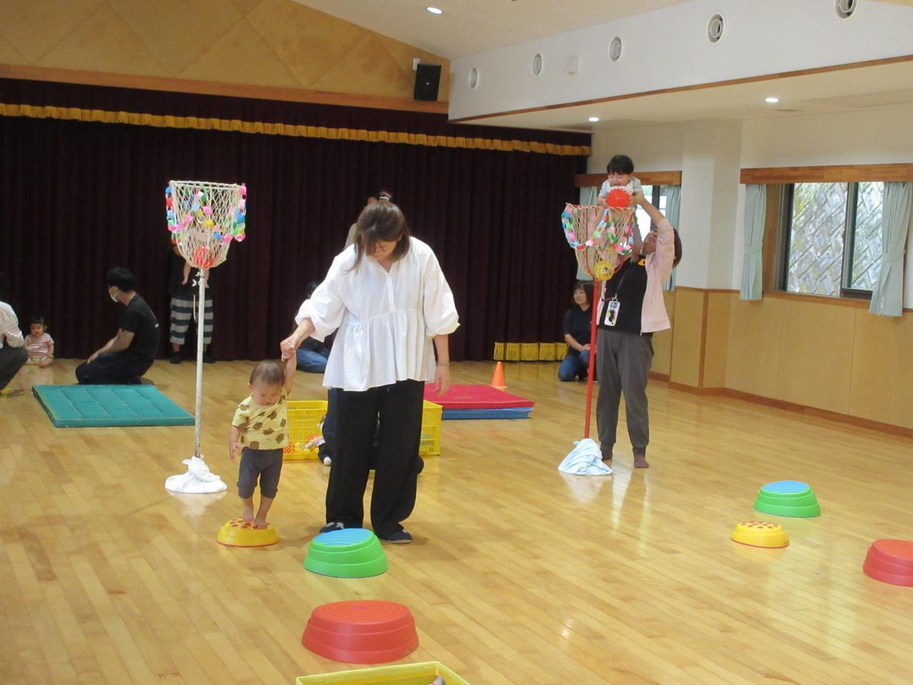 ボールをカゴに入れたり、小さな段に登ったり、段ボールカーに乗ったり・・・最初はちょっぴり緊張気味の子どもたちでしたが、慣れてくるとニコニコ笑顔で、おうちの人と一緒に好きな遊びを楽しんでいました😄