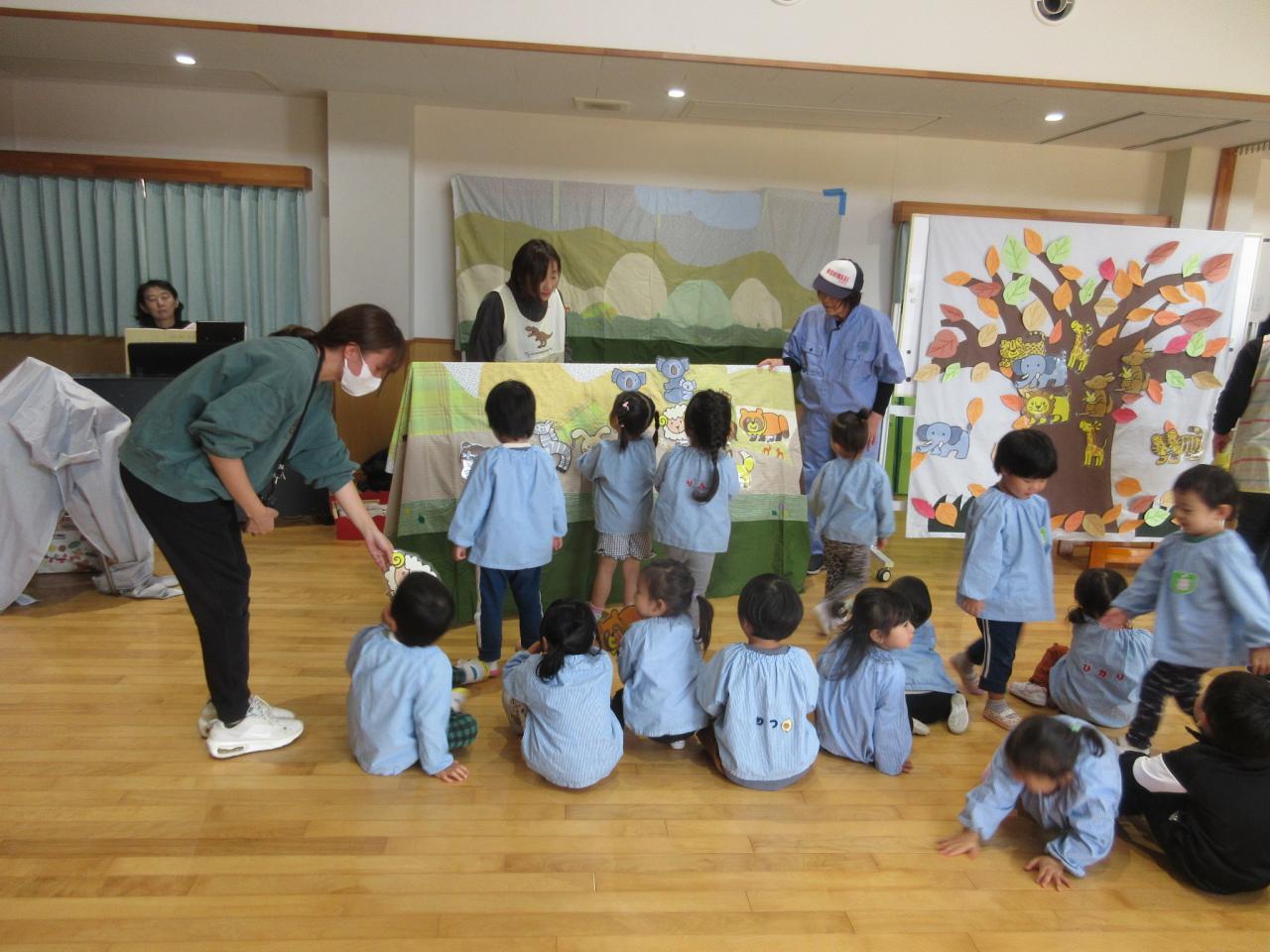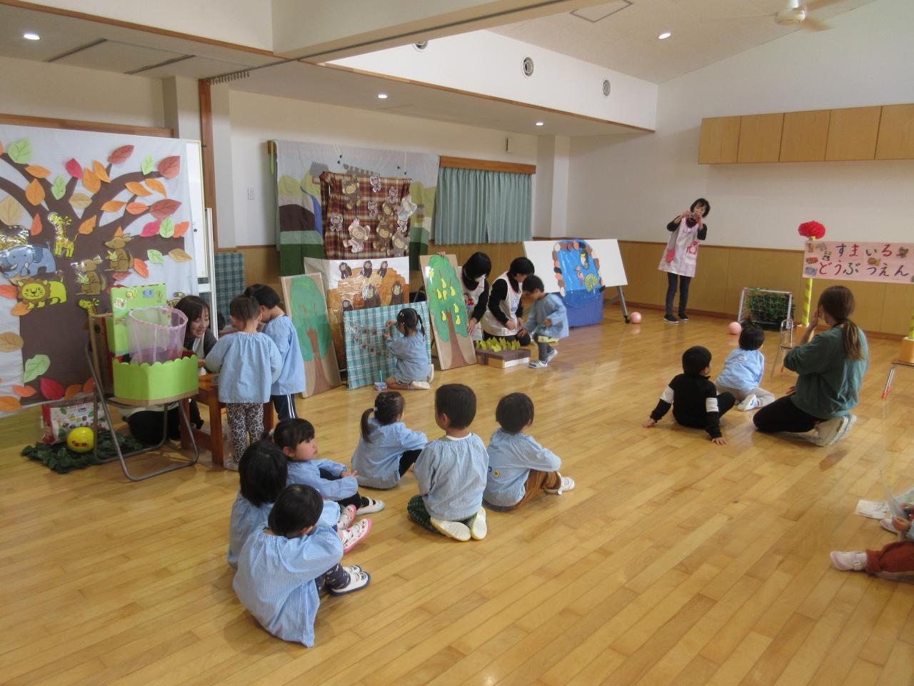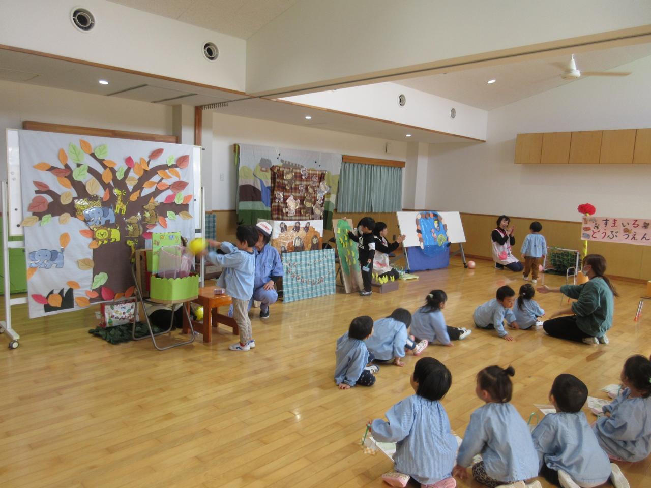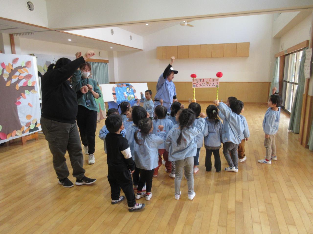 11月22日(金)は、リンクスマイルさんが来てくださり、3歳児が「すまいるどうぶつえん」のお話で一緒にあそびました😄
