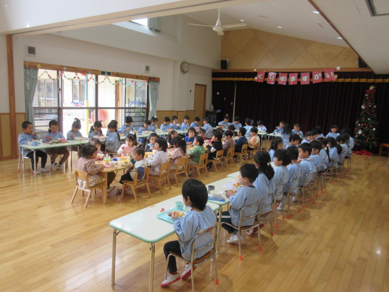 ぱんだ・きりん・ぞう・くま組は遊戯室で一緒に食べました😄