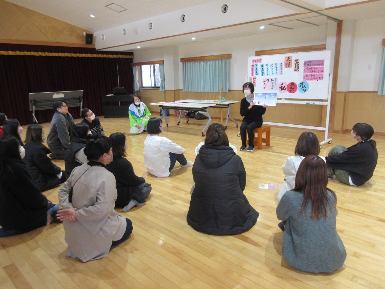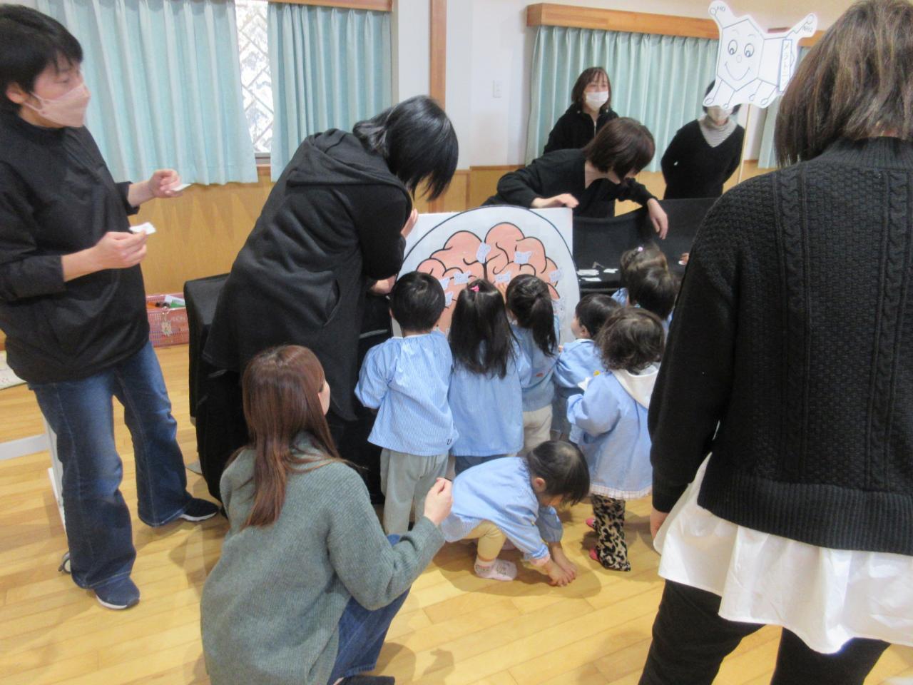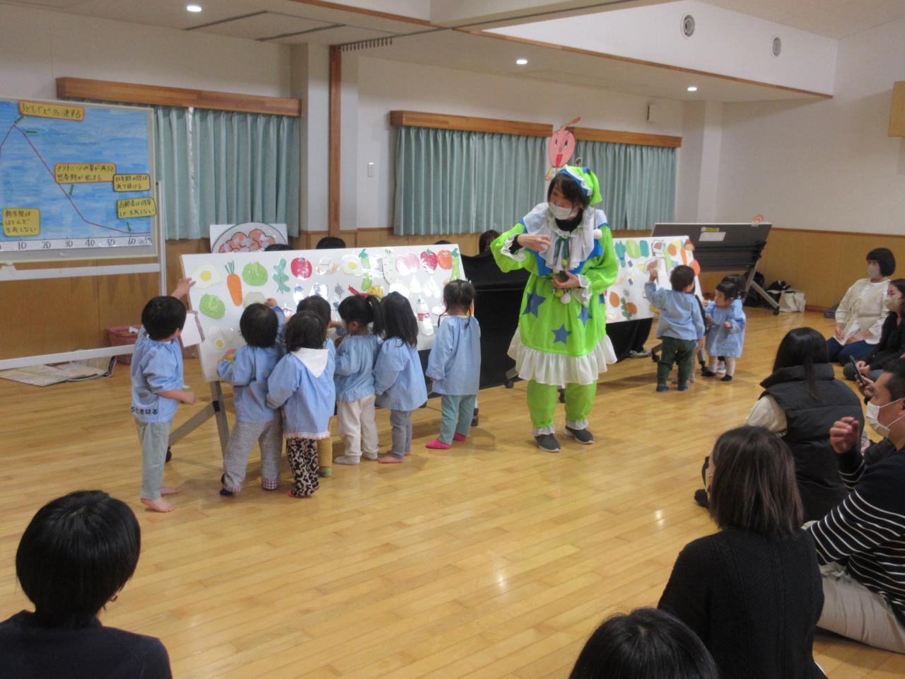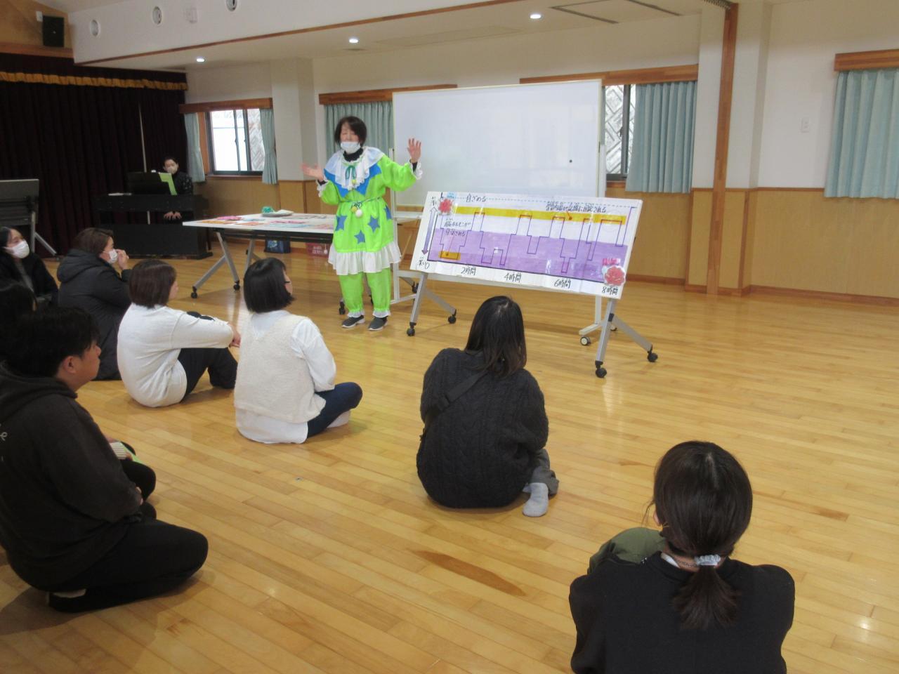 後半は遊戯室へ移動して、マザーズスマイル親子交流に参加していただきました😄マザーズスマイルさんが「食育・睡眠」について、分かりやすくお話してくださいましたよ✨