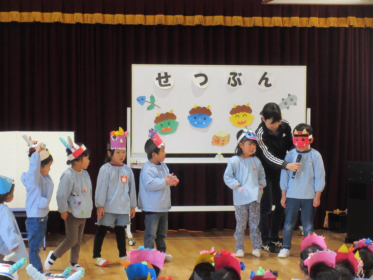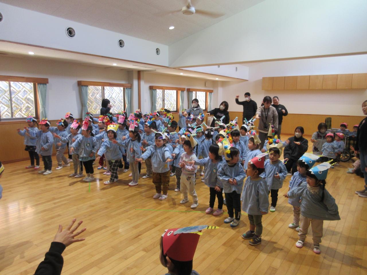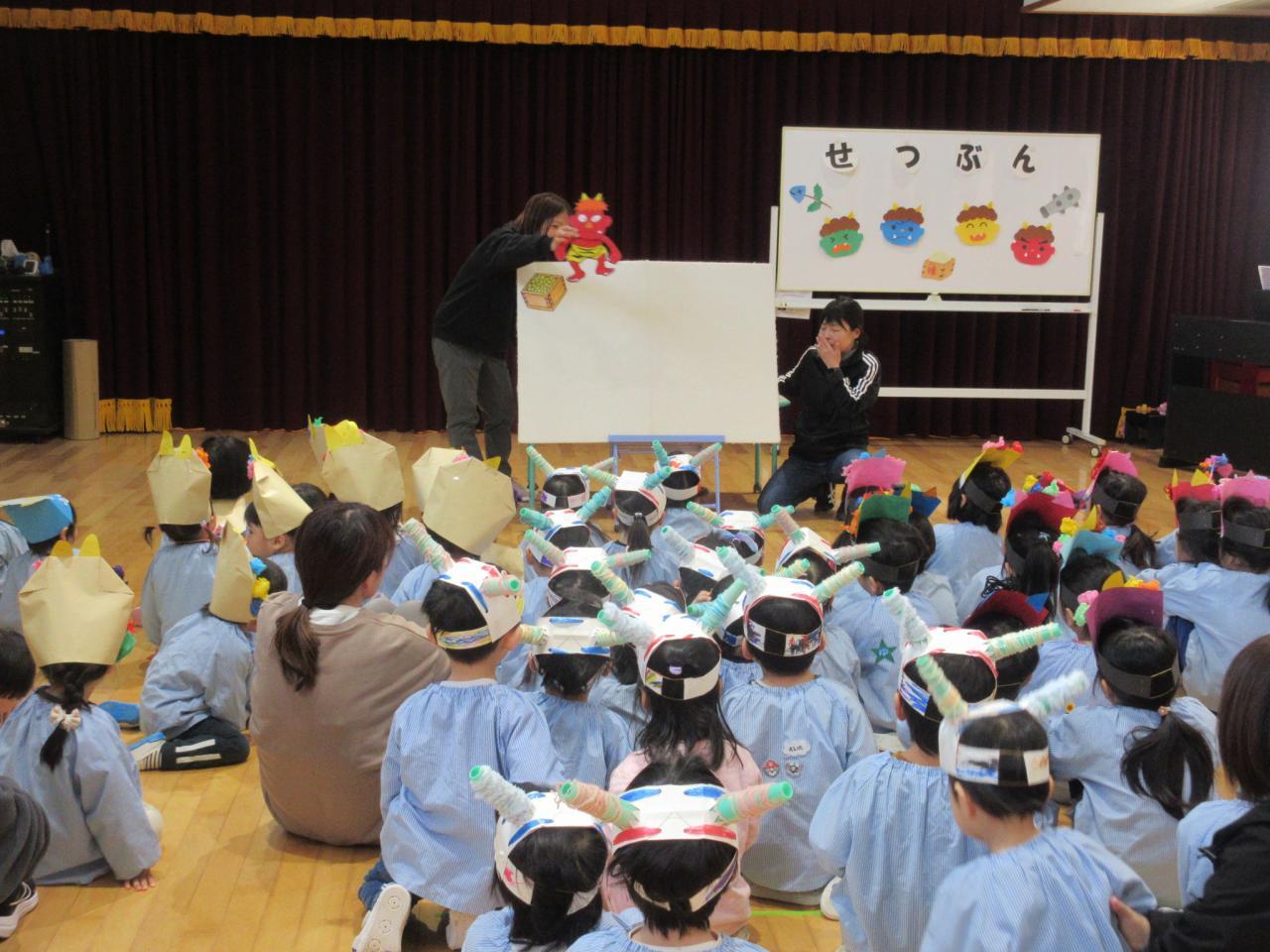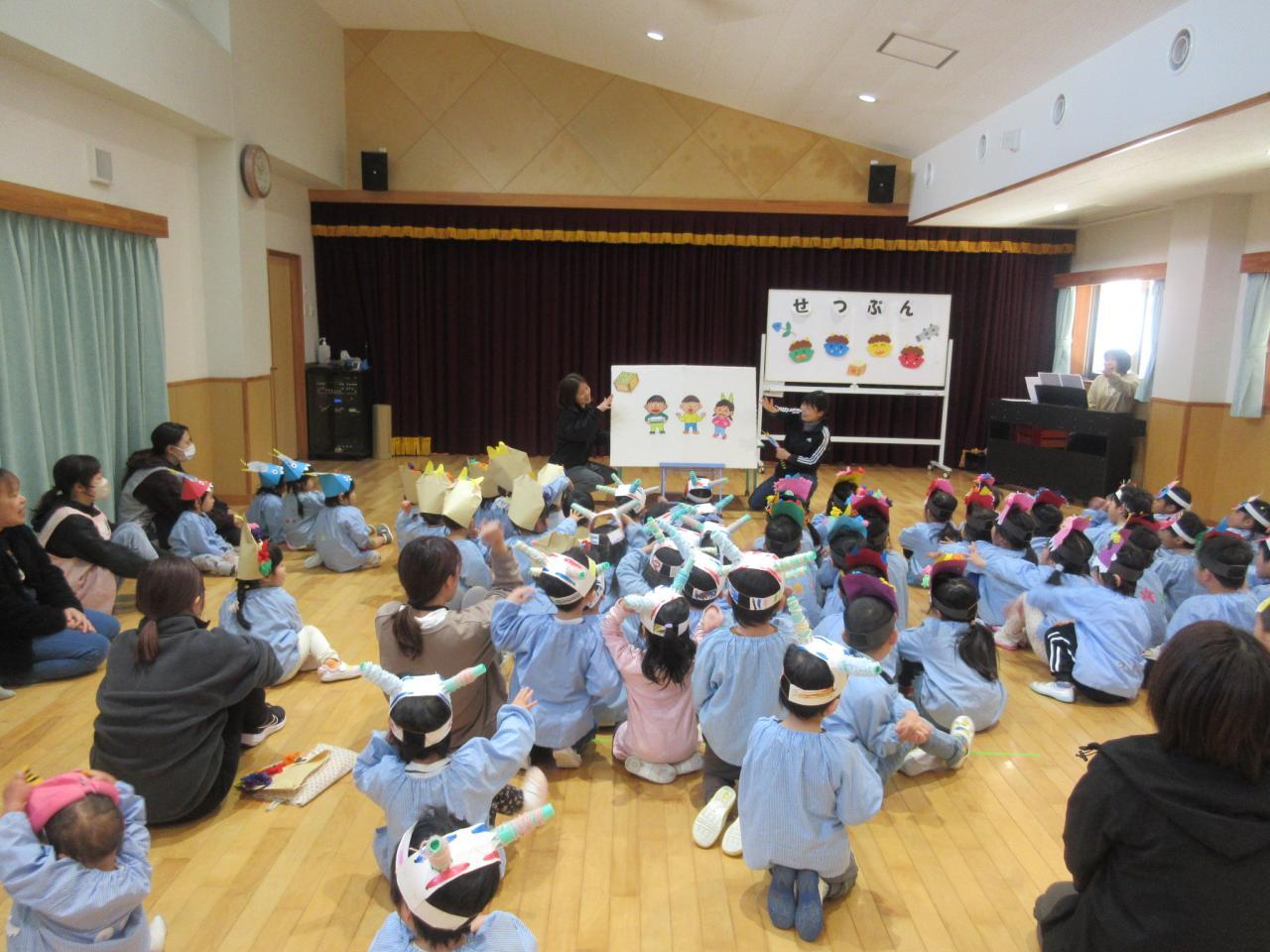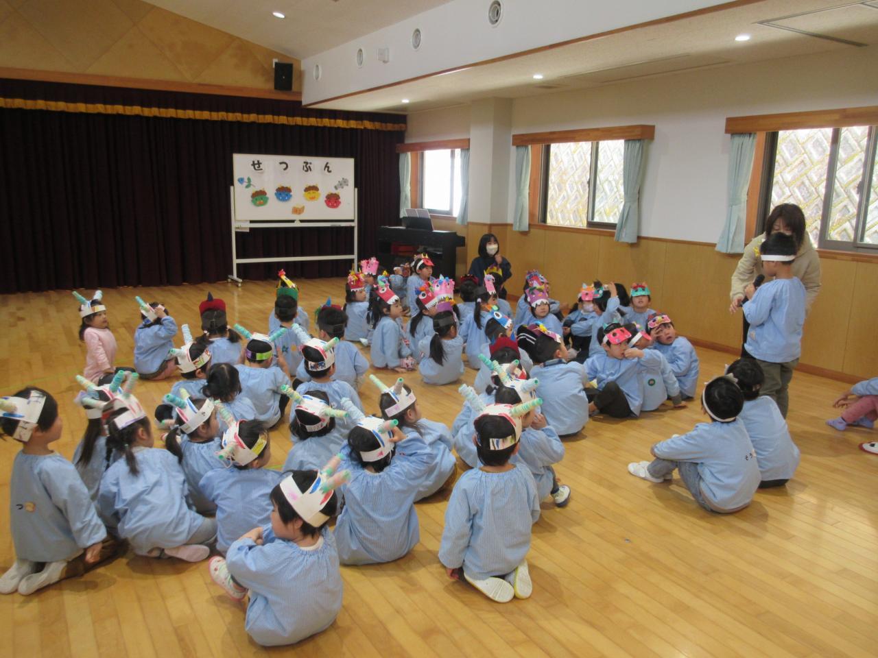 遊戯室で「おにはどこだ?」のパネルシアターを見たり、節分クイズをしたり、元気いっぱい「おにのパンツ」を踊ったりして楽しみました😄