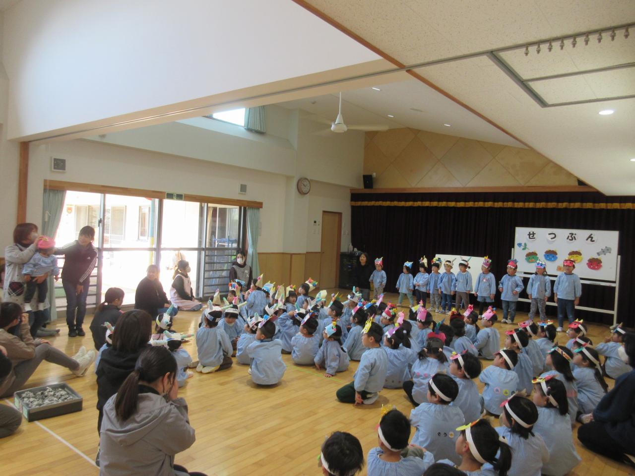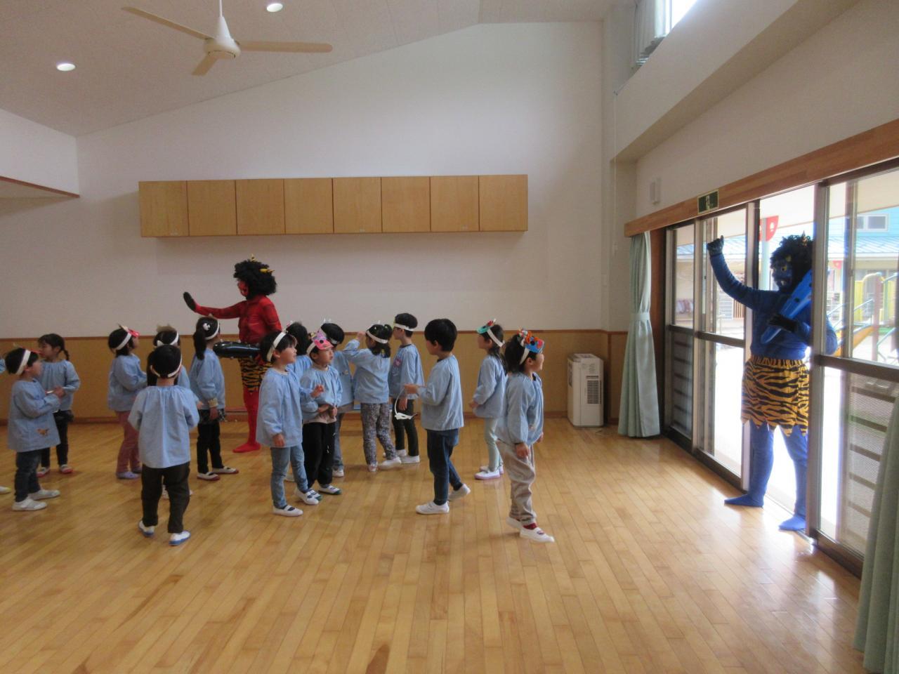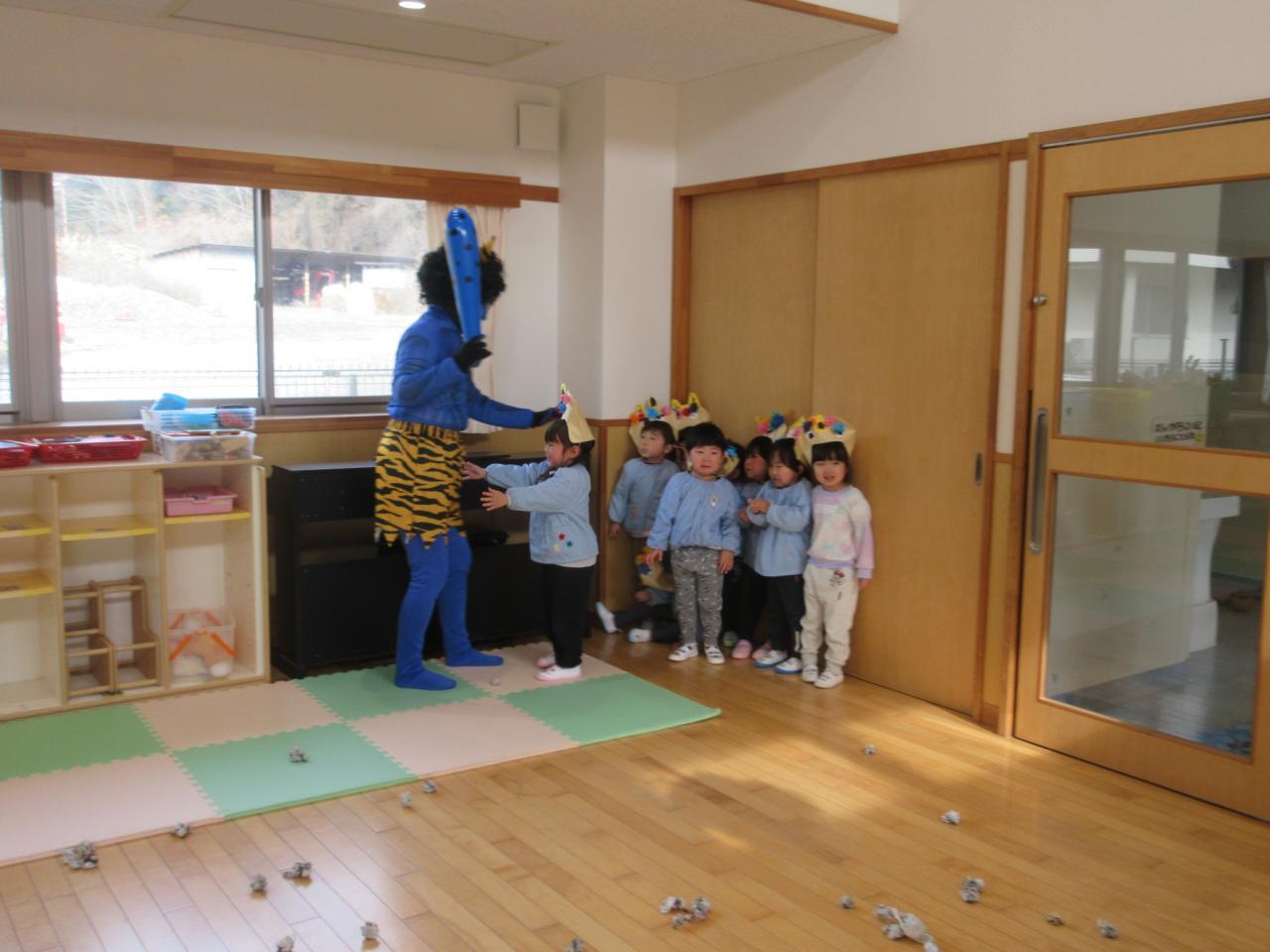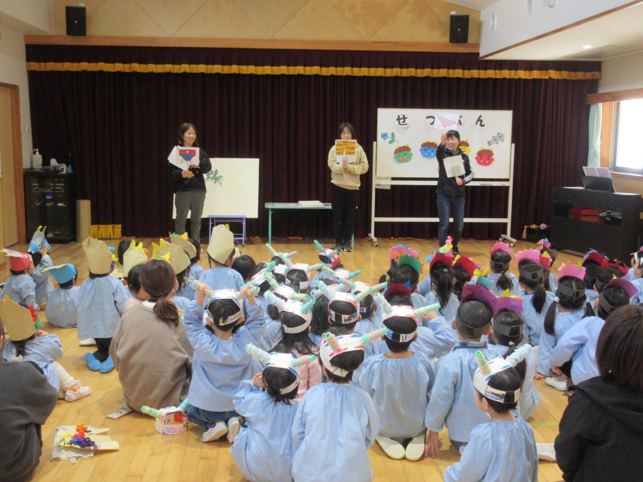 遊戯室で「おにはどこだ?」のパネルシアターを見たり、節分クイズをしたり、元気いっぱい「おにのパンツ」を踊ったりして楽しみました😄