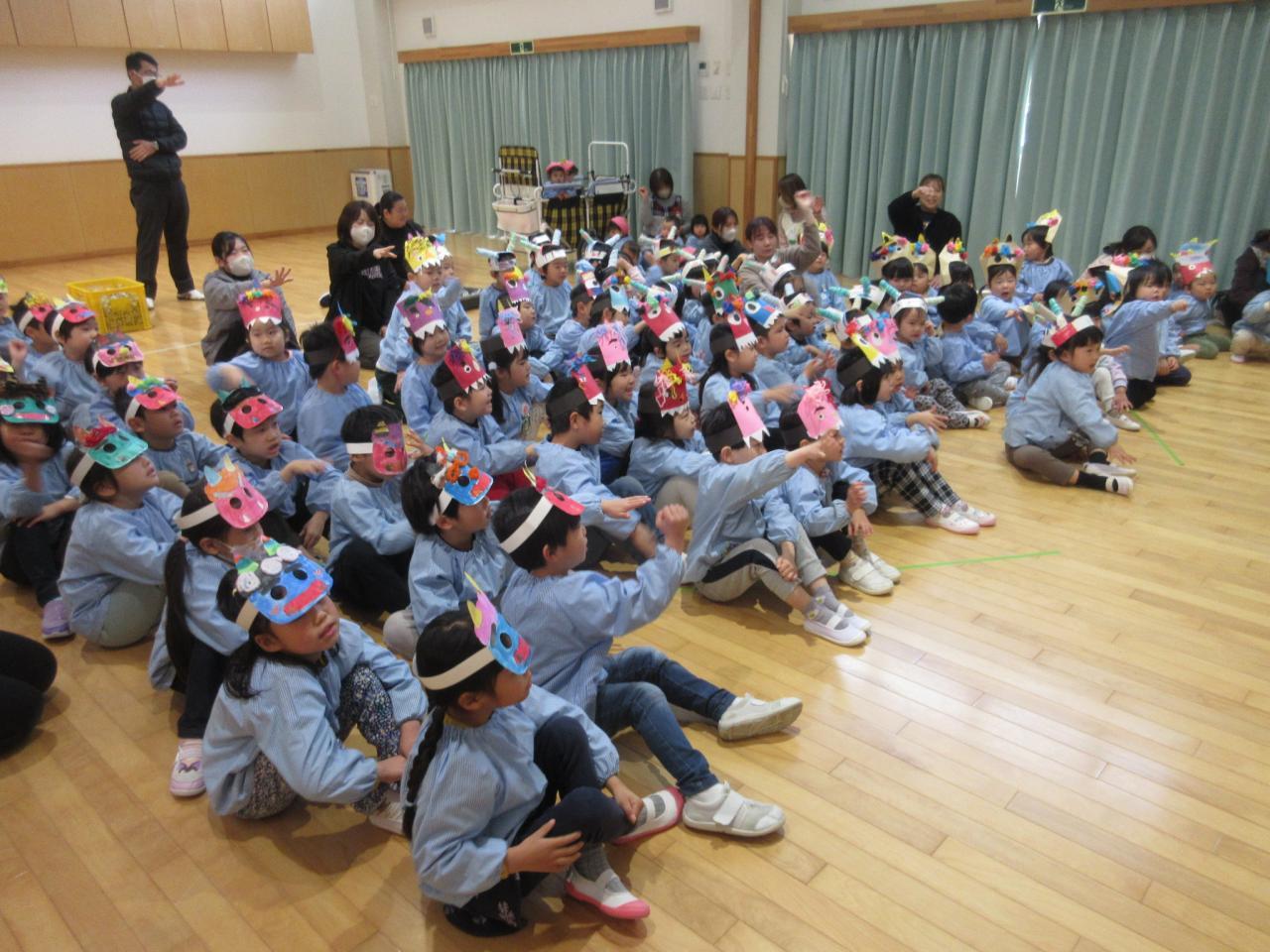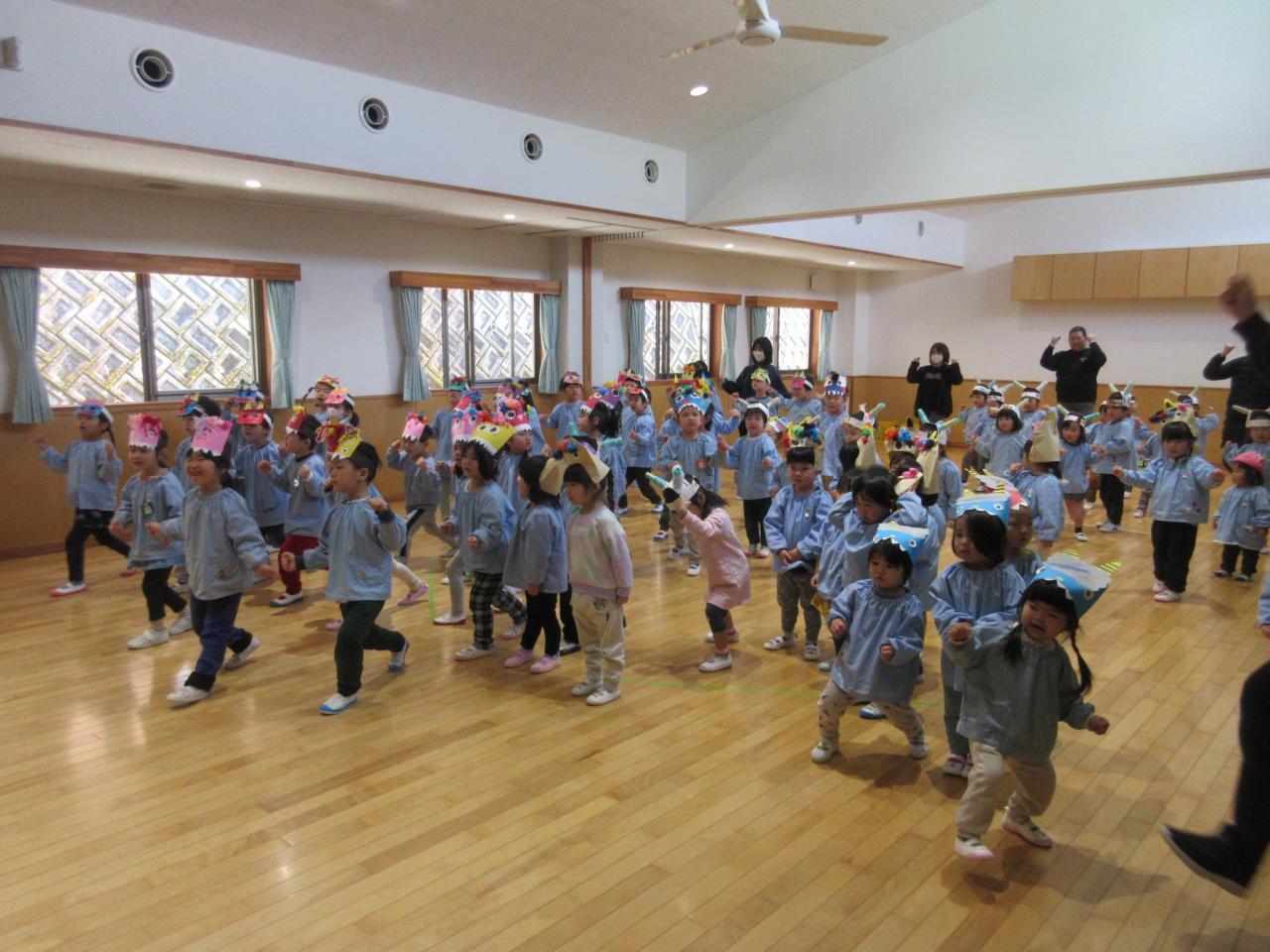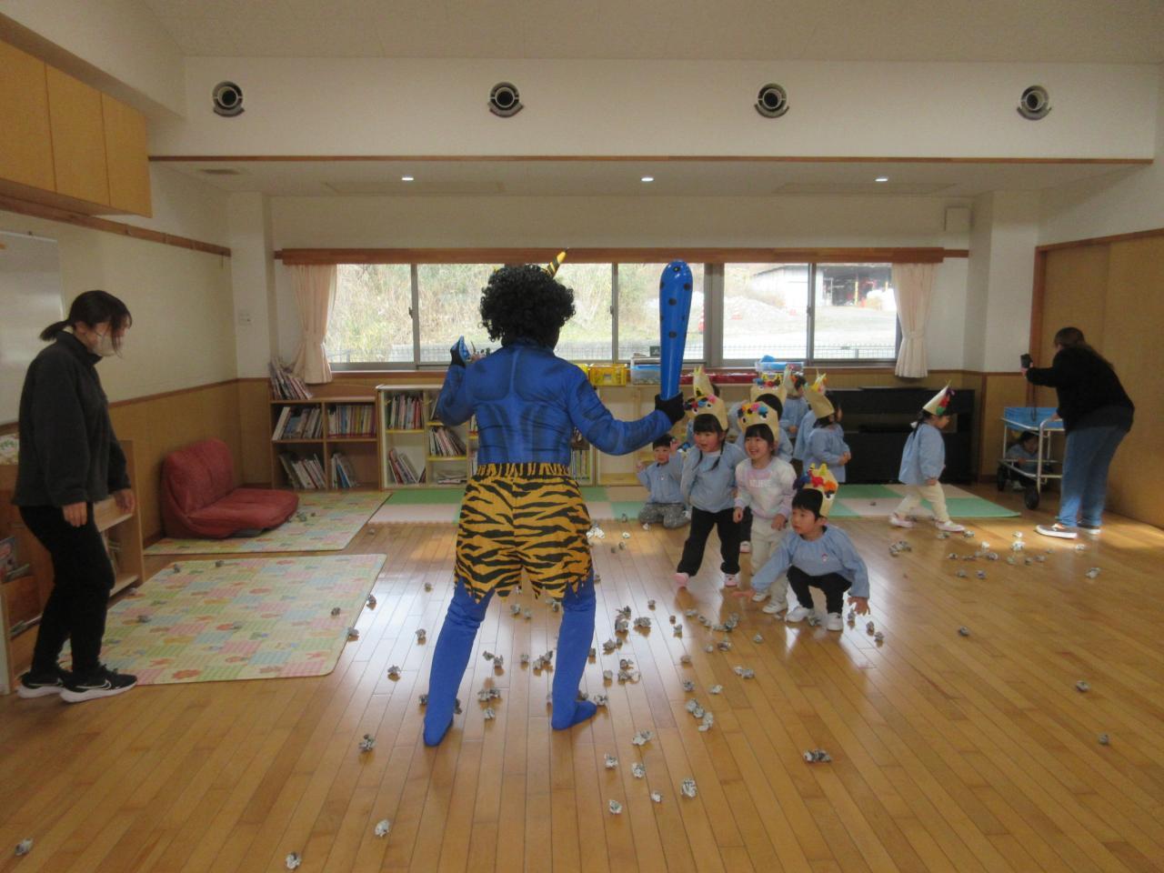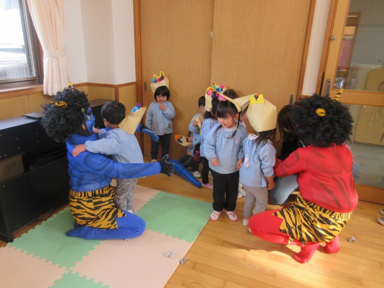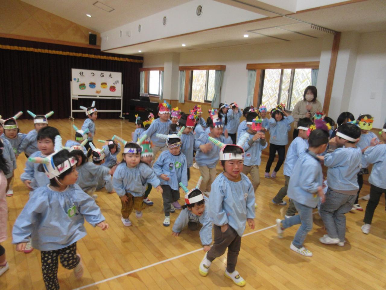 遊戯室で「おにはどこだ?」のパネルシアターを見たり、節分クイズをしたり、元気いっぱい「おにのパンツ」を踊ったりして楽しみました😄