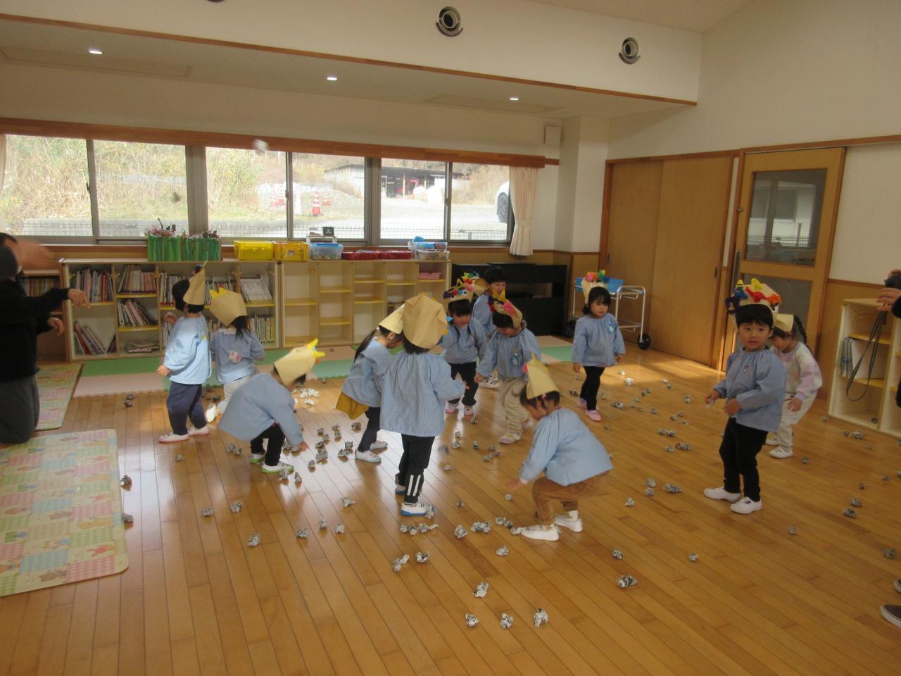 その後0~2歳児は各クラスで、3~5歳児は遊戯室で豆まきをして、心の中のオニをやっつけましたよ✨