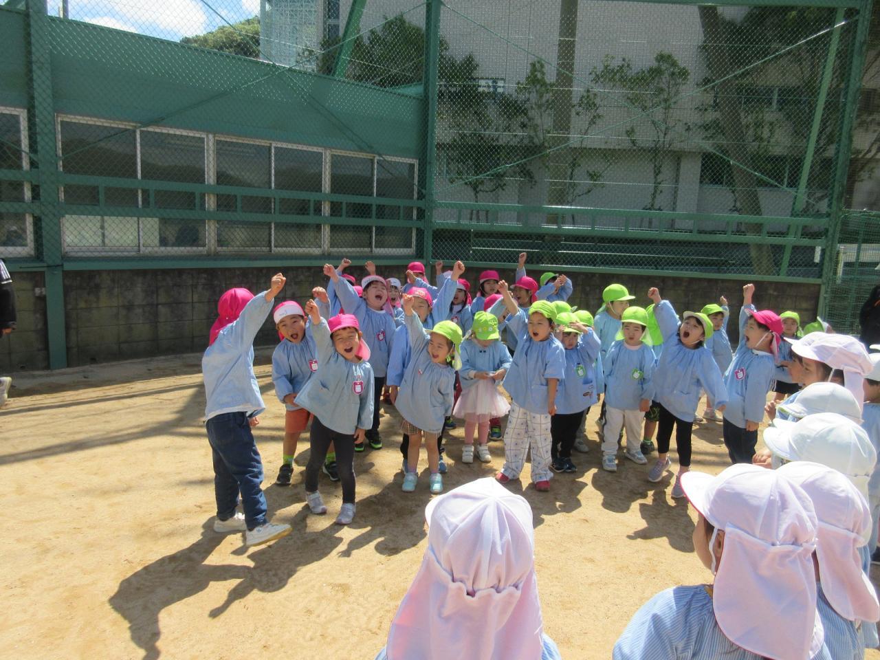 4歳児と5歳児が手をつないで、黒田庄町民グランドまで歩いていきました😄