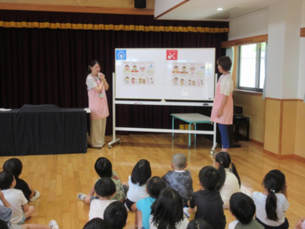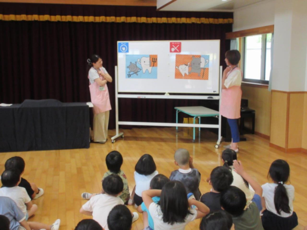 今日は歯科衛生士さんが来られ、きりん組・くま組の子どもたちの歯磨き指導がありました✨