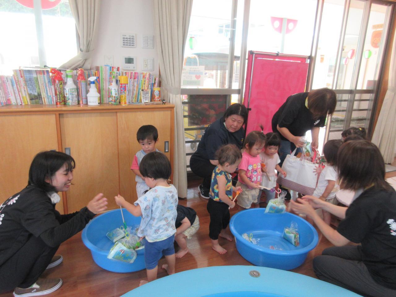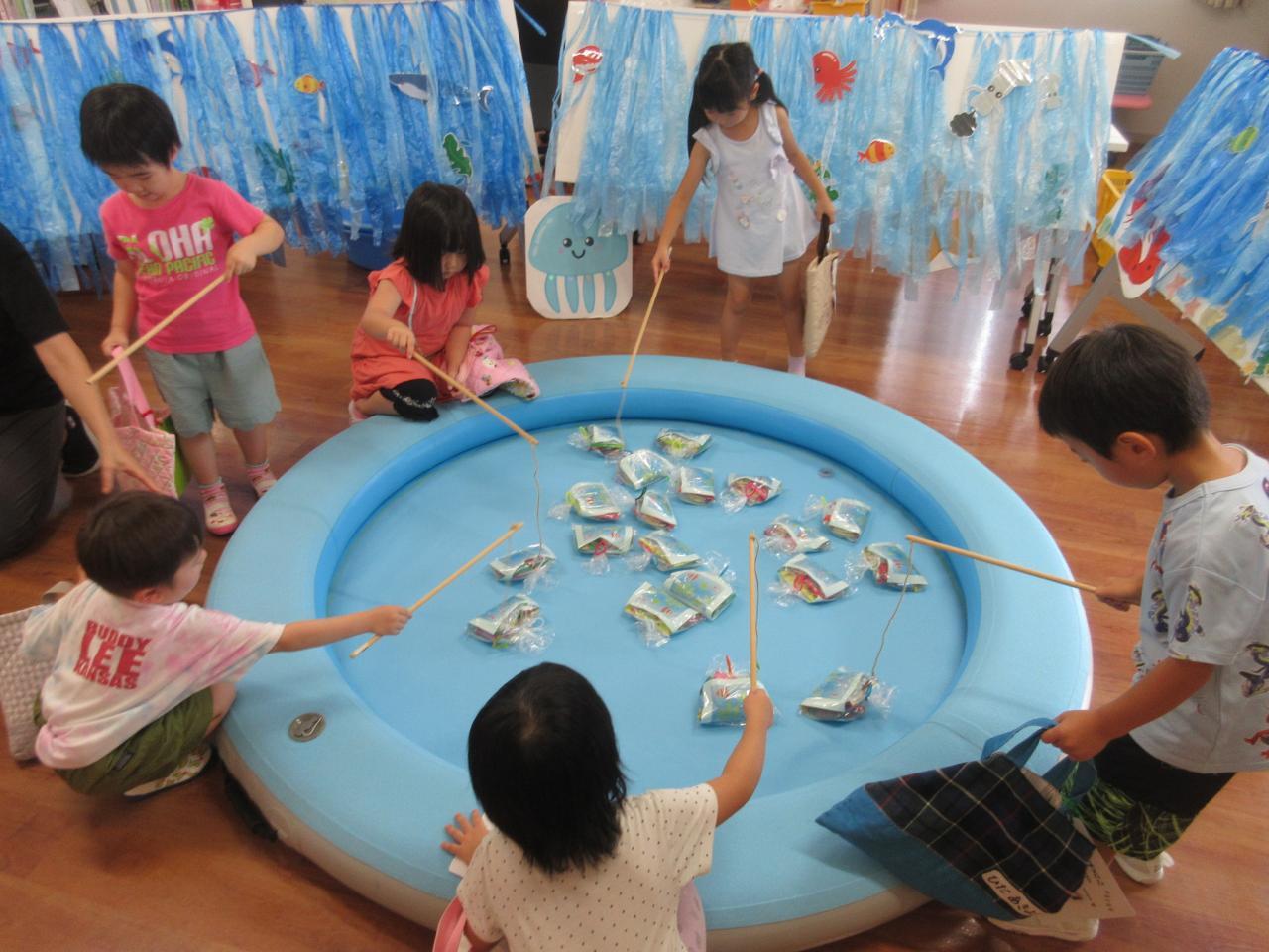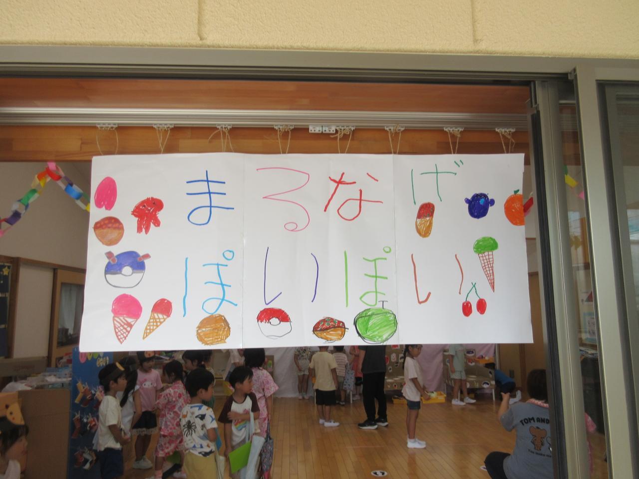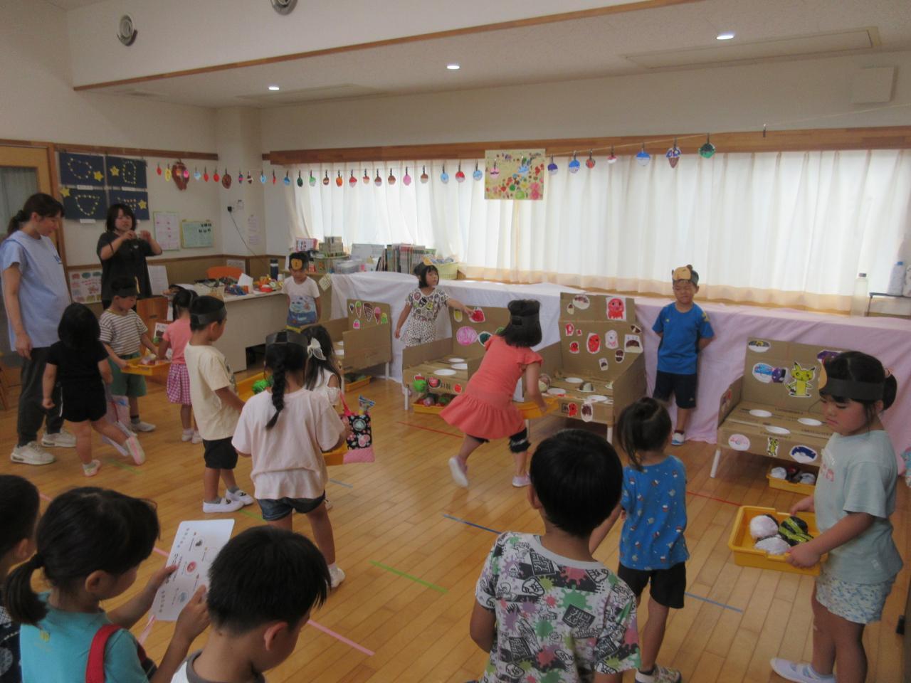 ボールすくいやボーリング、もぐらたたき、おかしつり、5歳児が考えた「まるなげ ぽいぽい」・・・いろんなお店をまわって大喜び!!遊戯室では、ボールプールやサーキットなど体を動かして遊ぶコーナーもあり、子どもたちの楽しそうな笑顔や歓声を聞いて、私たちも嬉しくなった夏まつりになりました✨