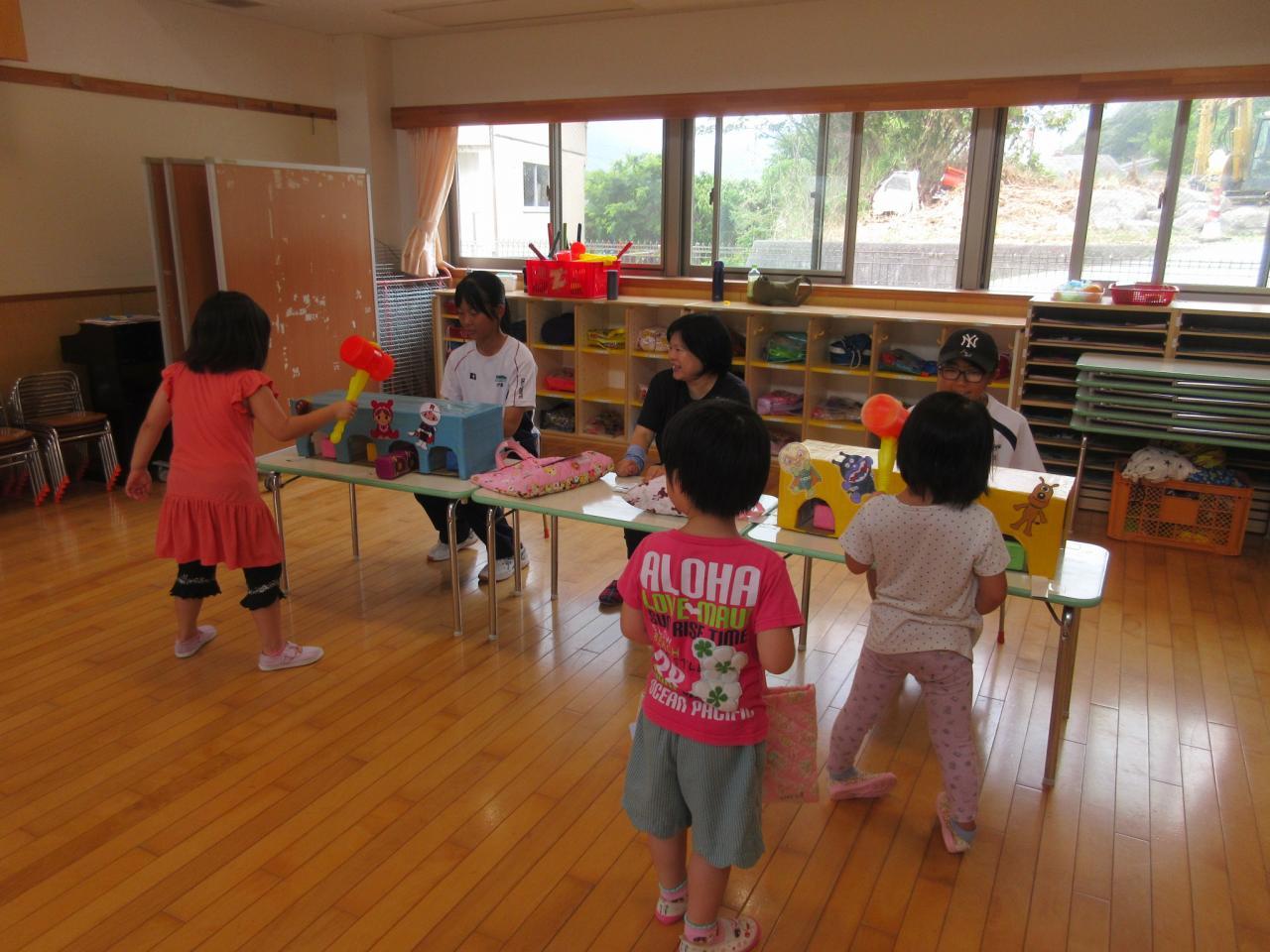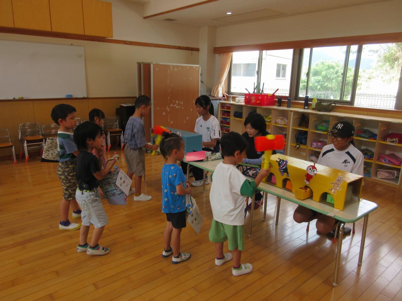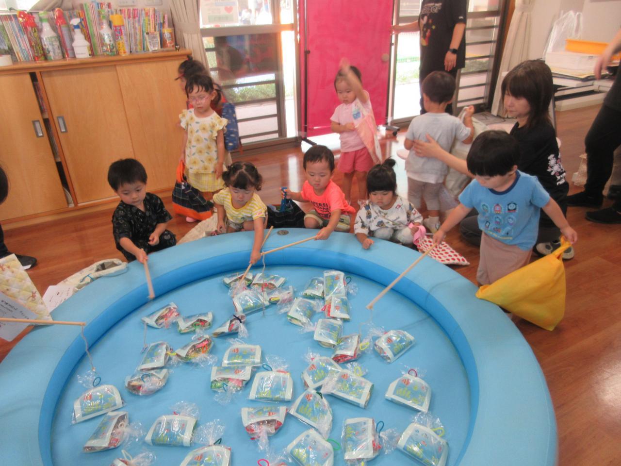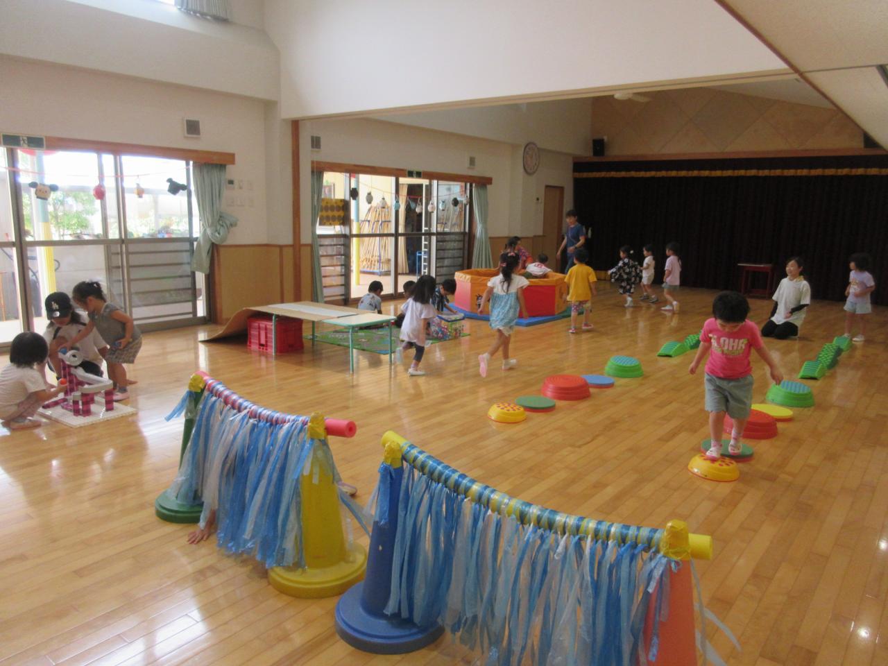ボールすくいやボーリング、もぐらたたき、おかしつり、5歳児が考えた「まるなげ ぽいぽい」・・・いろんなお店をまわって大喜び!!遊戯室では、ボールプールやサーキットなど体を動かして遊ぶコーナーもあり、子どもたちの楽しそうな笑顔や歓声を聞いて、私たちも嬉しくなった夏まつりになりました✨