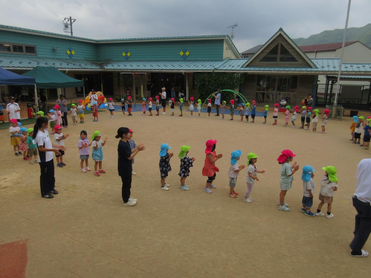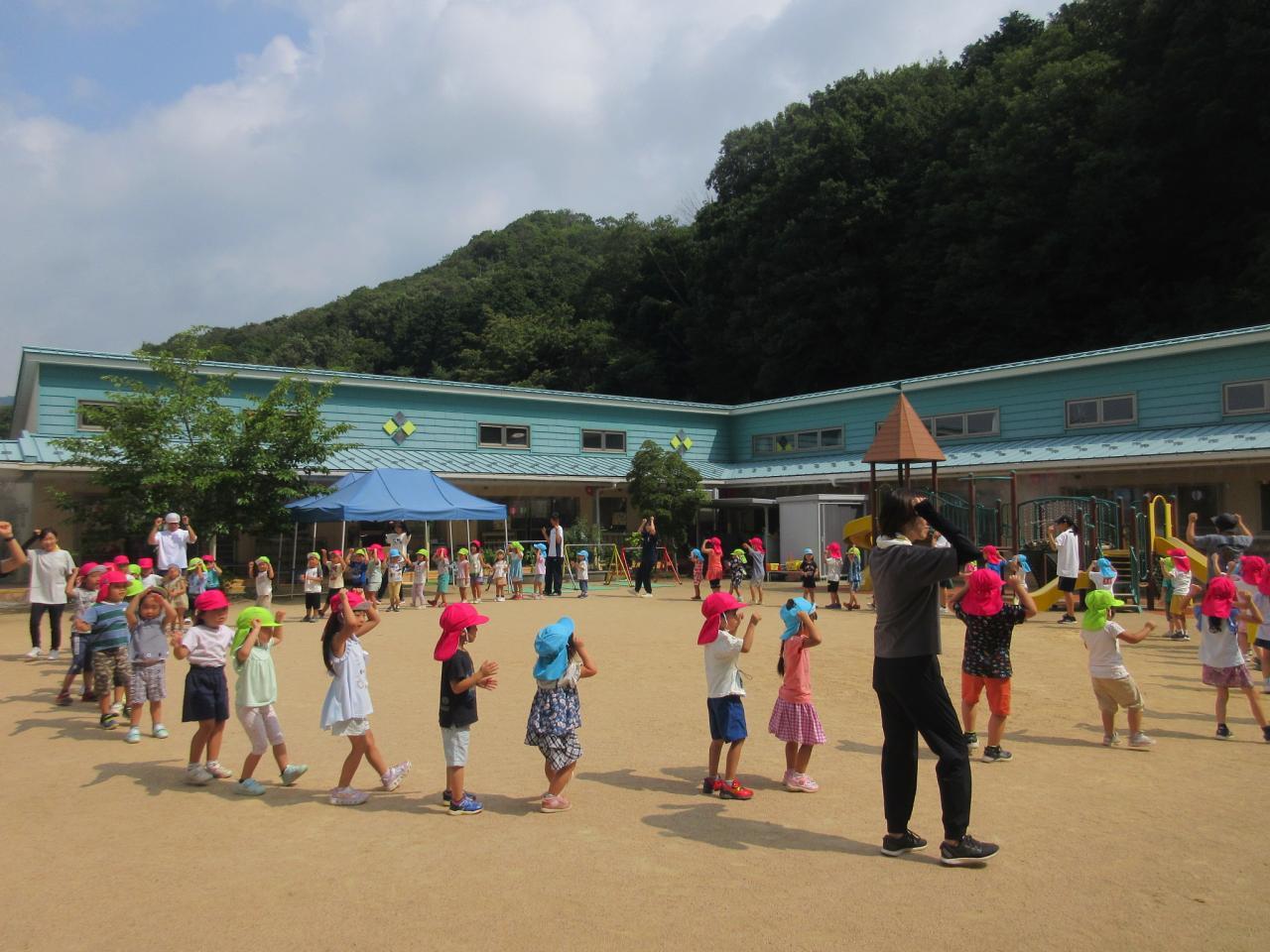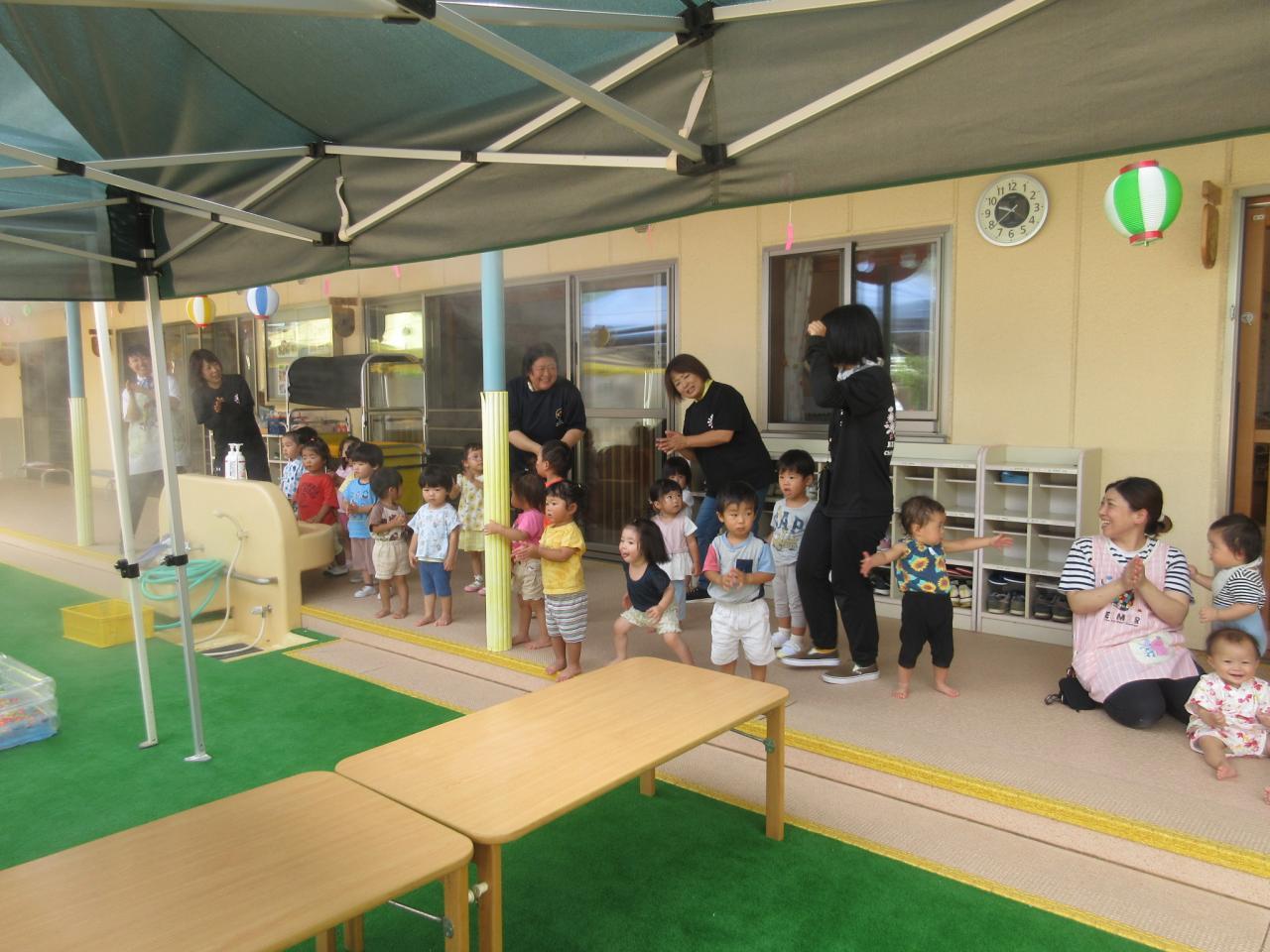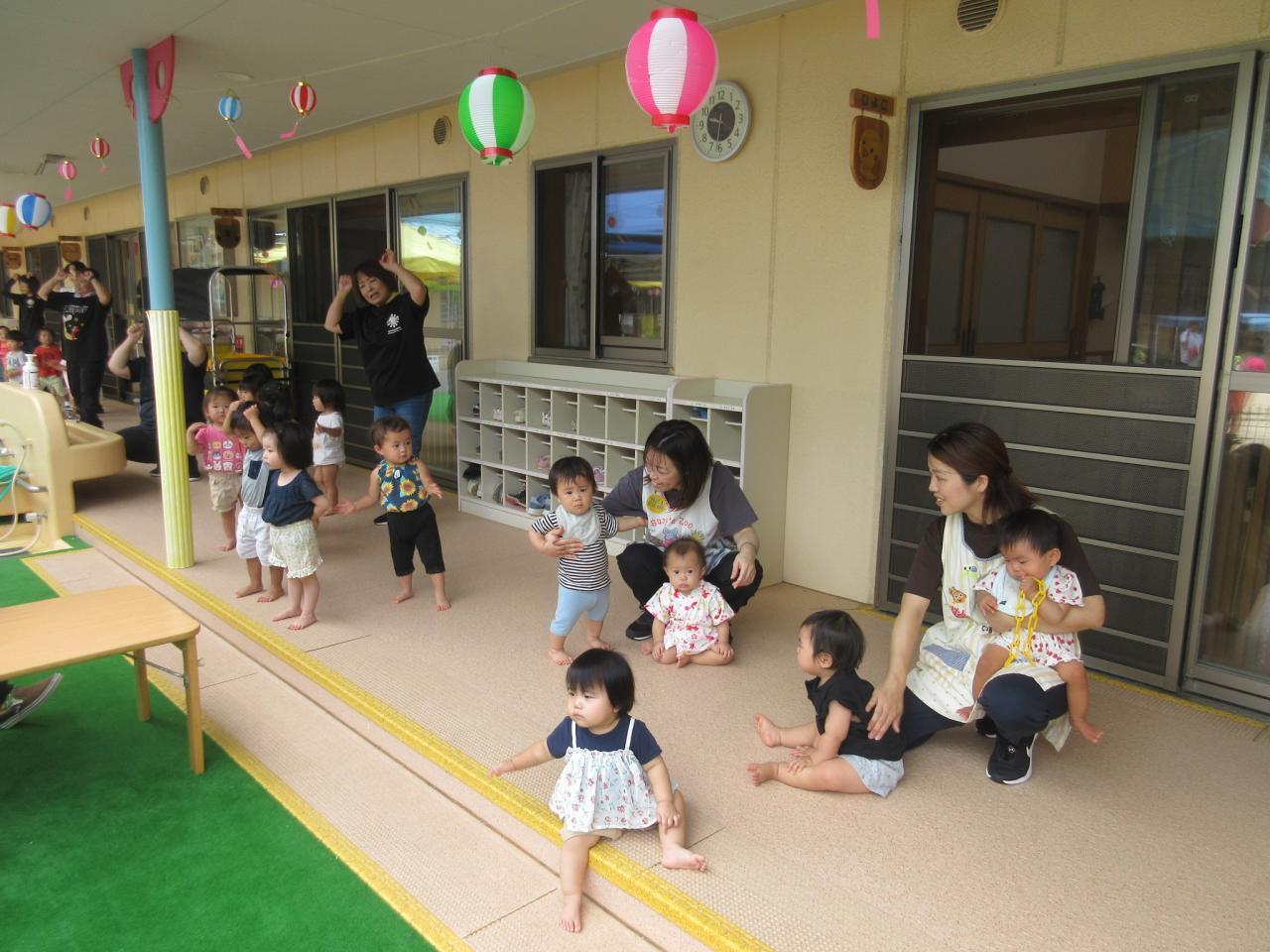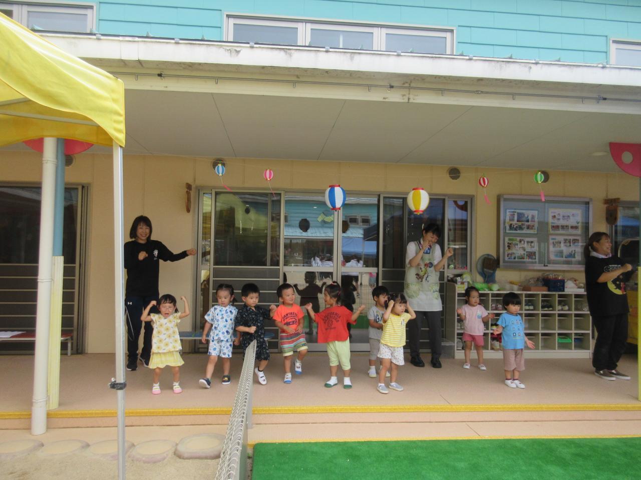 0・1・2歳児はテラスで盆踊りに参加しました😄