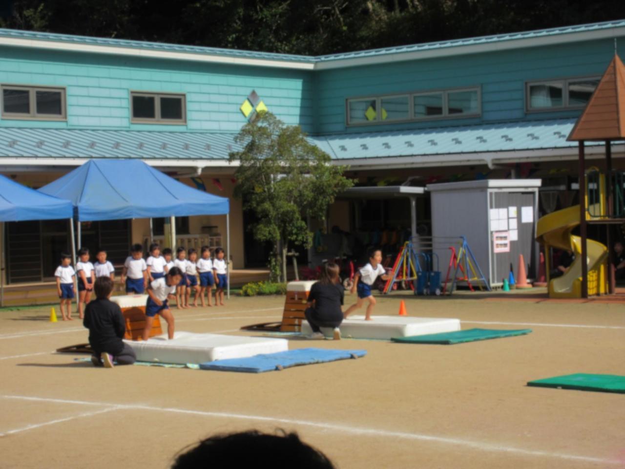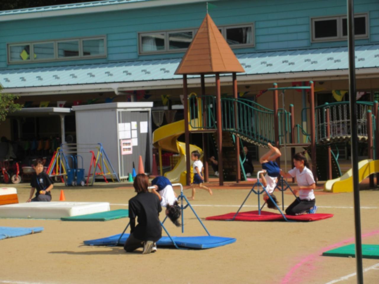 跳び箱(3段)・鉄棒(前回り)・前転にチャレンジです