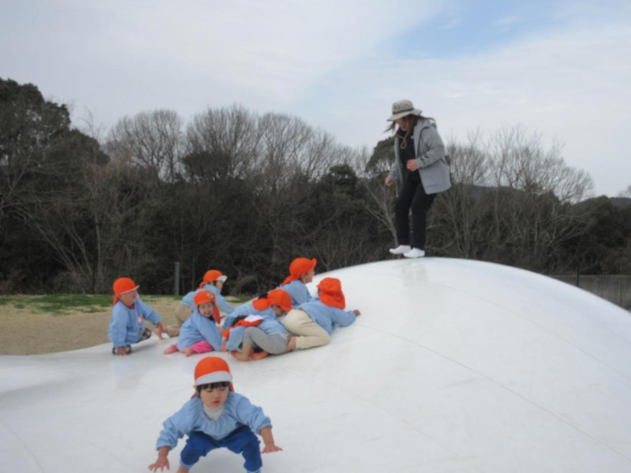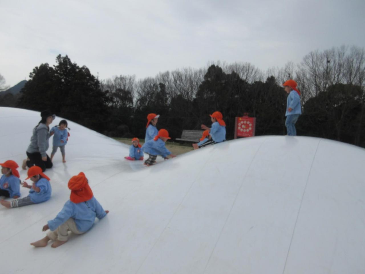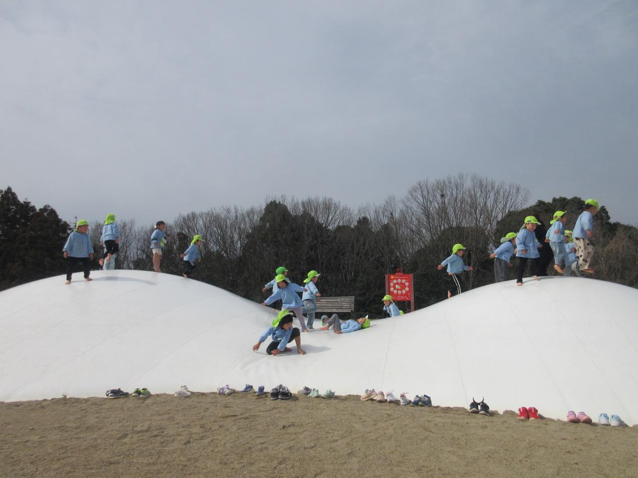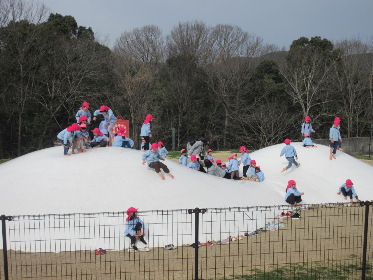 ローラー滑り台、白いふわふわトランポリン、ぶらんこ・・・汗をかくくらいよく遊んでいた子どもたちでした😄