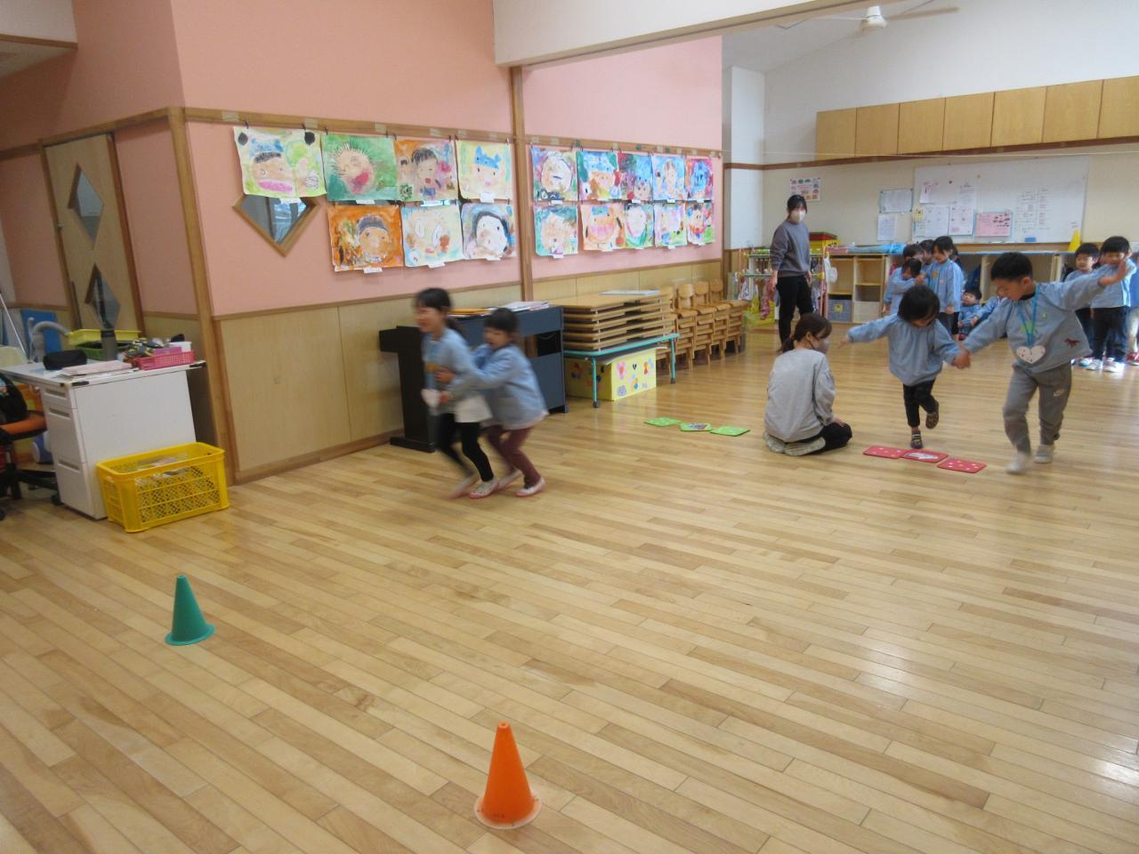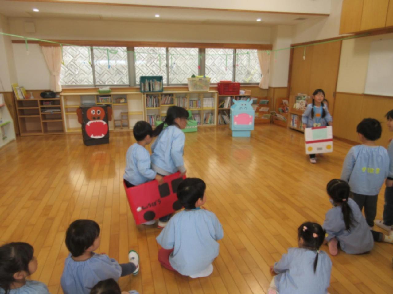 一緒に、カードに書いてある動物や乗り物になってあそんだよ