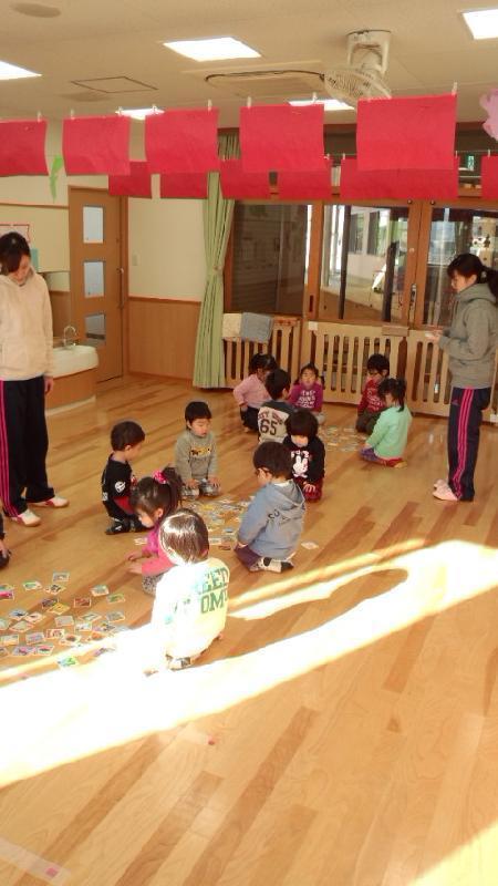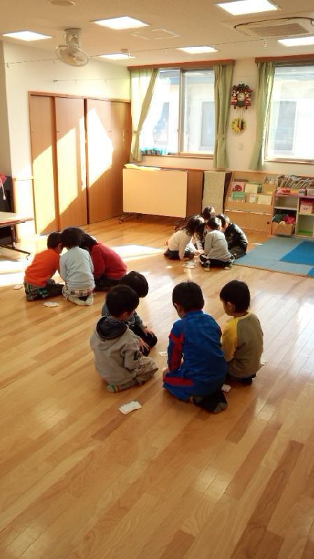 今日は、かるた大会をしました。保育園やお家で練習した成果は出せたかな?1枚しか取れなかった子、20枚以上取れた子、枚数や順位も大切かもしれませんが、文字や絵と親しむ事が大切だと思います。かるたを通して日本の文化、言葉、日本語に興味を持ってもらえたらと思います。就学前は、覚える事よりもいろんな事に興味を持つ事が大切な時期だと考えています。興味が探究心につながり学習意欲へと繋がると思っております。かるた大会に向けて練習した事、お友だちと競争した事は、必ず子ども達の財産になっています。今日は、帰ったらかるた大会の事を話して、また時間があれば一緒にかるたをしてあげて下さい。