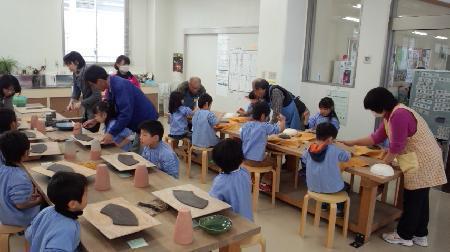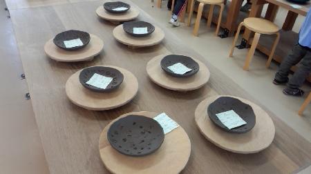 今日は、陶芸をしてきました。それぞれお皿とコップを作りました。粘土を型にあて叩いたり、指で延ばしたりして形を整え、スタンプで星や花や動物などのデザインを付け、最後に釉薬の色を決めて完成です。