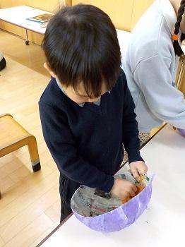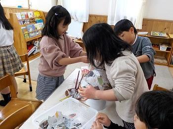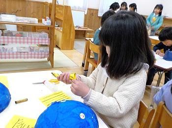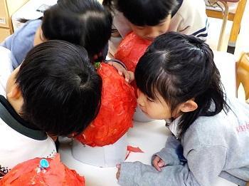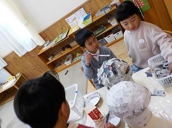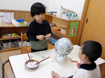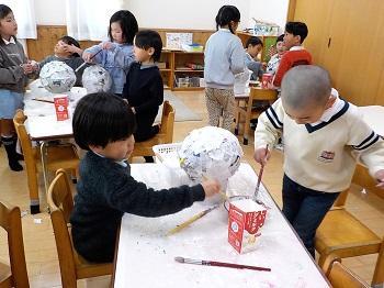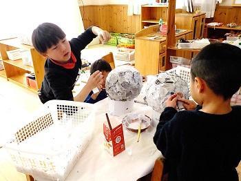 新聞紙・半紙をちぎって 風船に貼っていく